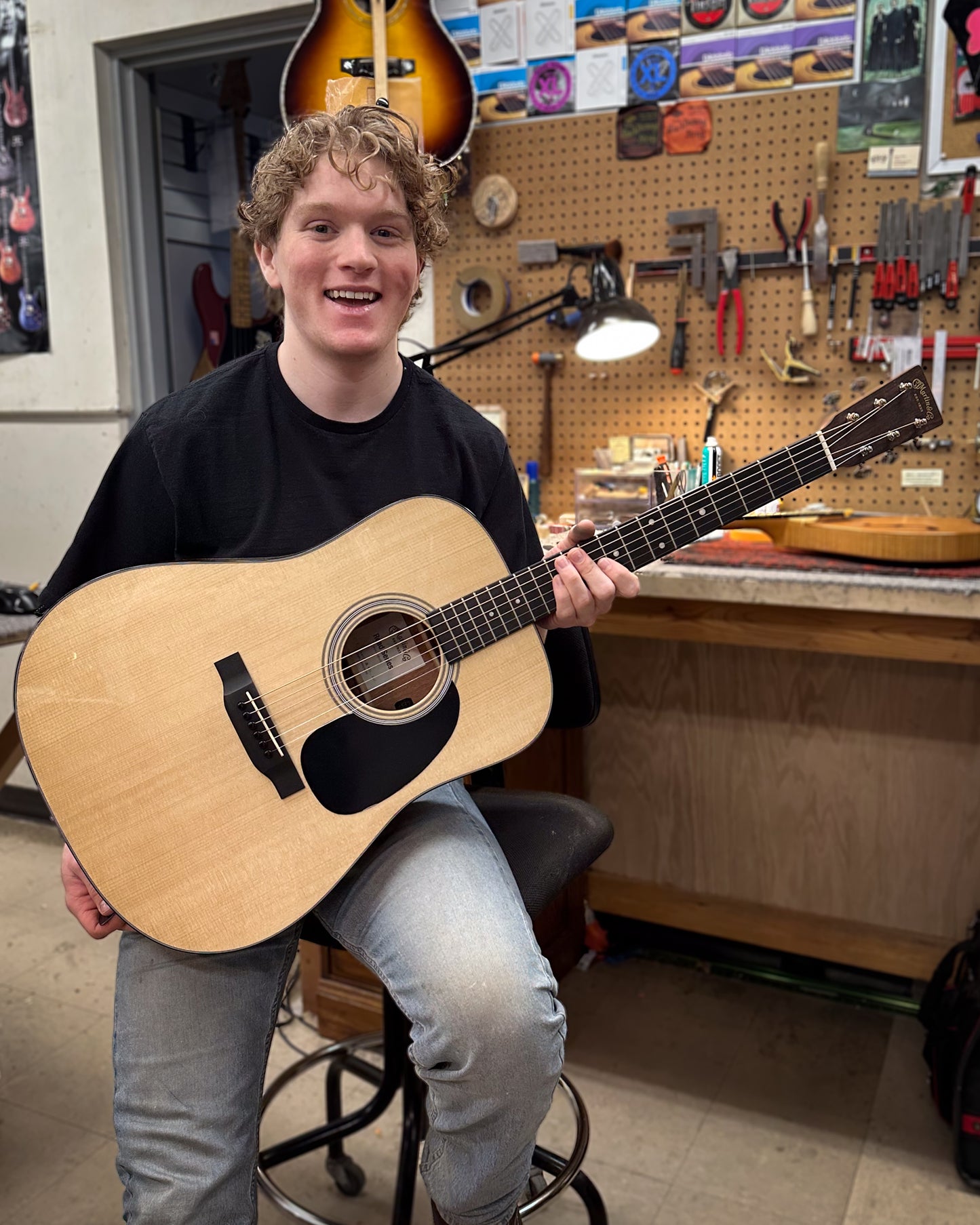 Built to handle the rigors of the road, the D-12E has a dreadnought-size body with a solid Sitka spruce top and solid sapele back and sides. It’s equipped with a Fishman MX-T pickup, which has a discreet tuner in the soundhole that mutes the output when activated. Appointments include a Style 28 multi-stripe rosette, faux tortoise pickguard, black binding, and full gloss body finish.