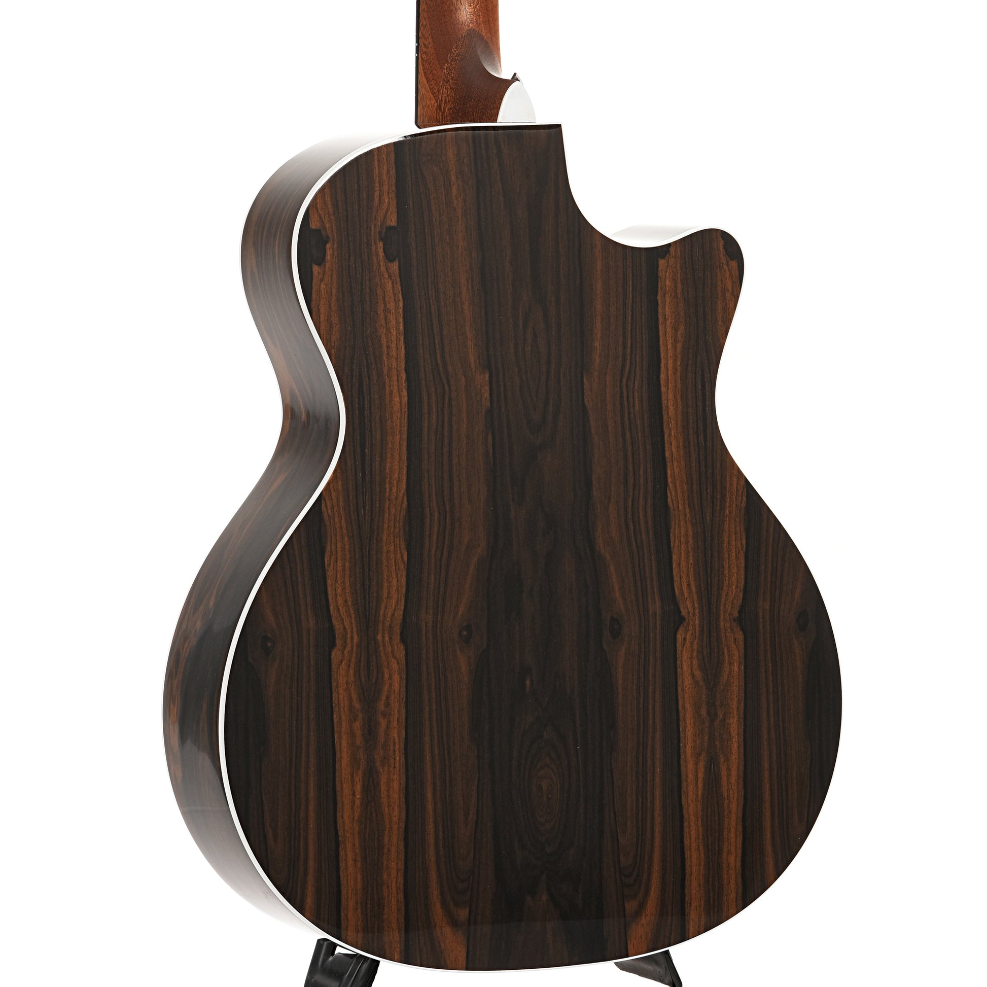 Lefthanded. Gorgeous fine veneer sandwiches African mahogany tonewood with beautiful, exotic ziricote for the rare tonewood look at a more affordable price. With a solid spruce top, this Grand Performance Cutaway provides great tone and easy upper-fret access. The Fishman MX-T pickup has a tuner mounted in the soundhole plus volume & tone controls.