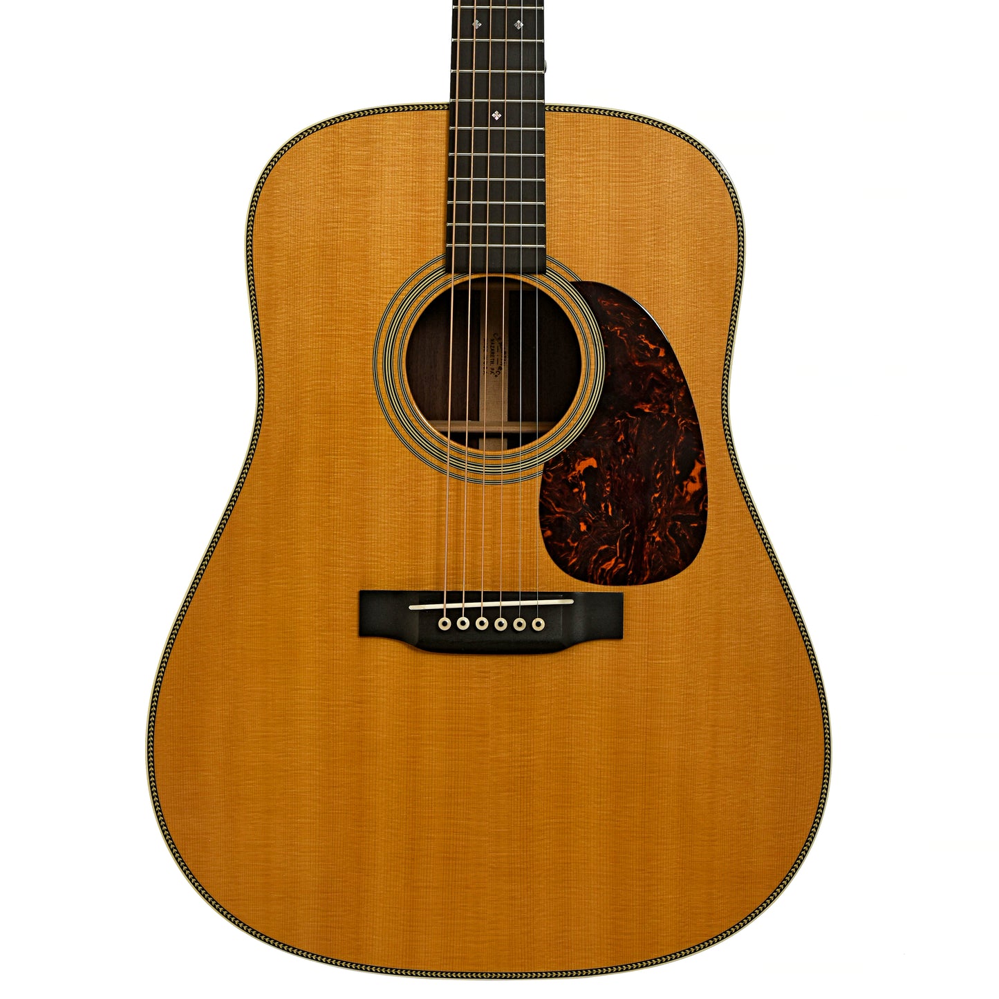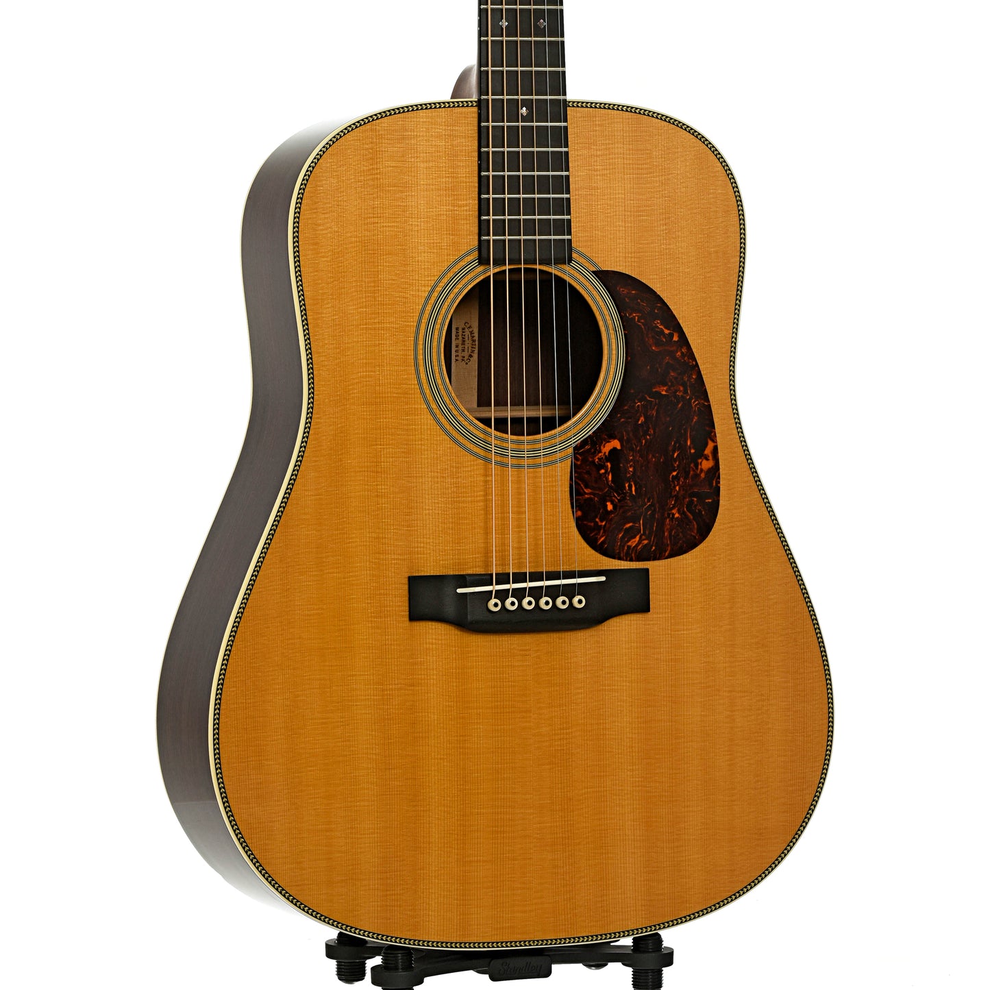 This HD-28V features a solid spruce top and rosewood back and sides. It has a forward-shifted X-brace, a ebony fingerboard and bridge with long saddle, and a Modified "V" neck profile. Classic appointments include herringbone top purfling, a tortoise plastic pickguard, and open-gear tuners. Original Geib-style hard shell case. Made in USA.