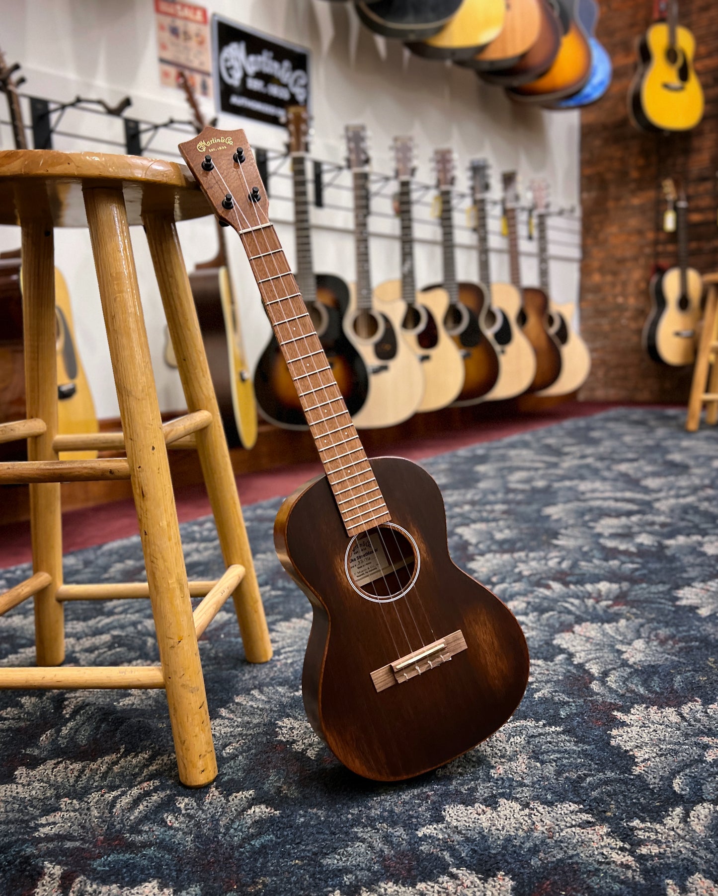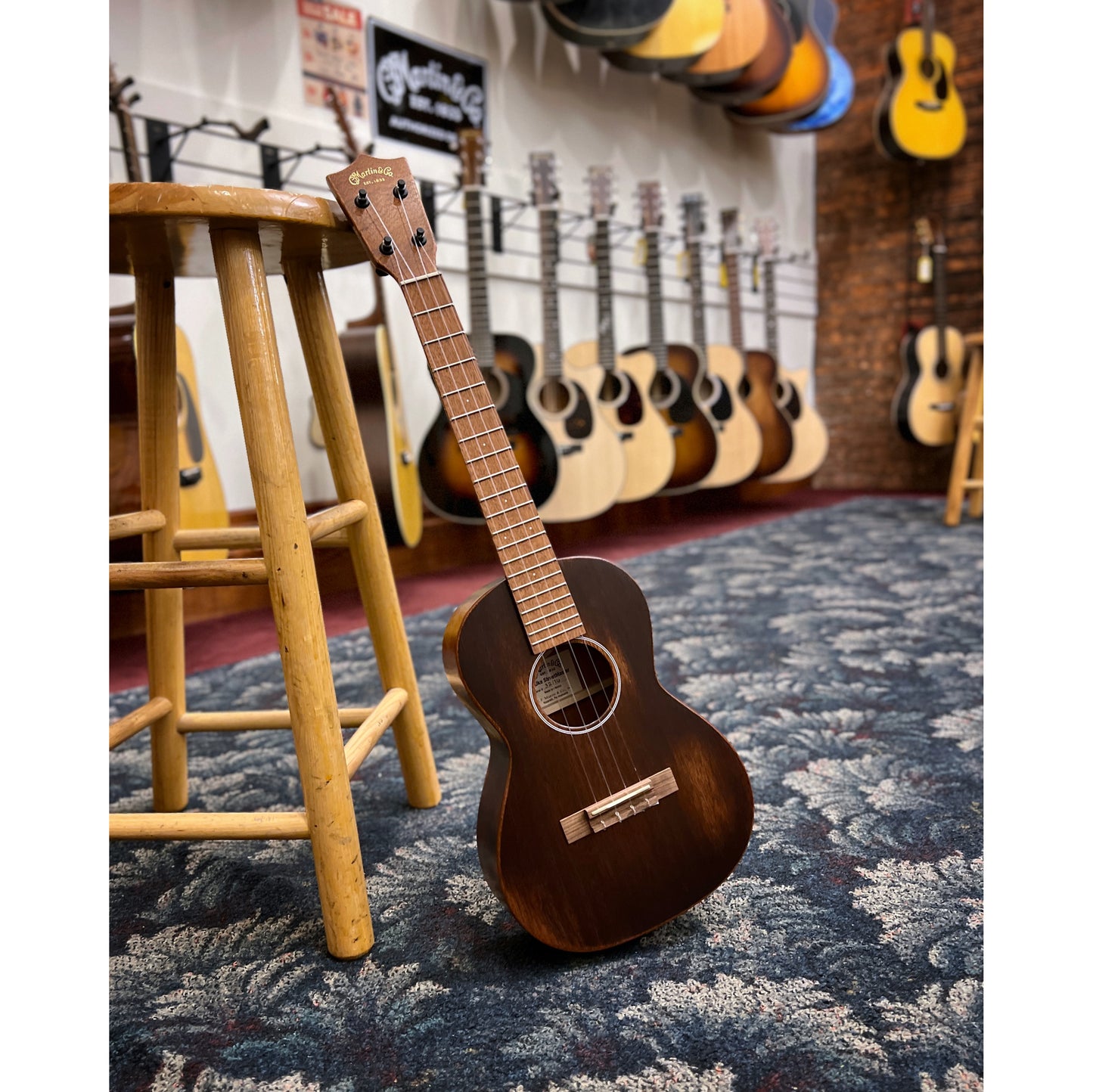 Martin's newest tenor ukulele is built of all mahogany for a great sound with a "Streetmaster" finish for a well-loved look. The geared tuning pegs weigh just 5 grams (!) and have a 6:1 ratio for smooth tuning.