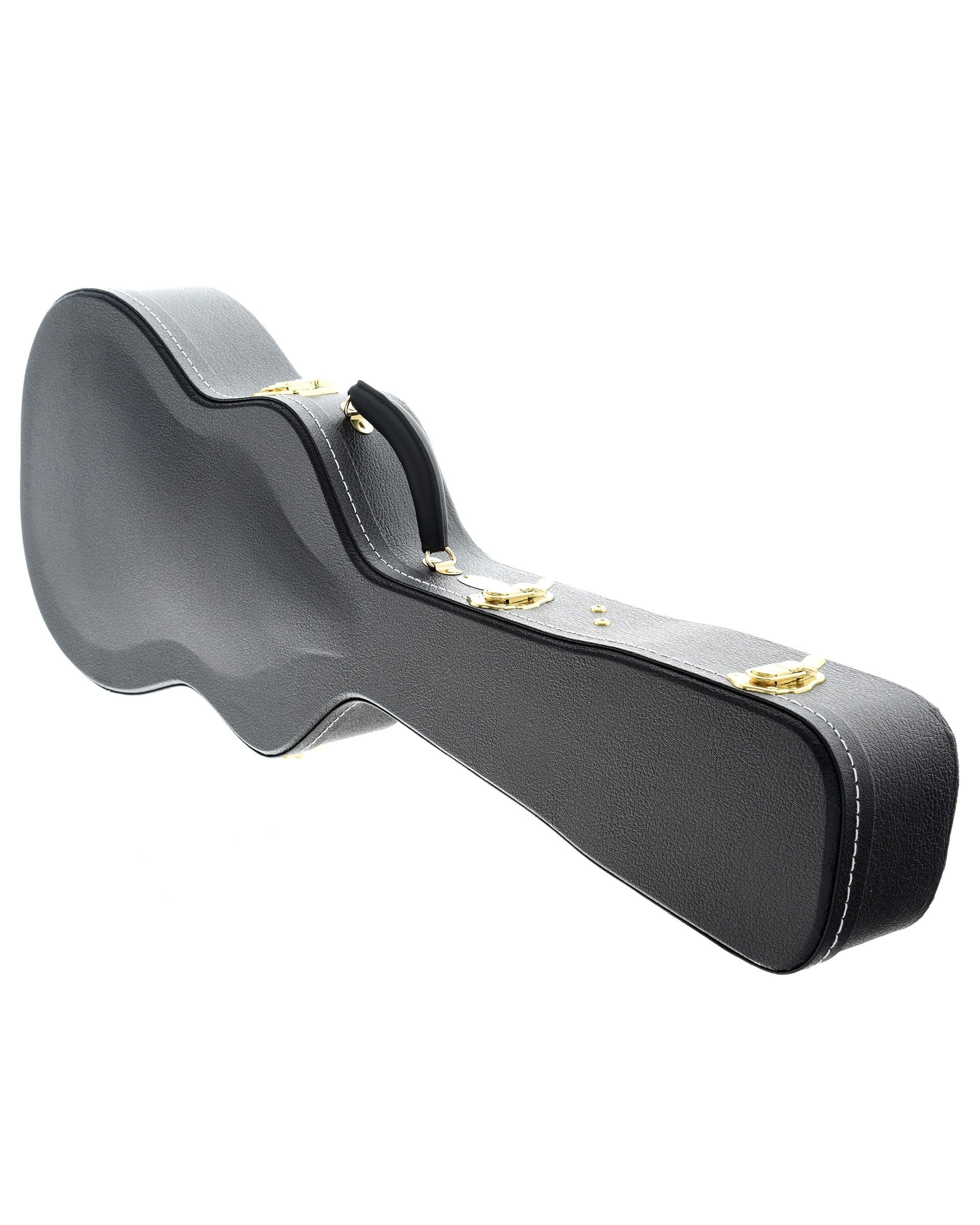 Heavy duty Geib-style hardshell case that fits 12-fret and 14-fret 0-size guitars. Archtop wooden case with black vinyl covering and soft maroon (cabernet) velvet padded interior.