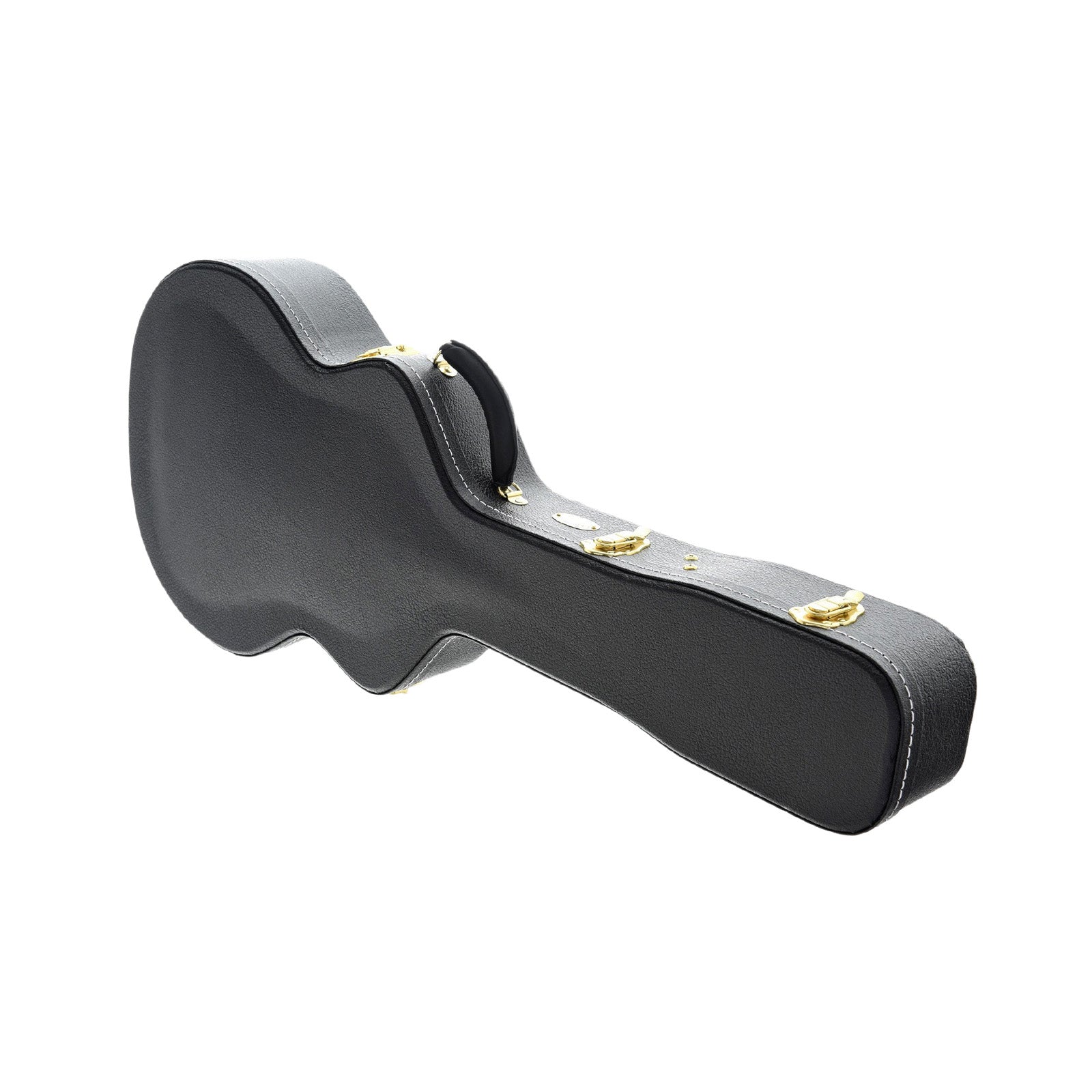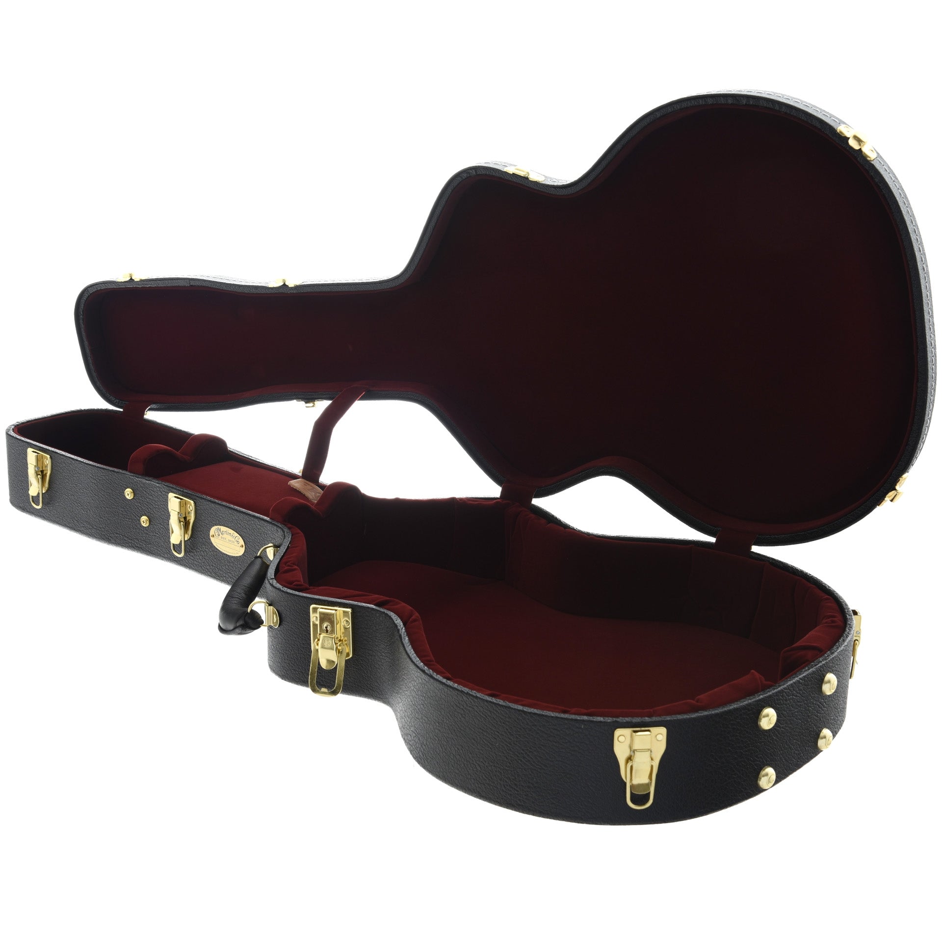 Geib-style case, as supplied with all current 0000 and M size Martin guitars. Heavy duty archtop wooden case with black vinyl covering and soft maroon velvet (cabernet) padded interior.