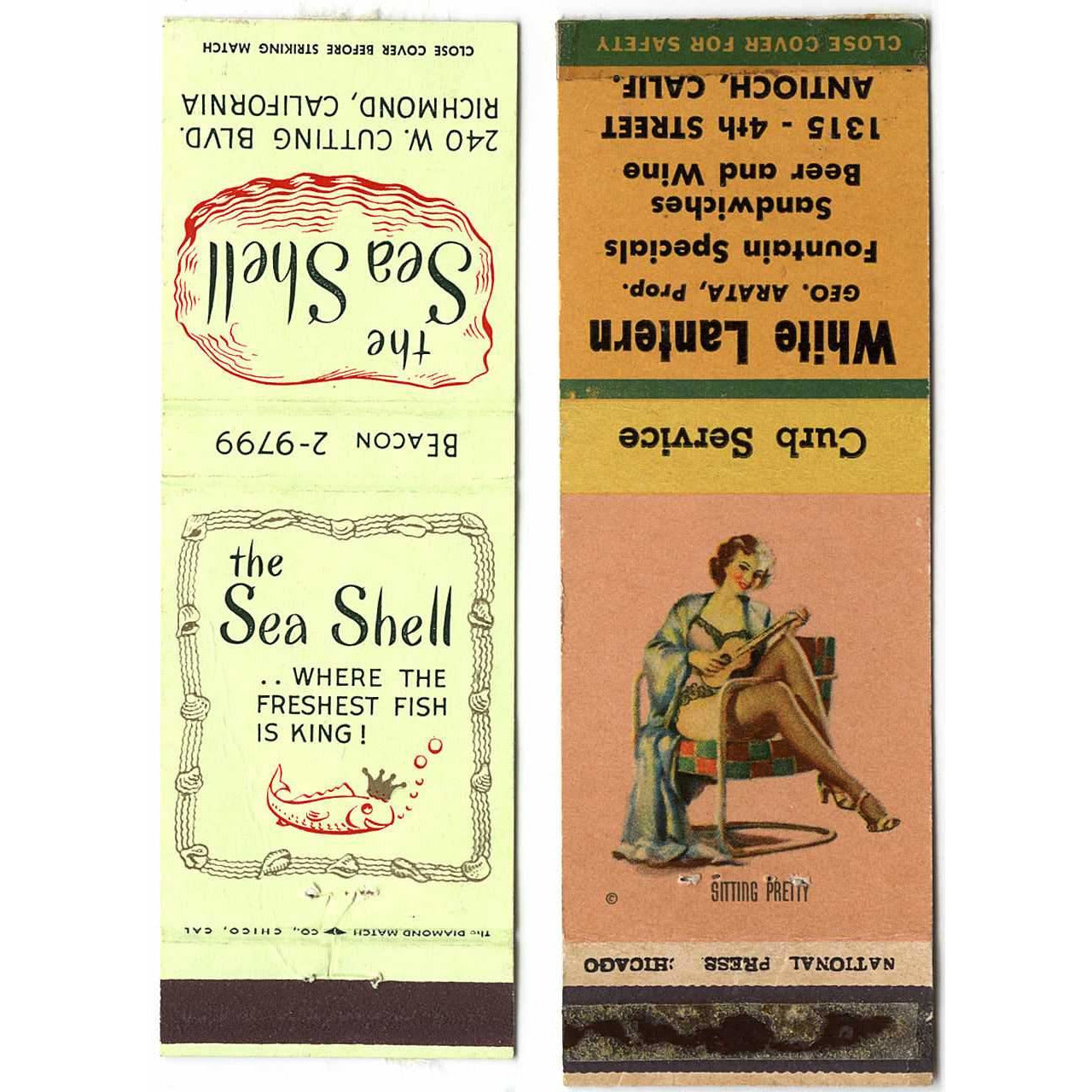 EC-, pair of (empty) vintage match covers, one with Gil Elvgren's iconic "Sitting Pretty" pinup with lingerie and ukulele from the White Lantern in Antioch, California, and another for the Sea Shell Restaurant in Richmond, California.