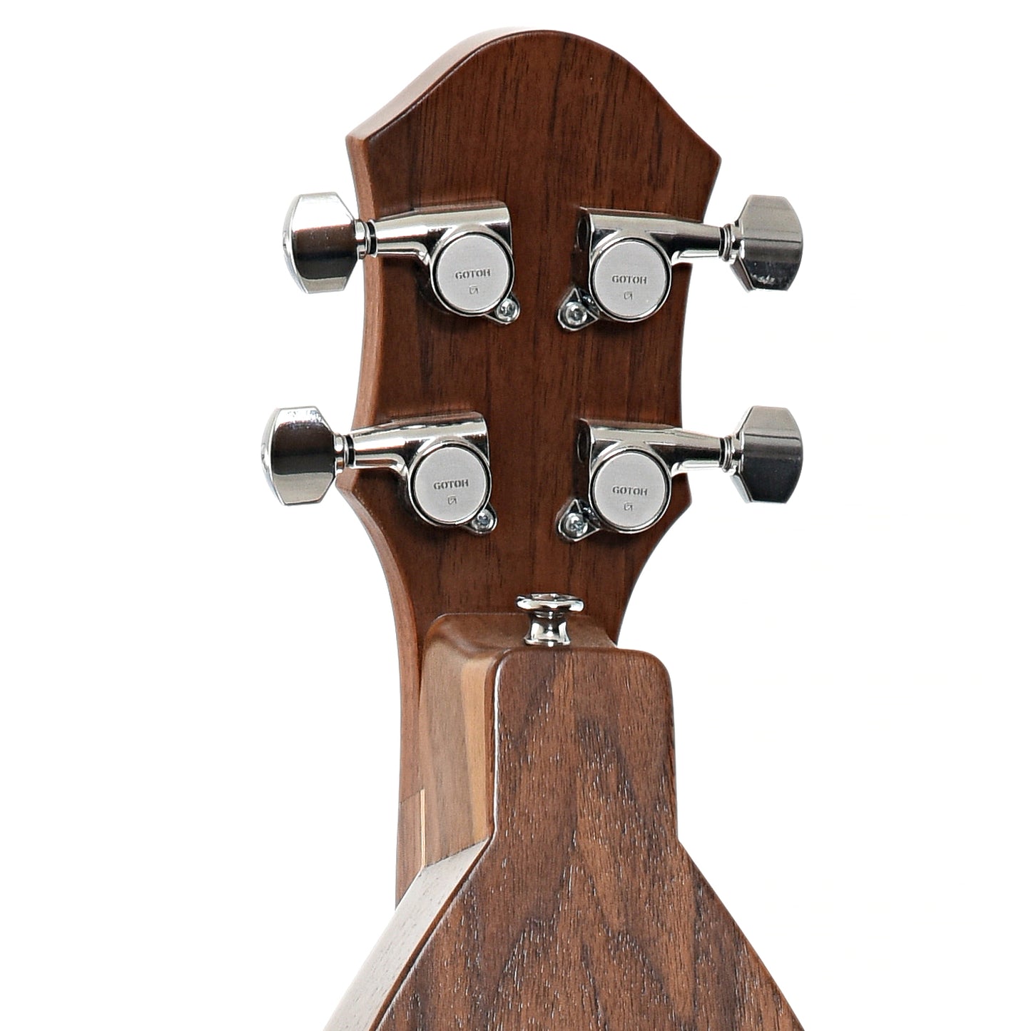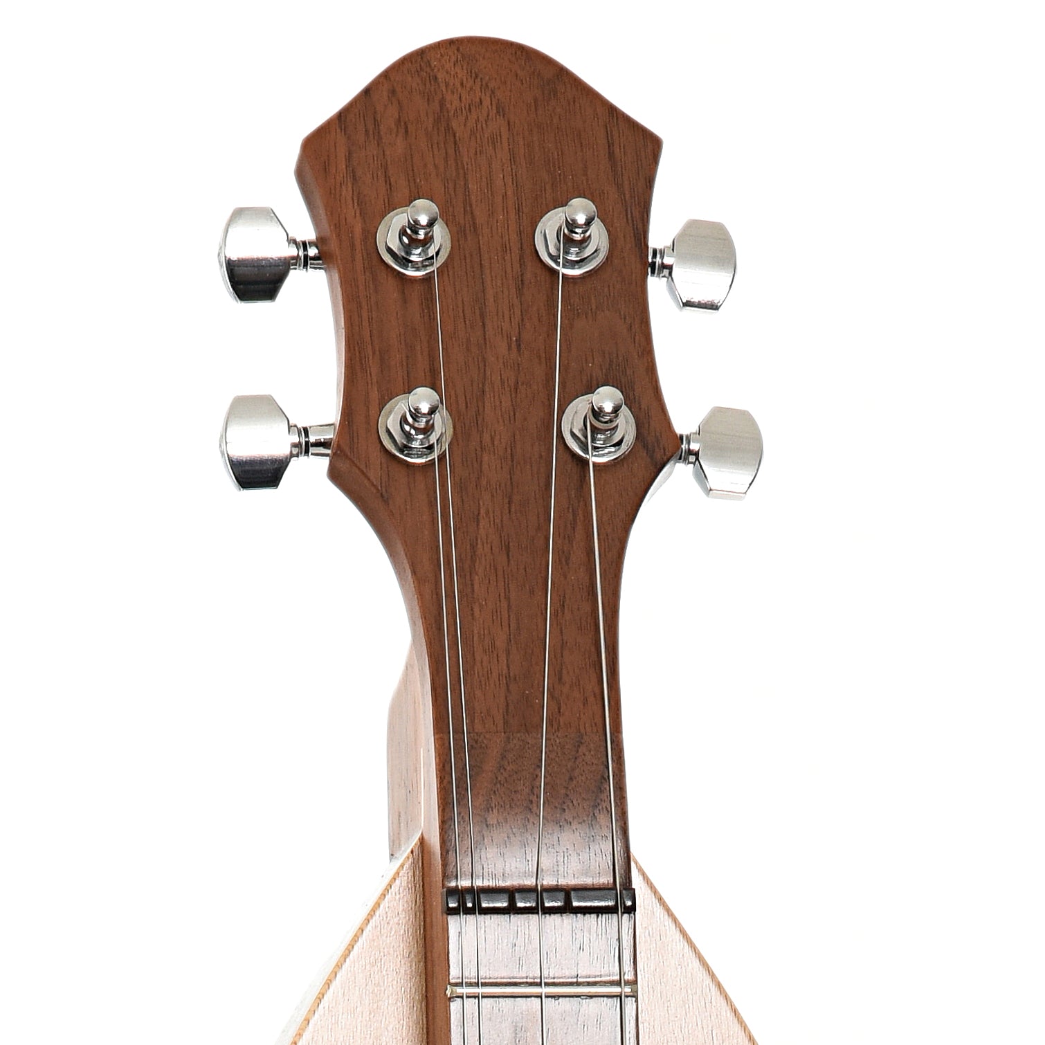 Walnut & sycamore Appalachian (lap) dulcimer. Hourglass body of all solid woods. Lovely warm tone. 4 strings, flat peghead, geared tuners and 26" scale for easy lefthand reach. For D-A-dd or D-A-AA tuning. McSpadden's well-made gigbag included. Instruction / care packet. Made in USA at Dulcimer Shoppe, Inc.