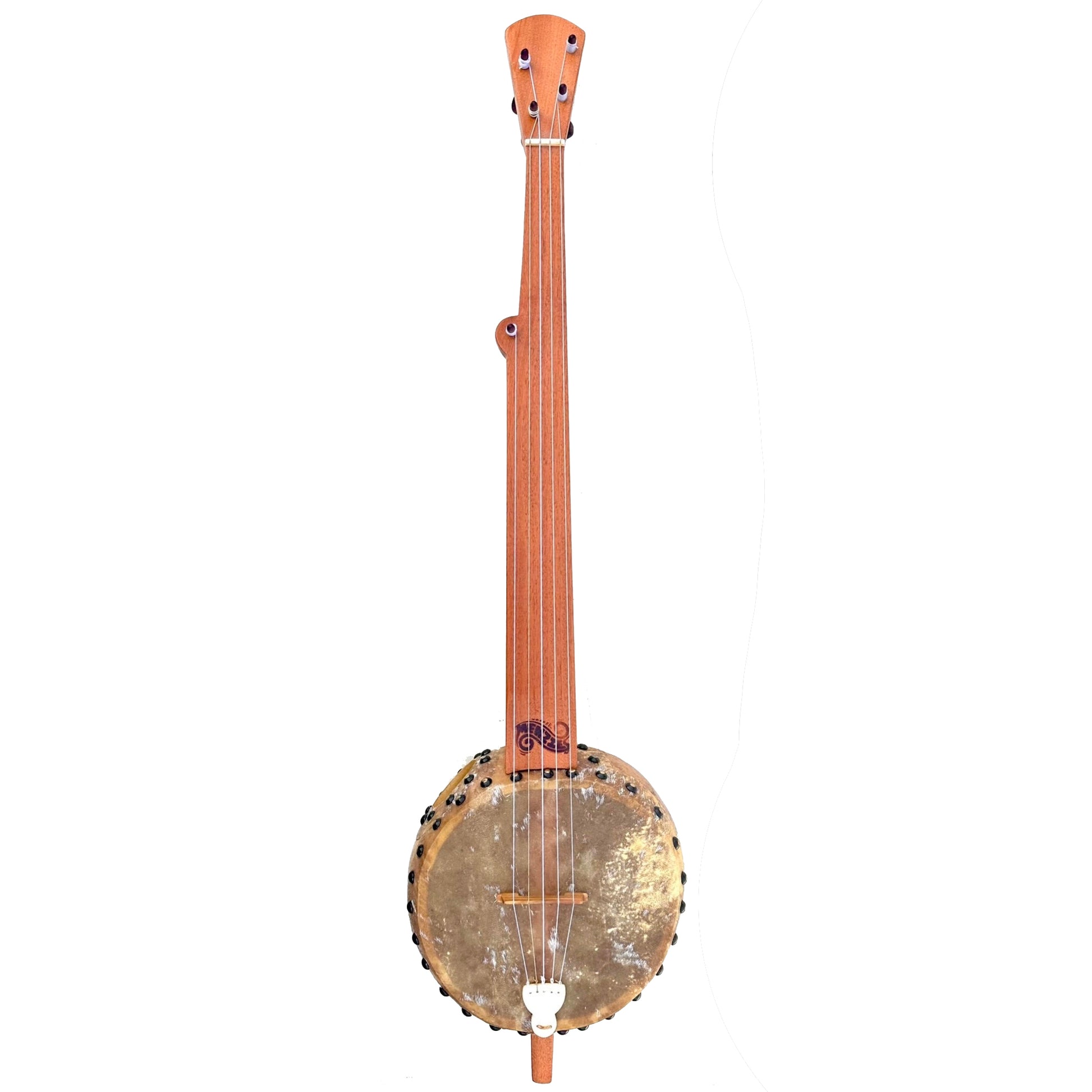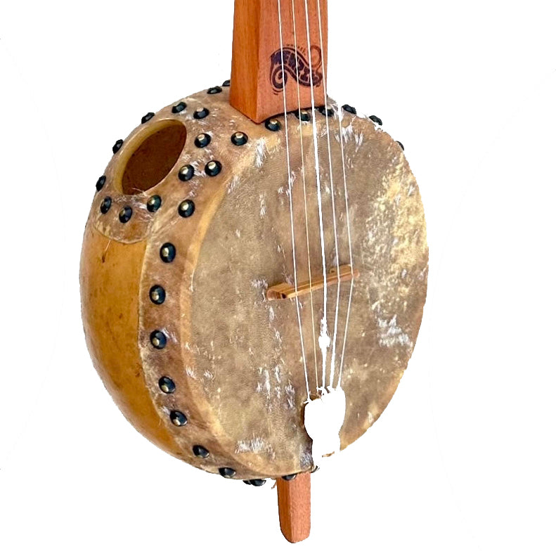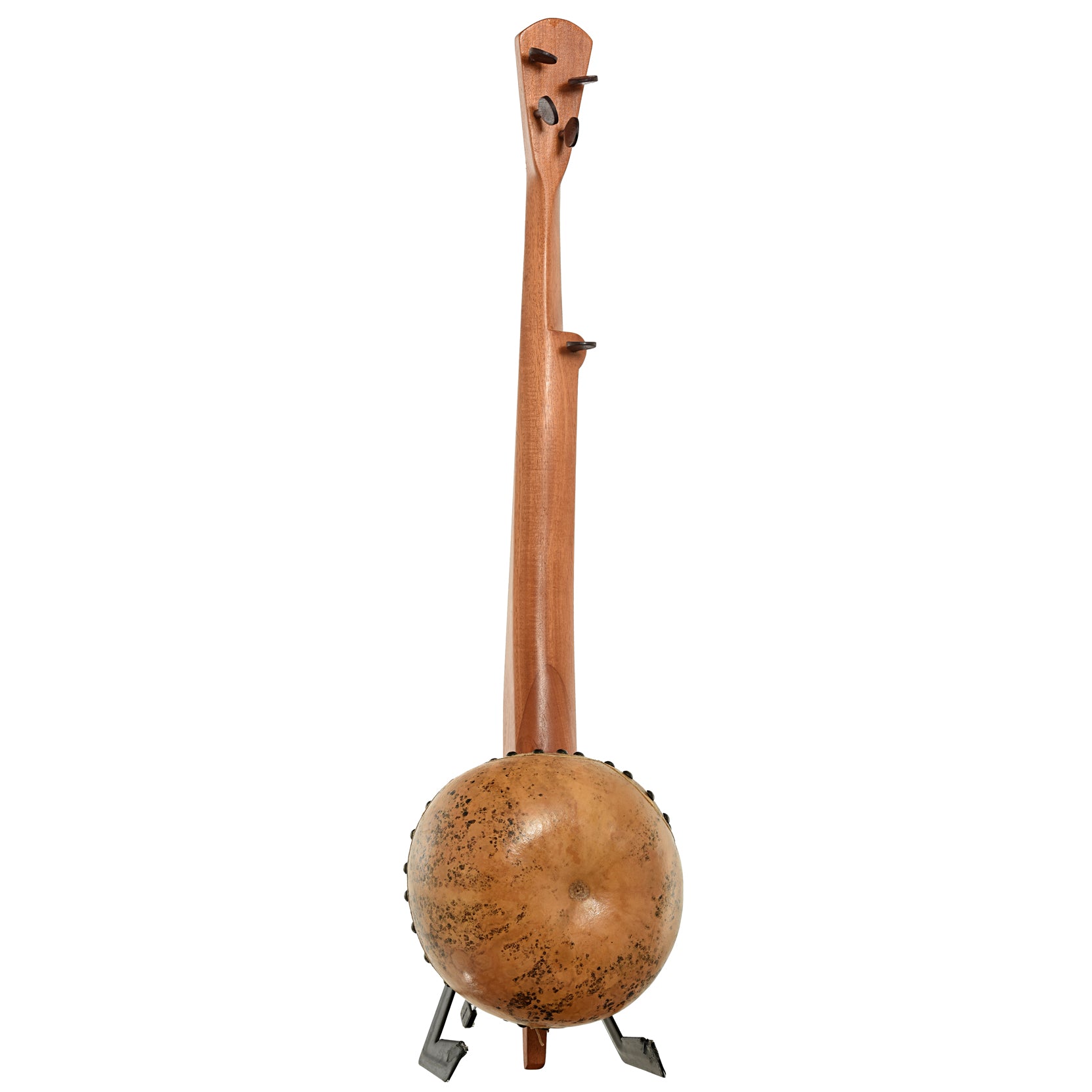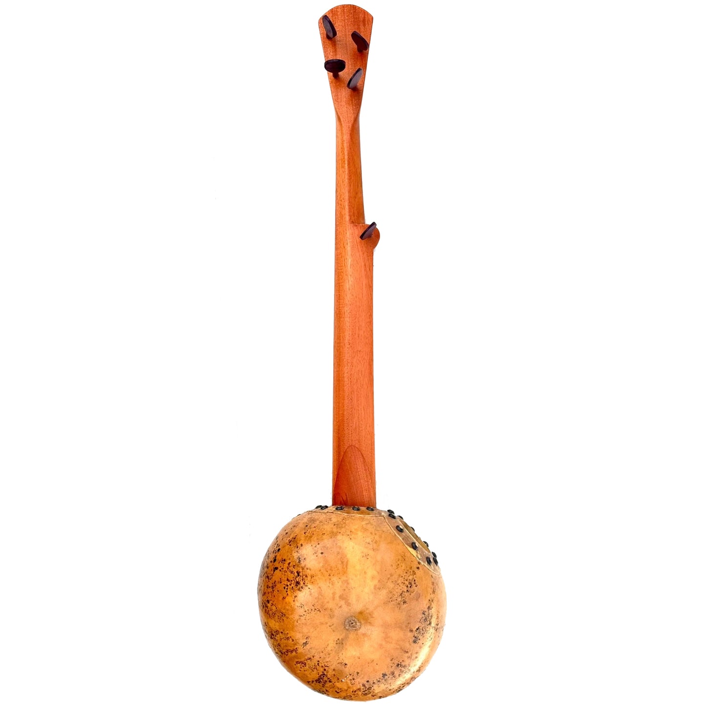 Menzies fretless gourd banjo #602 has a hand-carved Jamaican mahogany neck. The gourd body has a goatskin head, tacked and glued in place. A soundhole is cut into the side. An artful banjo from Jeff Menzies in Jamaica.