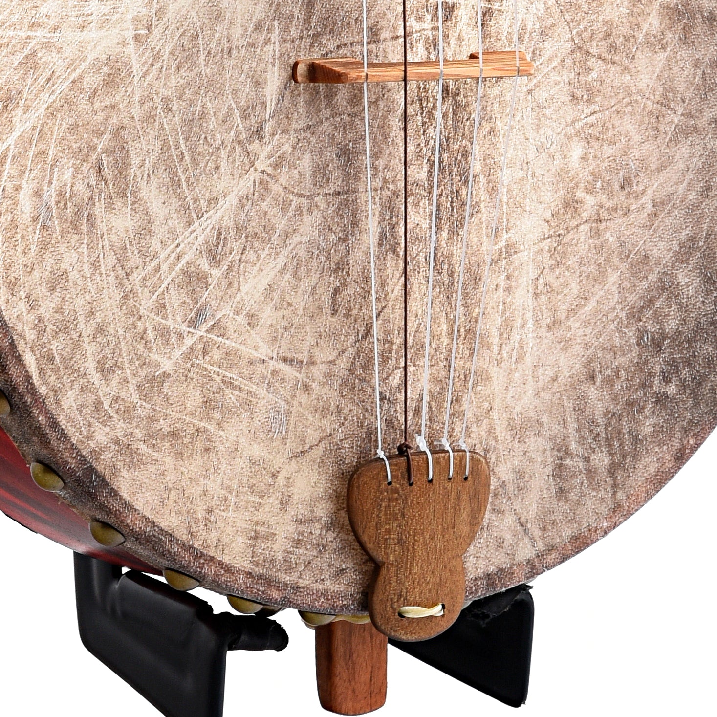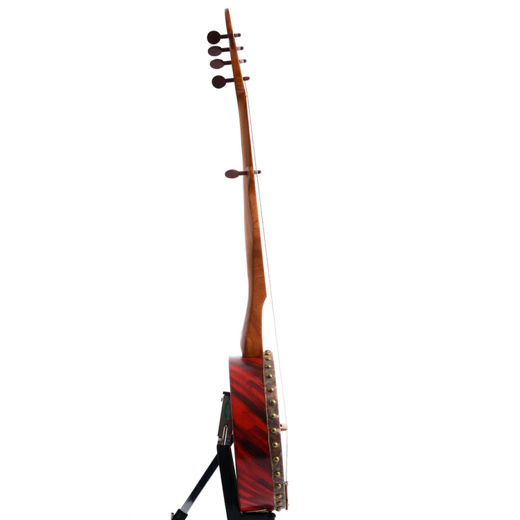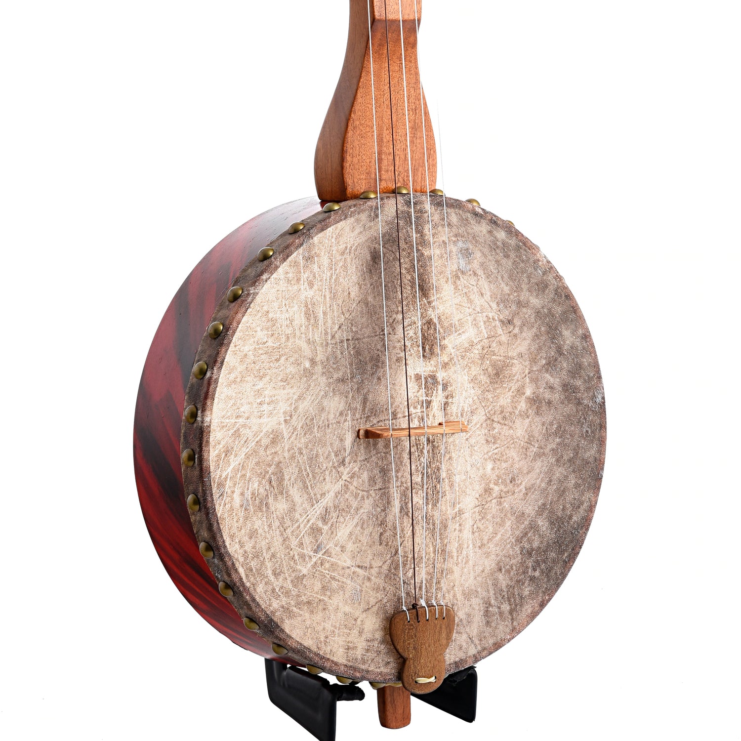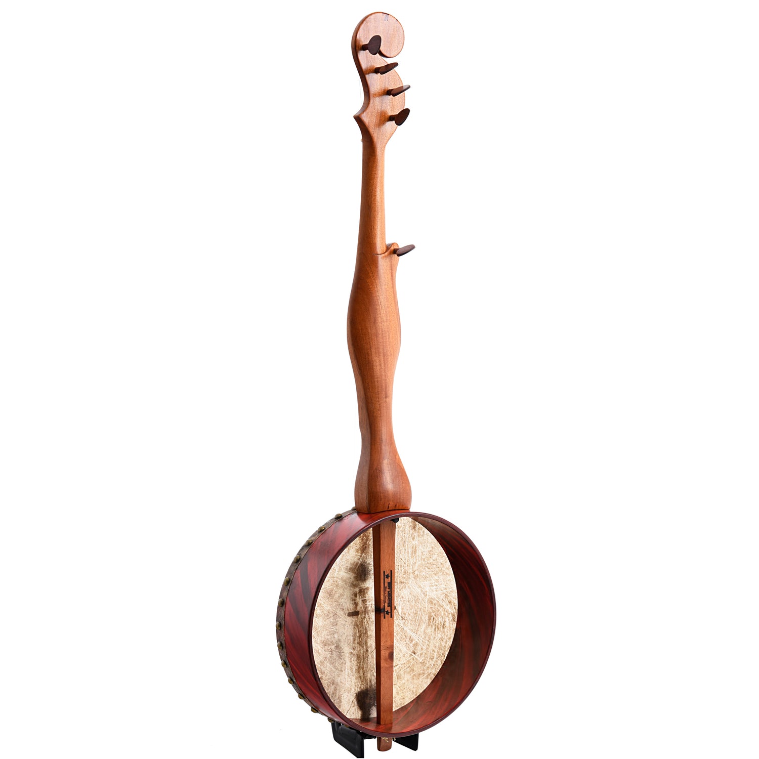Handcarved neck, 12" bent rim with skin head glued and tacked in place, handcarved tuning pegs, Nylgut strings.
