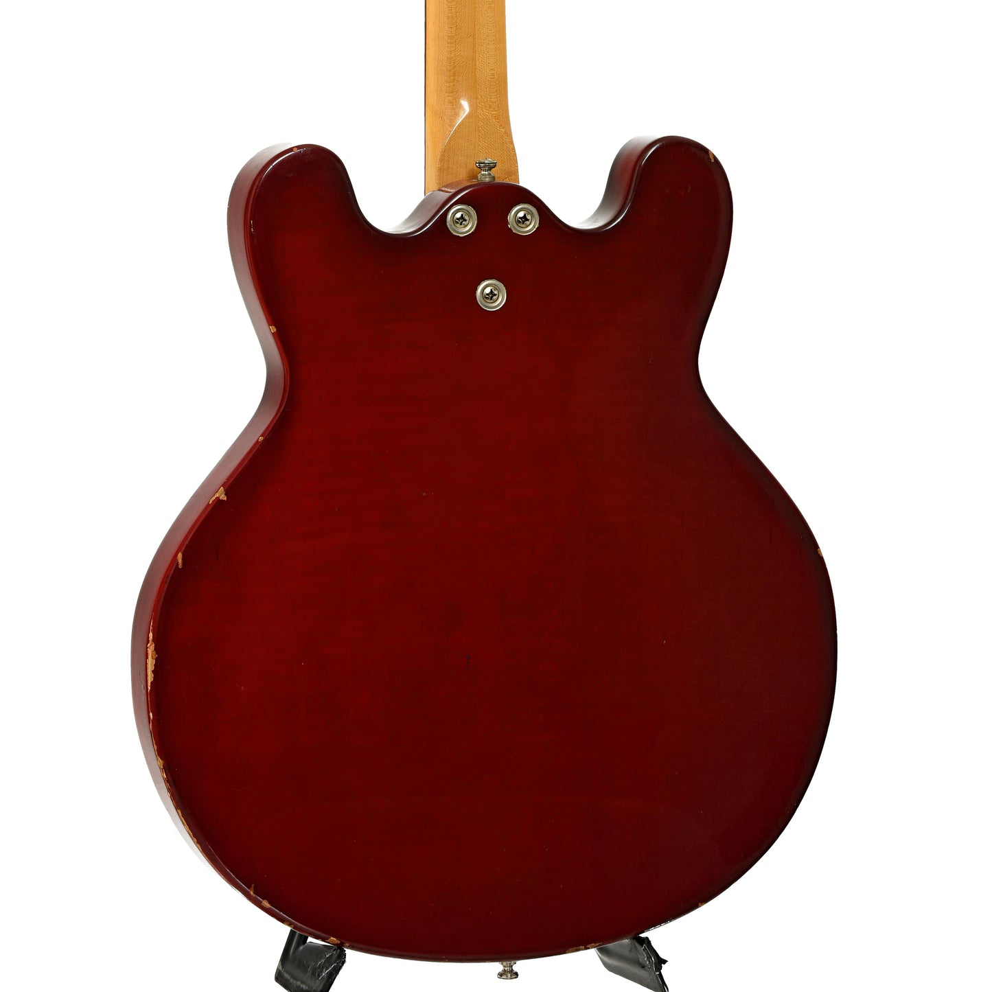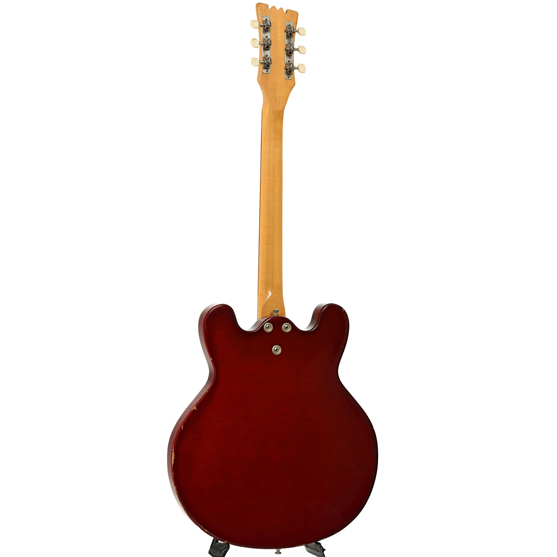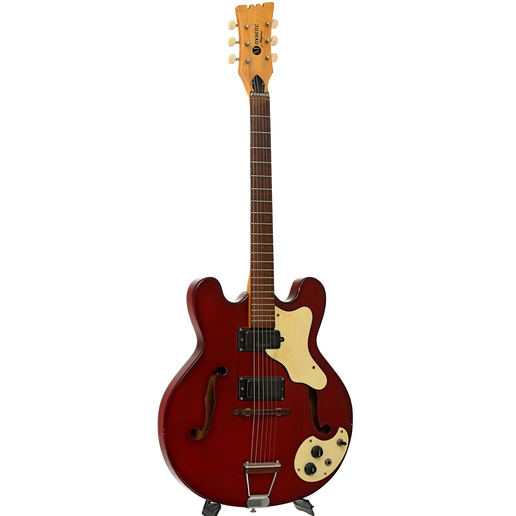 This 1968 Mosrite Celebrity III features a 16" wood body in a Maroon Red finish, paired with a Brazilian rosewood fingerboard and bridge, a bolt-on maple neck, and a trapeze tailpiece. It delivers big sounds with dual humbucking pickups. Includes a period chipboard case (rough condition). Made in the USA.