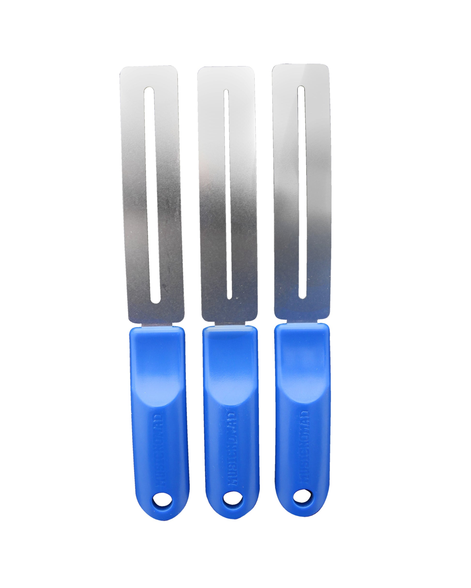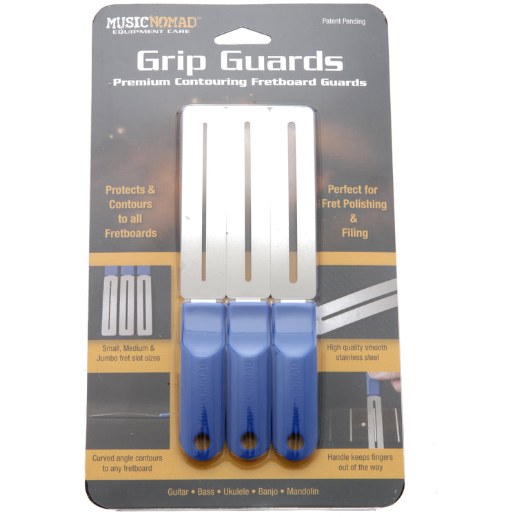 Designed to protect your fretboard when polishing your frets, these premium fretboard guards are made using a high precision process that produces a very smooth finish. The high quality stainless steel is nonmagnetic, corrosion resistant and heat resistant. A specially engineered curve contours to all fretboards. The ergonomic handle makes any fret job easier, quicker, and keeps your fingers from getting in the way. Includes 3 GRIP Guards, one each for small, medium and jumbo fret slot sizes. Works with guitar, bass or ukulele.