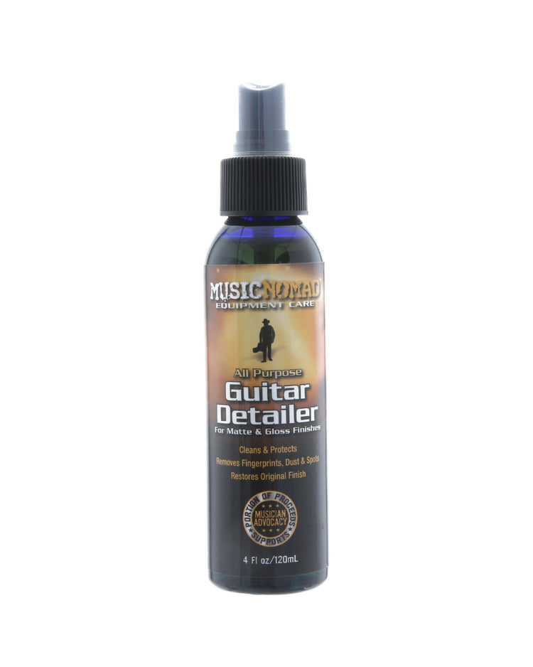 Nothing plays like a clean guitar. MusicNomad's detailer puts everything you need to care for your guitar in one easy spray and wipe product. Works great on both matte/satin & gloss finishes. A single spritz from the atomizer cleans fingerprints, dust & smudges on your electric guitar, acoustic guitar, bass guitar or ukulele. The biodegradable formulation is infused with gloss enhancers & UV protectants to restore your guitar to its showroom look and anti-static agents help reduce dust from binding to your guitar. It even smells great. 4 oz. bottle.