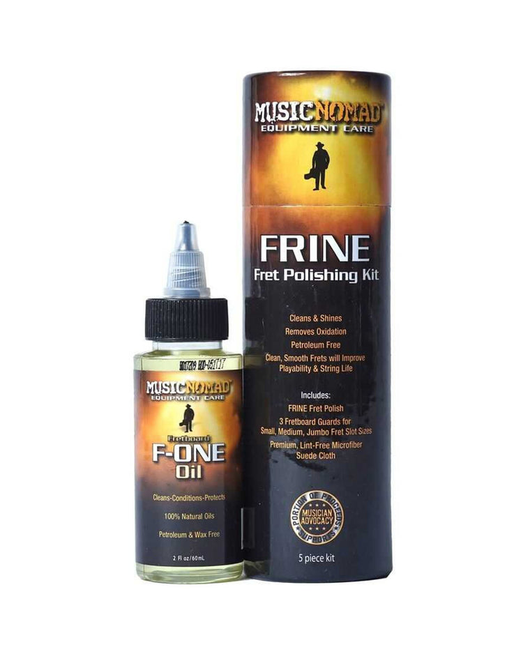 All the products you'll need to restore, maintain and protect your frets and fretboard wood. Start with the FRINE fret polishing kit that not only makes bending and vibrato easier, but prolongs your string life. The specially formulated FRINE fret polish has micro-fine polishing compounds that safely and quickly remove oxidation, dirt and oil. The innovative fretboard guards and premium microfiber cloth are designed to make it safe and easy. The second step is to use Music Nomad's F-ONE oil (2 FL oz/60ml bottle) formulated using a mixture of the finest ultra-refined oils to clean, condition, and protect your unfinished rosewood, ebony and maple fretboards. 100 percent free of lemon extracts, waxes, petroleum distillates, detergents, and water. Leaves your fretboard looking new, playing great, and feeling smooth, never sticky or tacky.