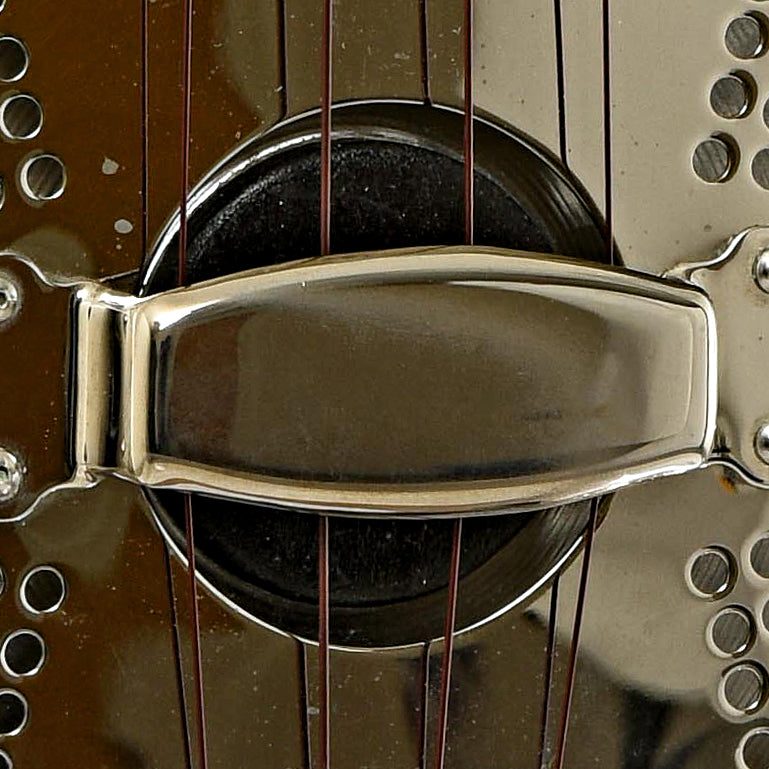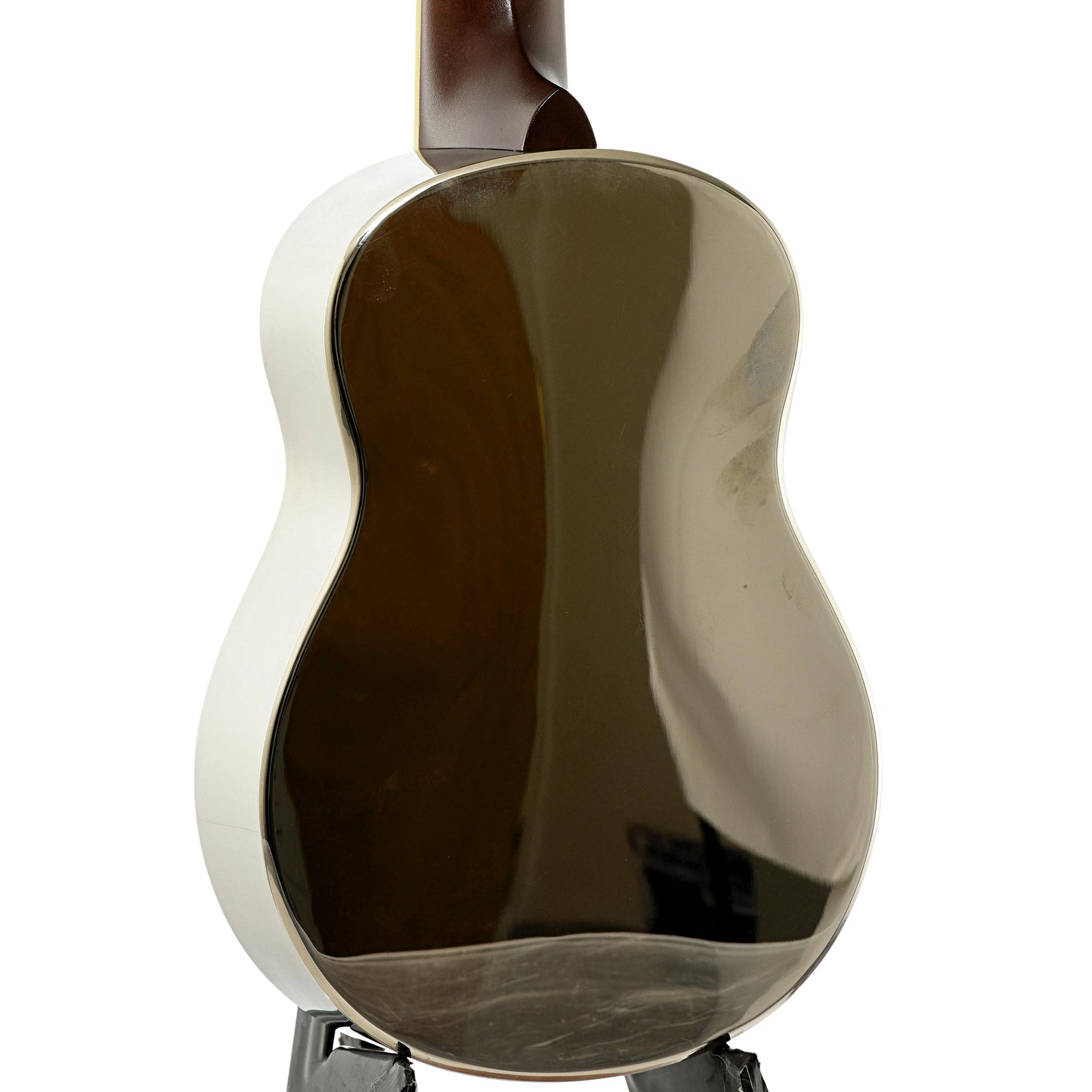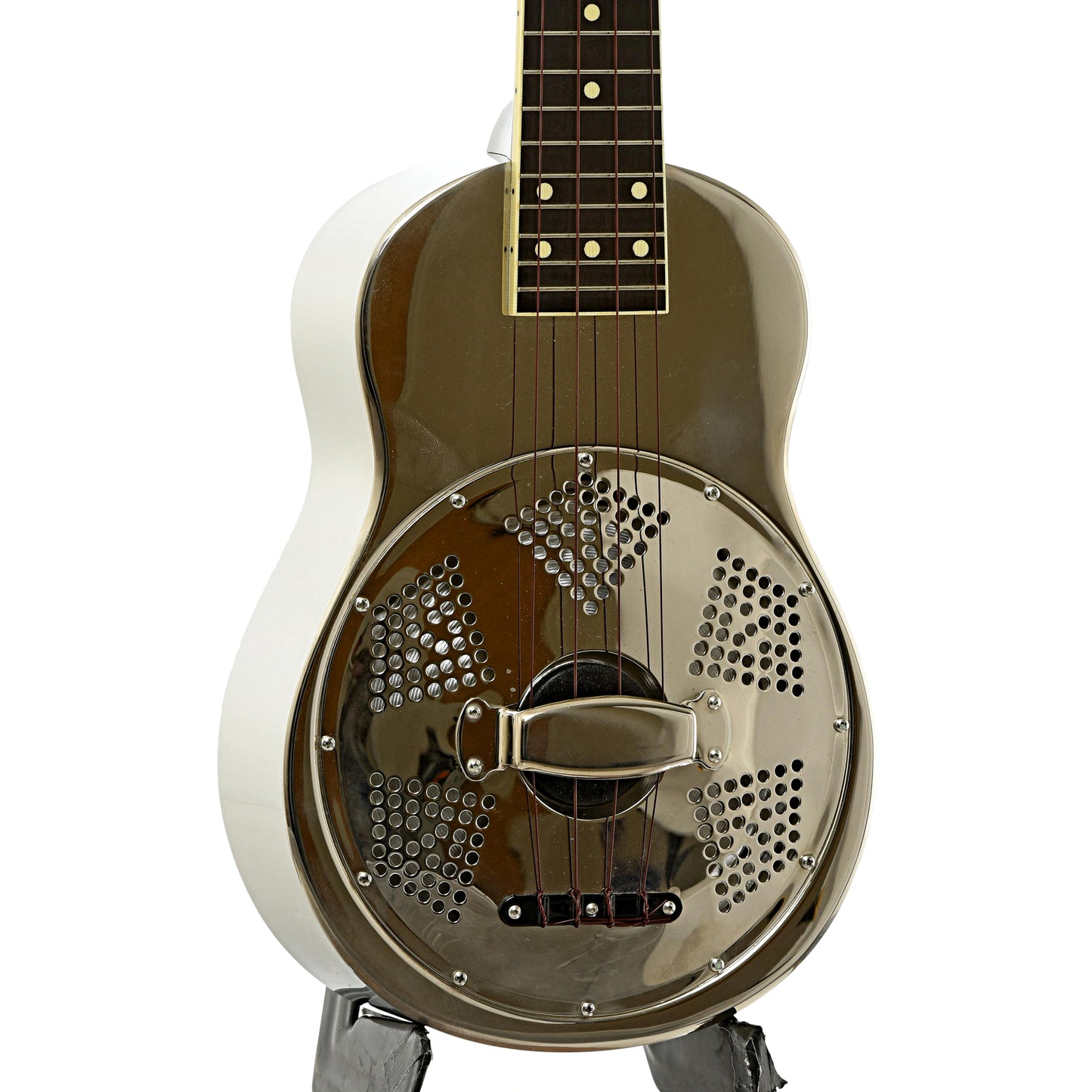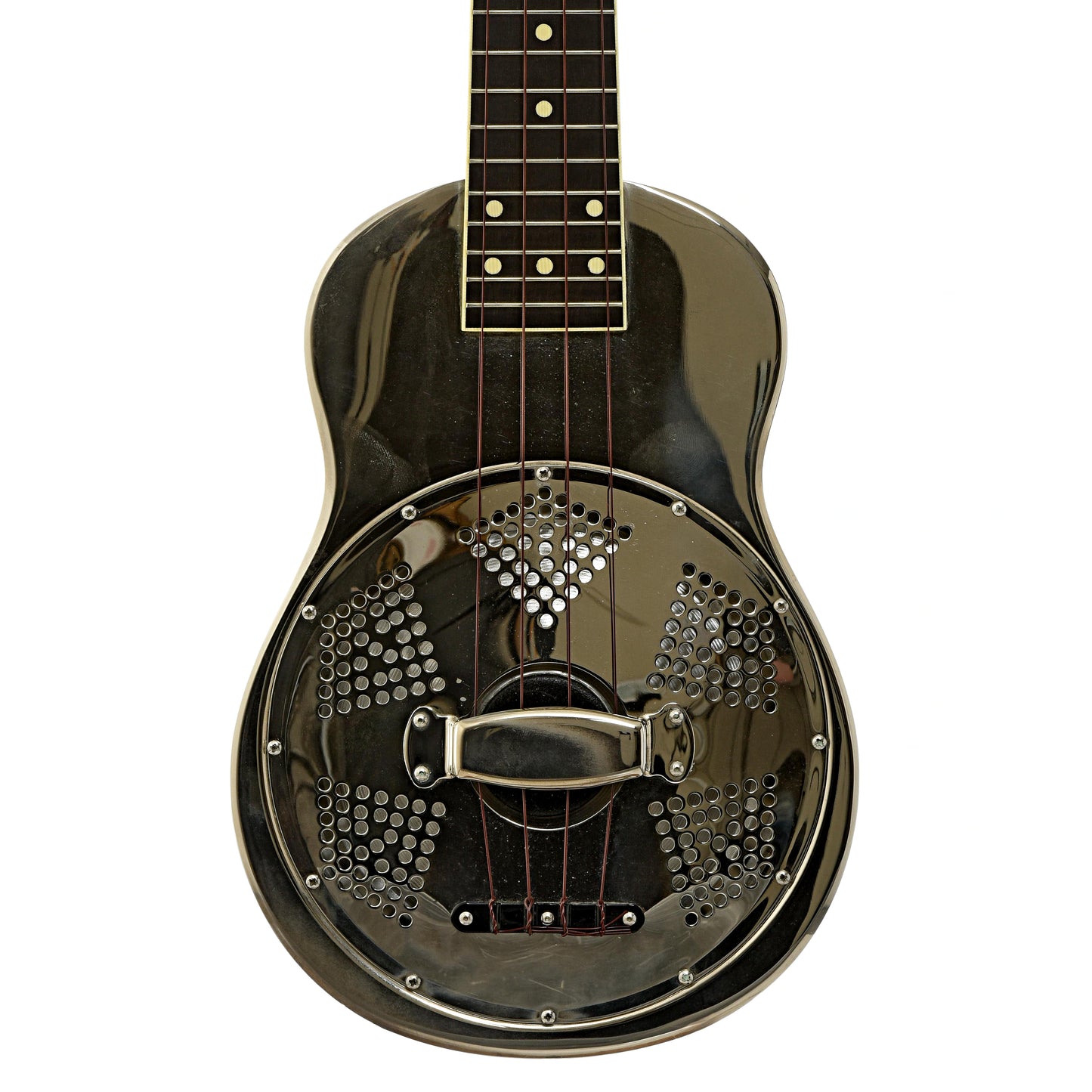 This cute little National soprano reso uke features a silver-plated plated brass, a 14-fret mahogany neck, and an ebony flat fingerboard with ivoroid binding and dots. It has an aluminum cone, biscuit bridge and diamond sieve coverplate. Gotoh tuners installed. Hard shell case. Made in USA.