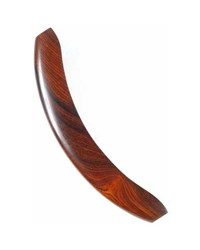 Armrest of polished bubinga (a tropical hardwood similar to rosewood). Smooth rounded edge for comfort. Fits most 12" rim banjos. Does not attach to bracket hooks, so standard hook spacing is not required. Small metal L-brackets hook under tension hoop.