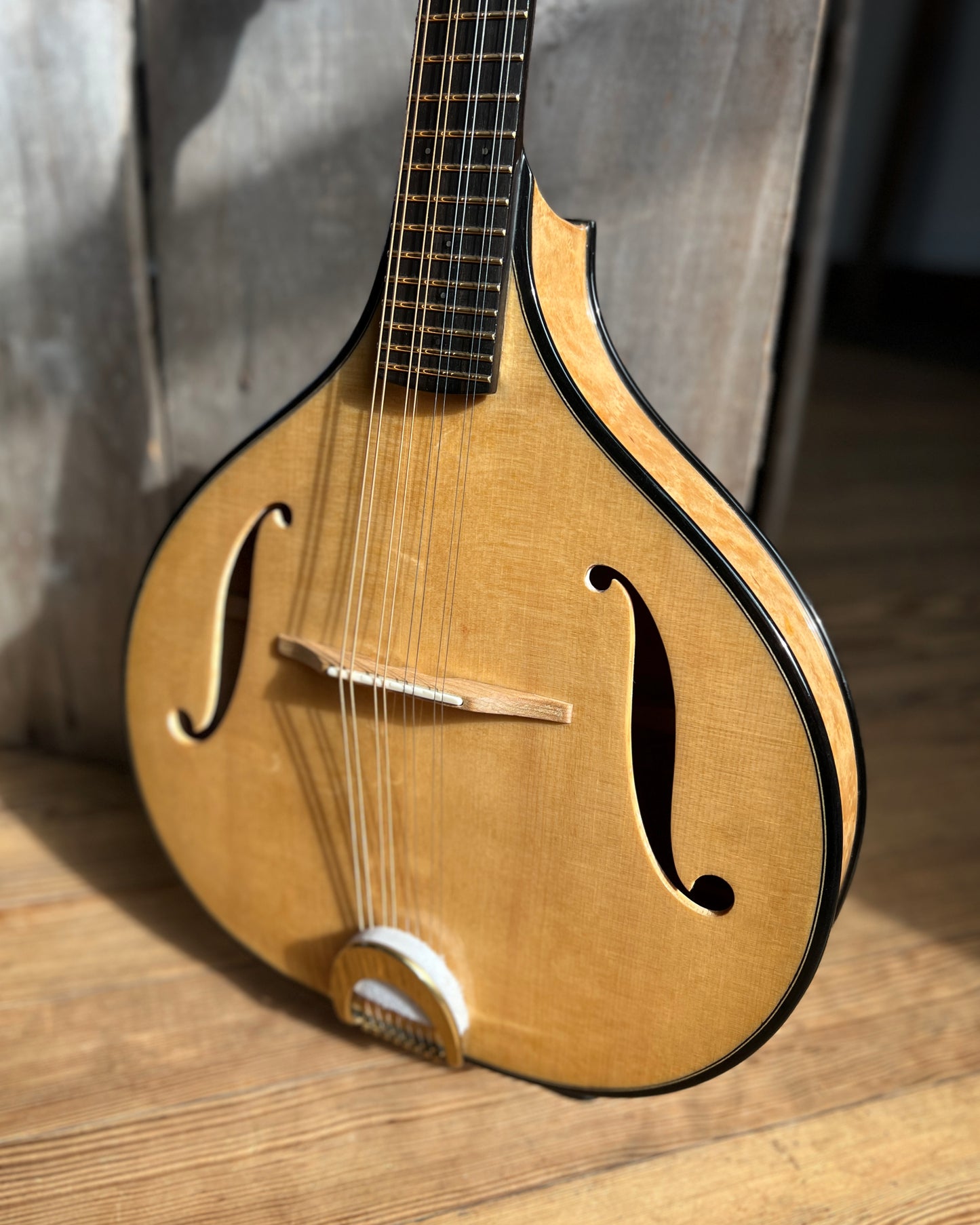 Handmade in Australia, this NK Forster Big Celtic F mandolin delivers a perfect blend of sweet tones and cutting projection. It features a teardrop body with a spruce top and birdseye maple back and sides, paired with a mahogany neck and an ebony fingerboard with EVO gold frets. Additional highlights include a maple bridge and a brass "harp" tailpiece. Built to hold its own in any session! Comes with a hard shell case. On consignment.