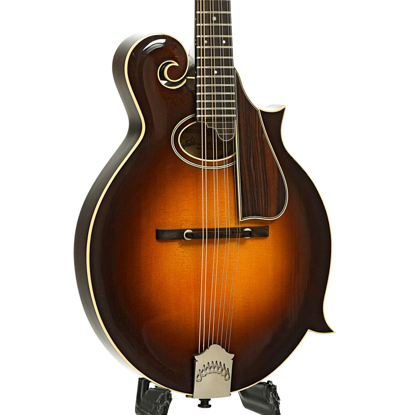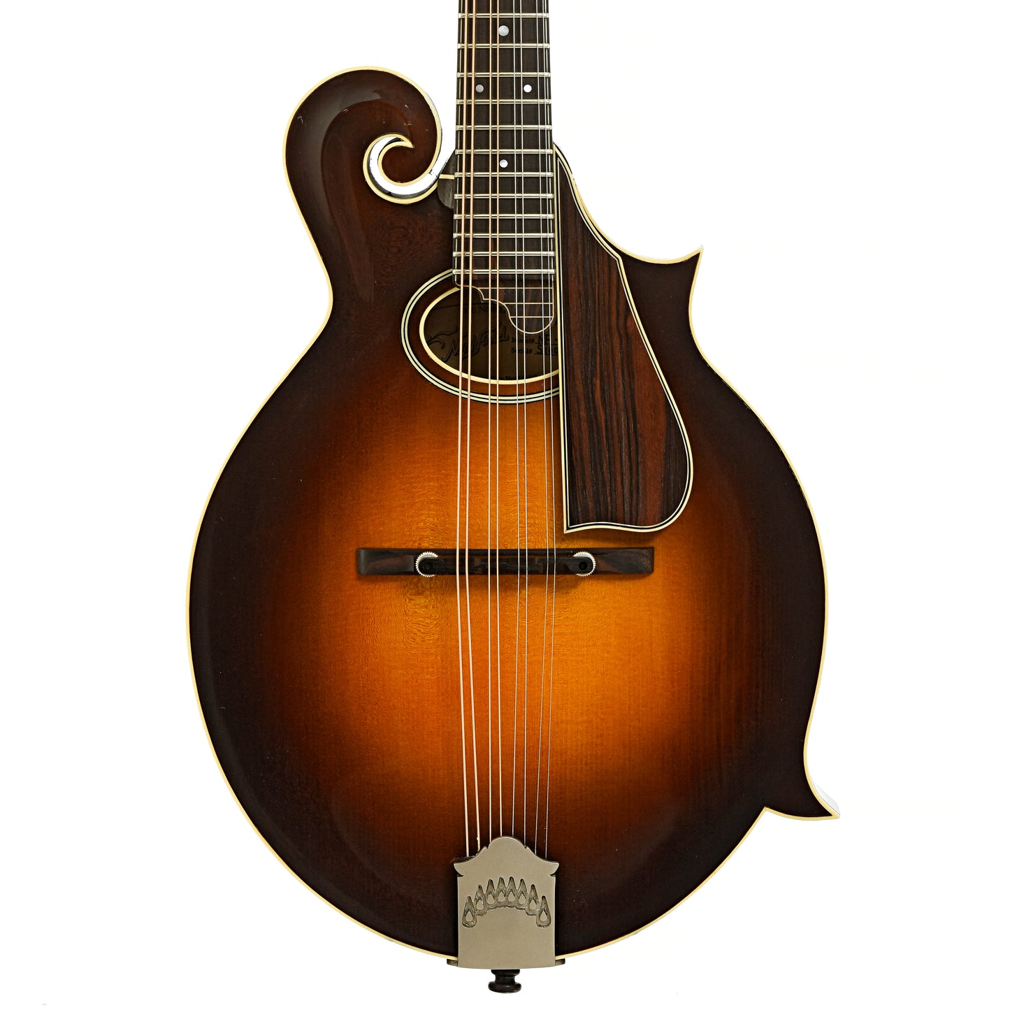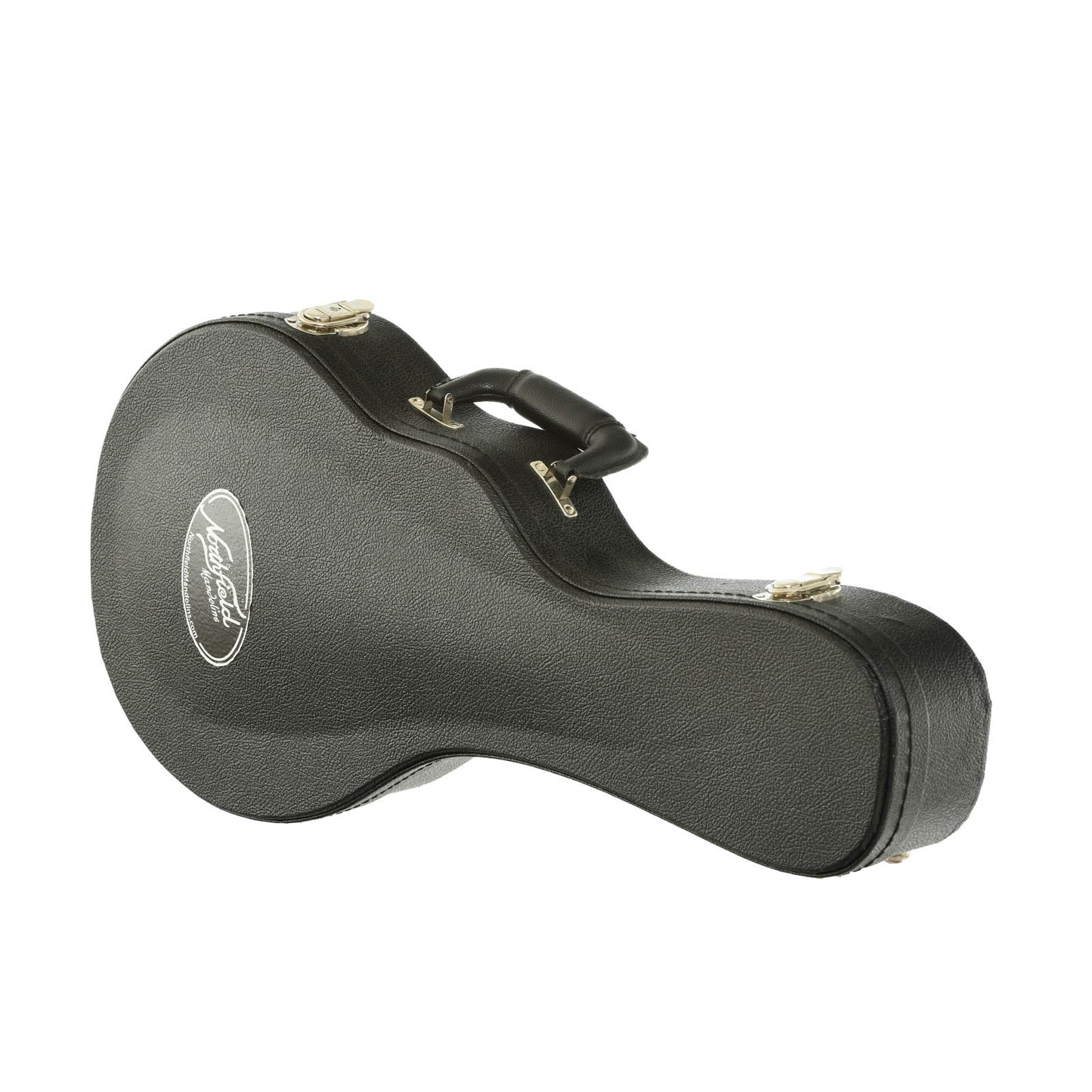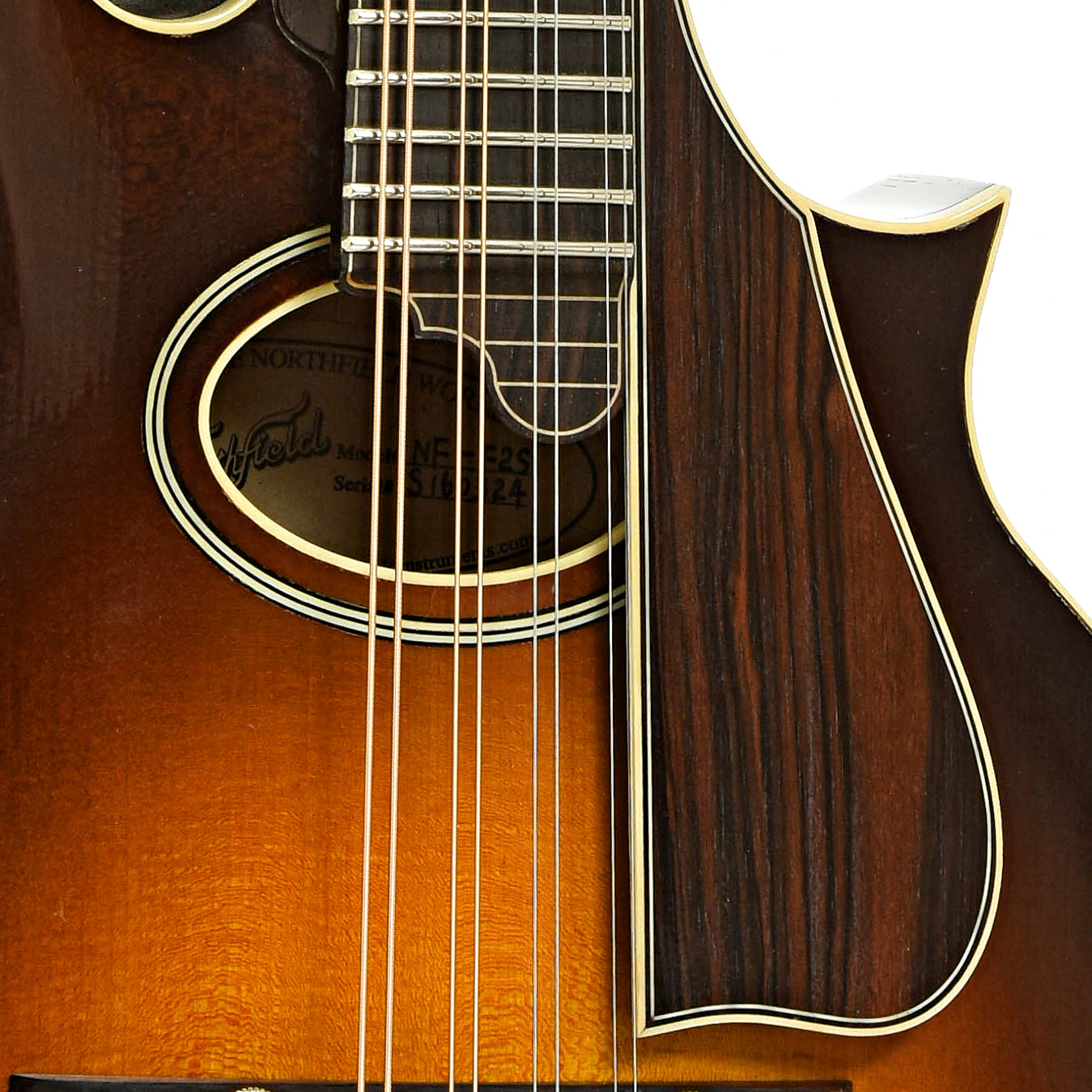 This Northfield F-style mandolin sports an oval soundhole in a modern take on a classic. Features include gloss sunburst finish on bound spruce top, figured maple back and sides, ebony fingerboard, adjustable bridge and pickguard. Resonant and easy playing. Shaped hard shell case. Designed in USA, built in China (materials from North America).