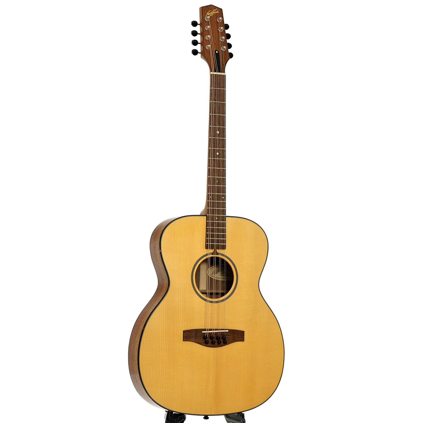 This Northfield octave mandolin has a guitar-style body of flat spruce top and walnut back (and sides), in a spirit varnish natural finish, with simple appointments of tortoise plastic binding. Features include a walnut bridge and fingerboard, and Gotoh 4-on-a-plate tuners. Black fiberglass hard shell case. Huge, zingy tone! USA woods, Asian build, USA finish.