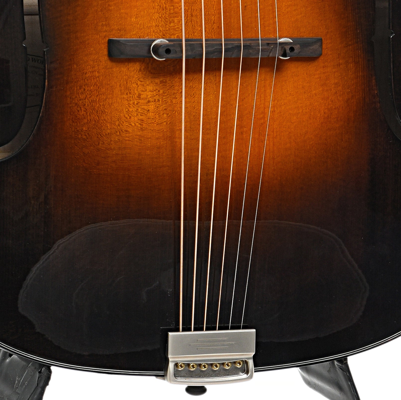This uniquely-small body acoustic guitar, with complex arching, tone bars, and flat back is something altogether different, from its origin story found in those 000-sized archtops, made in Nazareth in the 1930s. Just enough guts to produce a big sound with the elegance to accommodate the comfort we all strive for in an instrument.