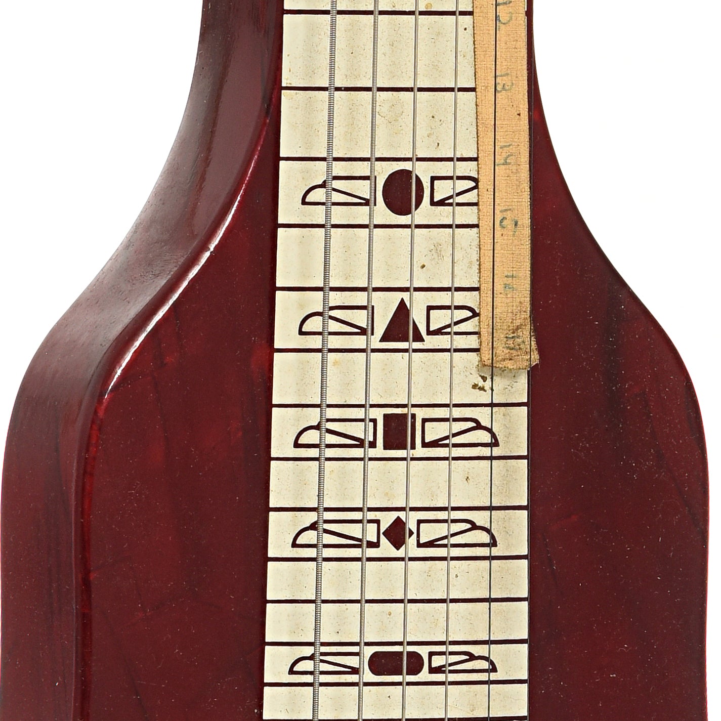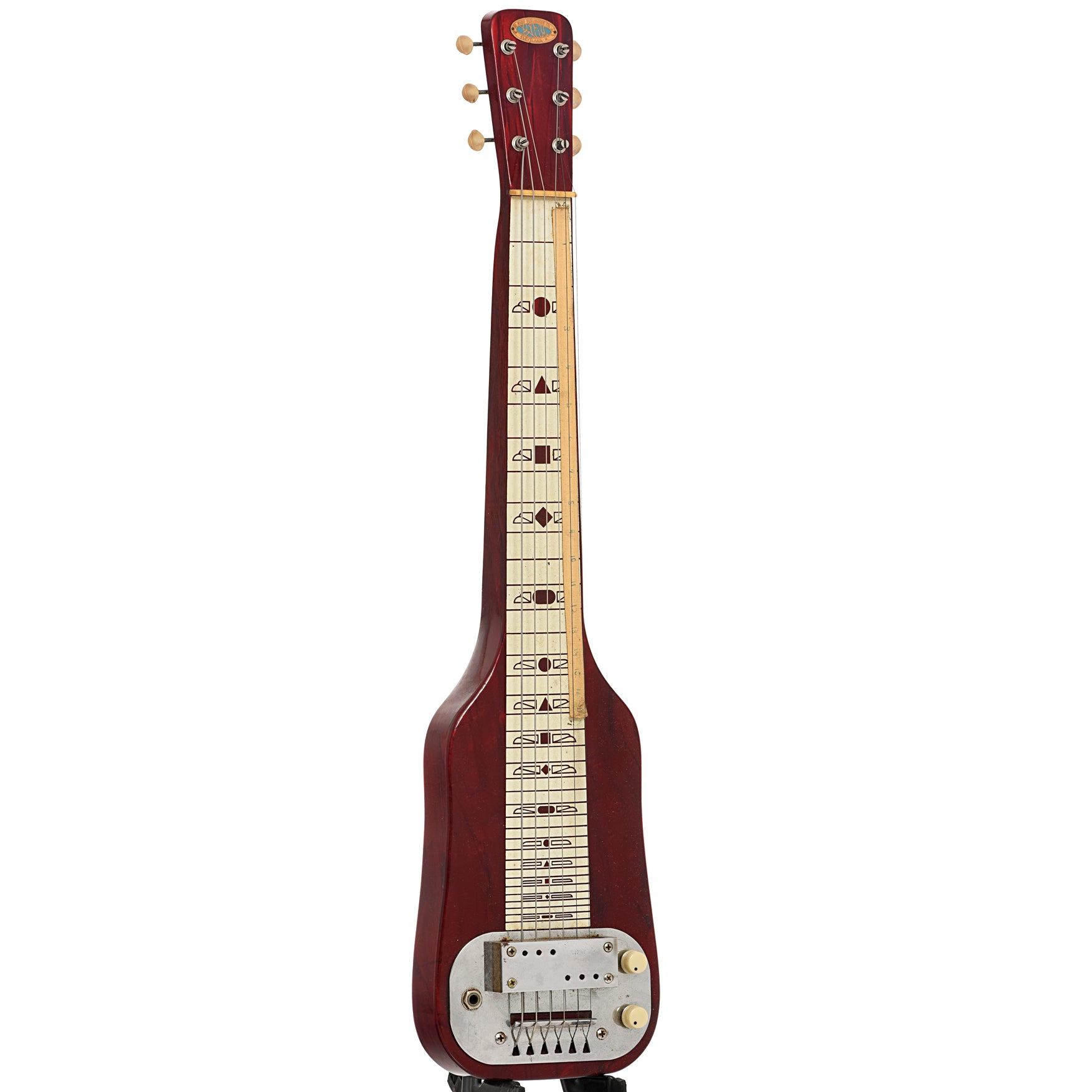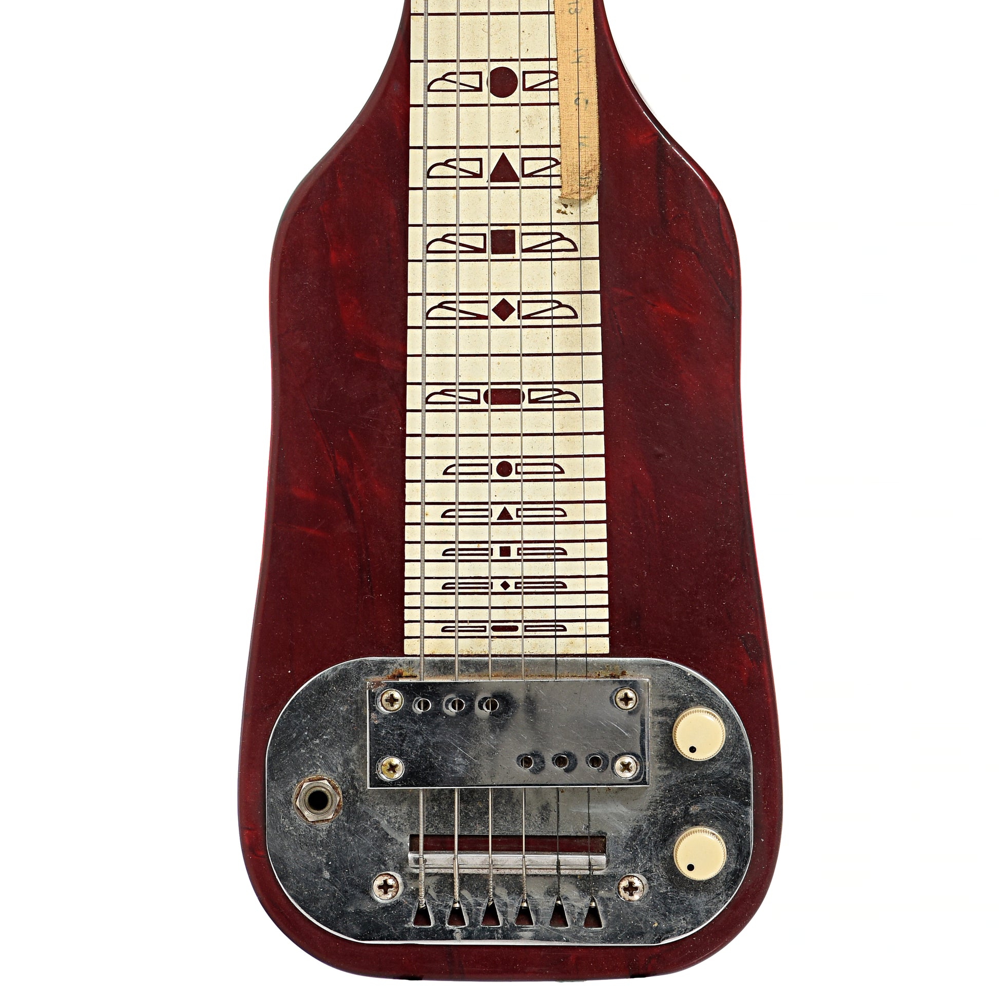 A pretty example of the mid-50s Oahu lap steel line, featuring red pearloid finish on wood body, 36 fret lines on white fretboard, split-coil pickup, blade bridge, vintage-style tuners. Original faux gator soft shell case. Made in USA.