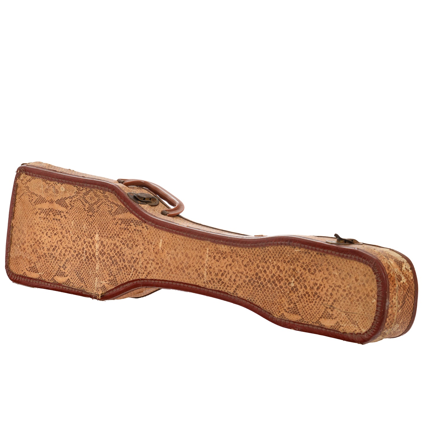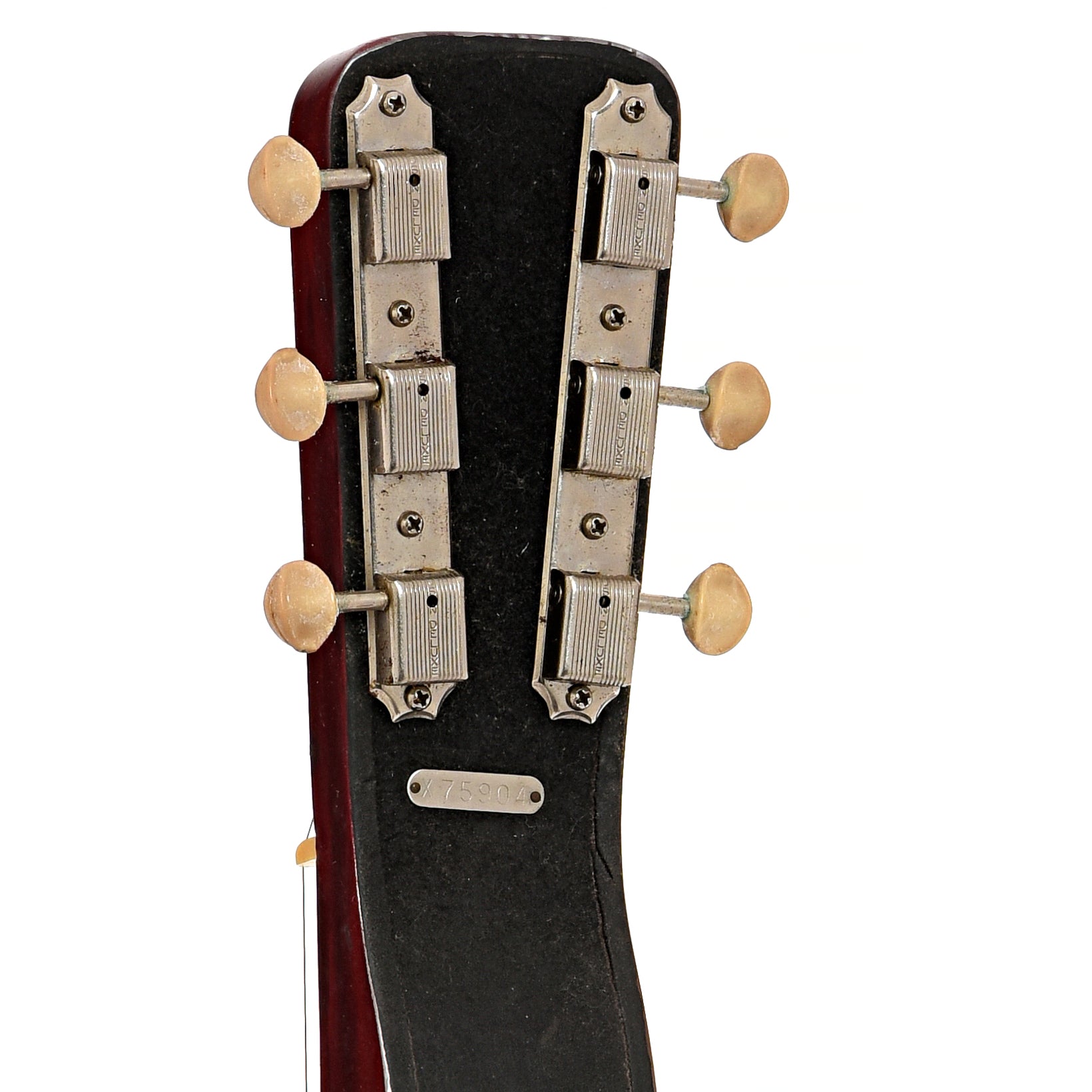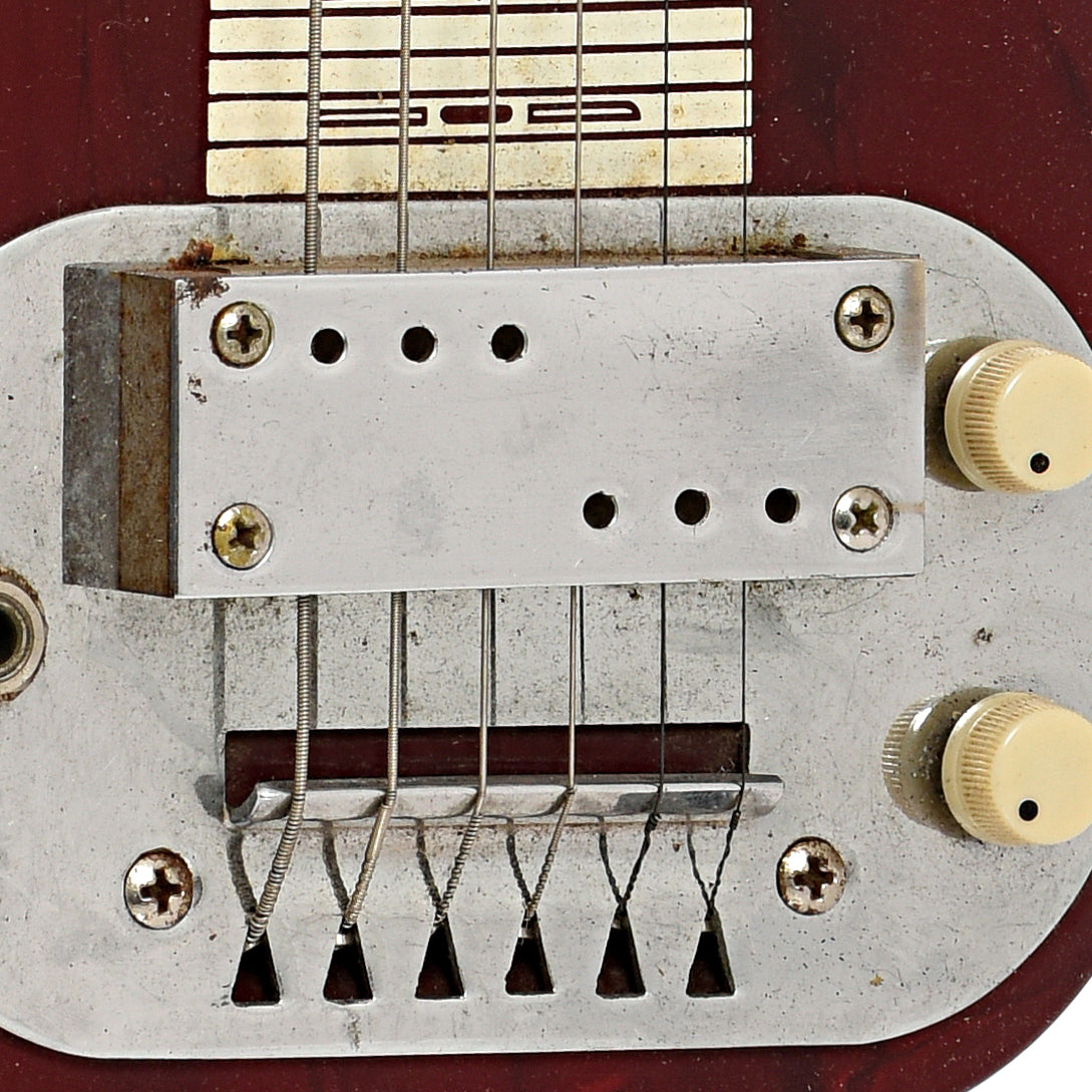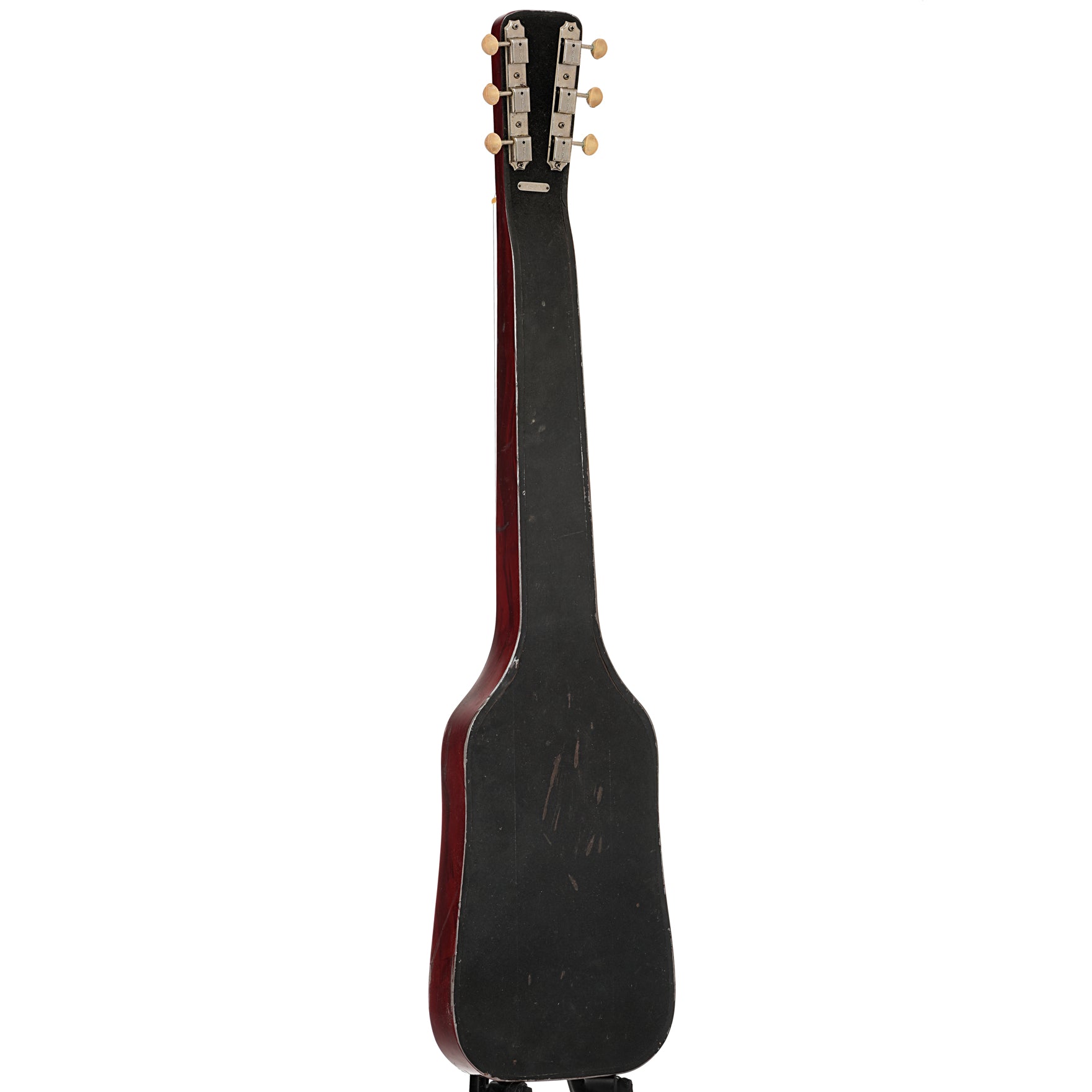 A pretty example of the mid-50s Oahu lap steel line, featuring red pearloid finish on wood body, 36 fret lines on white fretboard, split-coil pickup, blade bridge, vintage-style tuners. Original faux gator soft shell case. Made in USA.