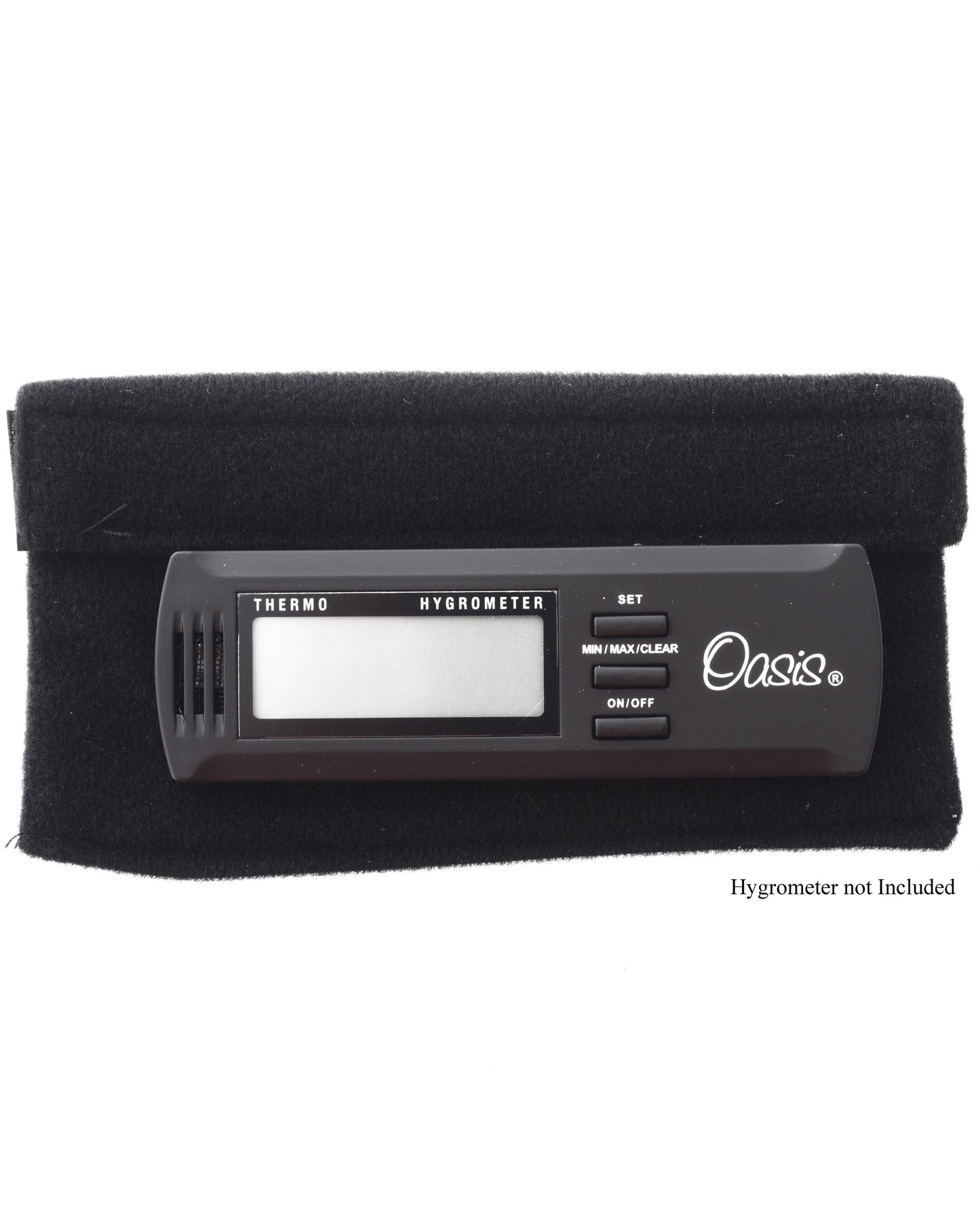 For more accurate readings, holds the Oasis Hygrometer, OGH2, next to the body of the guitar, instead of in the pocket or up by the peghead. Made of cloth and Velcro, attaches to the 1st or 6th string and lies flat, next to the body, while the case is closed.