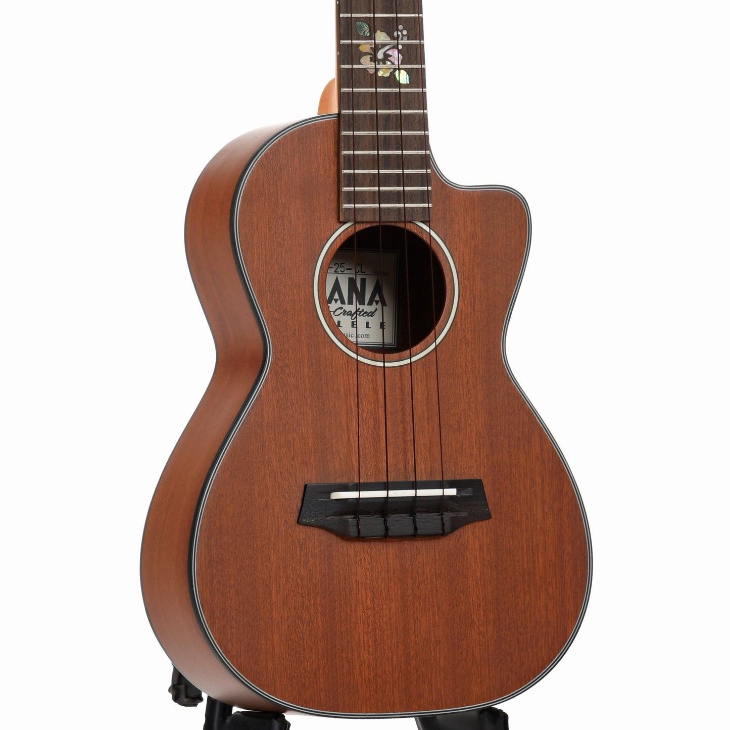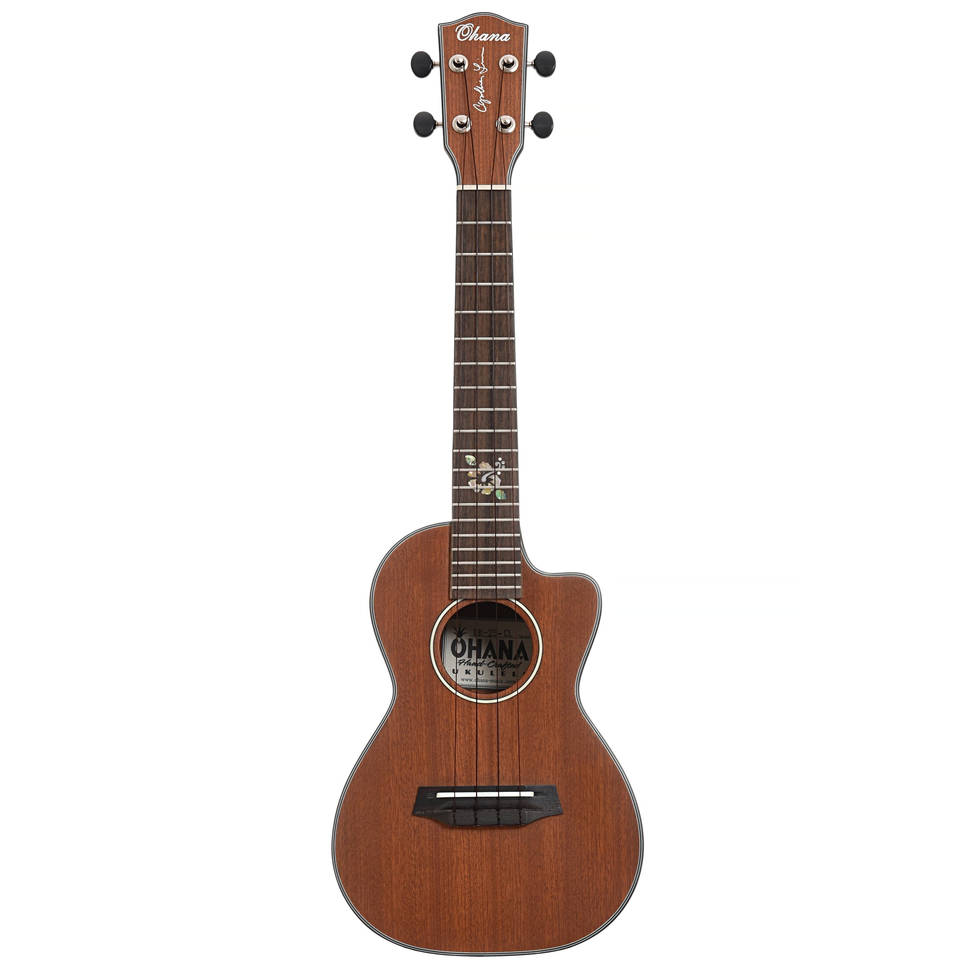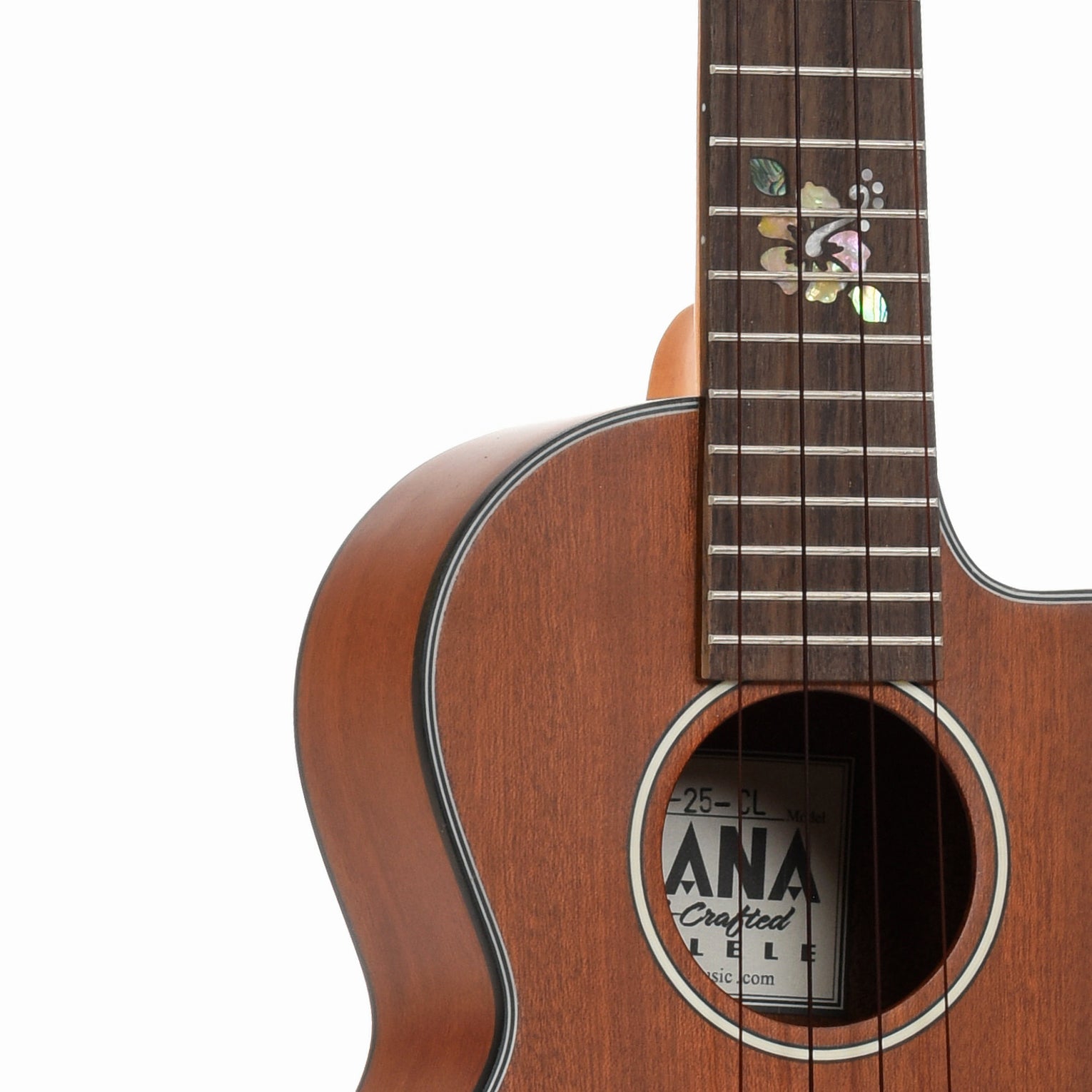 The Ohana CK-25C-CL Cynthia Lin signature concert ukulele is a stylish solid-to mahogany instrument with great sound to compliment its looks. A floral inlay in beautiful abalone at the 12th fret is inspired by the flower that Cynthia often wears in her hair. The Worth brown fluoro-carbon strings really allow this beauty to sing.