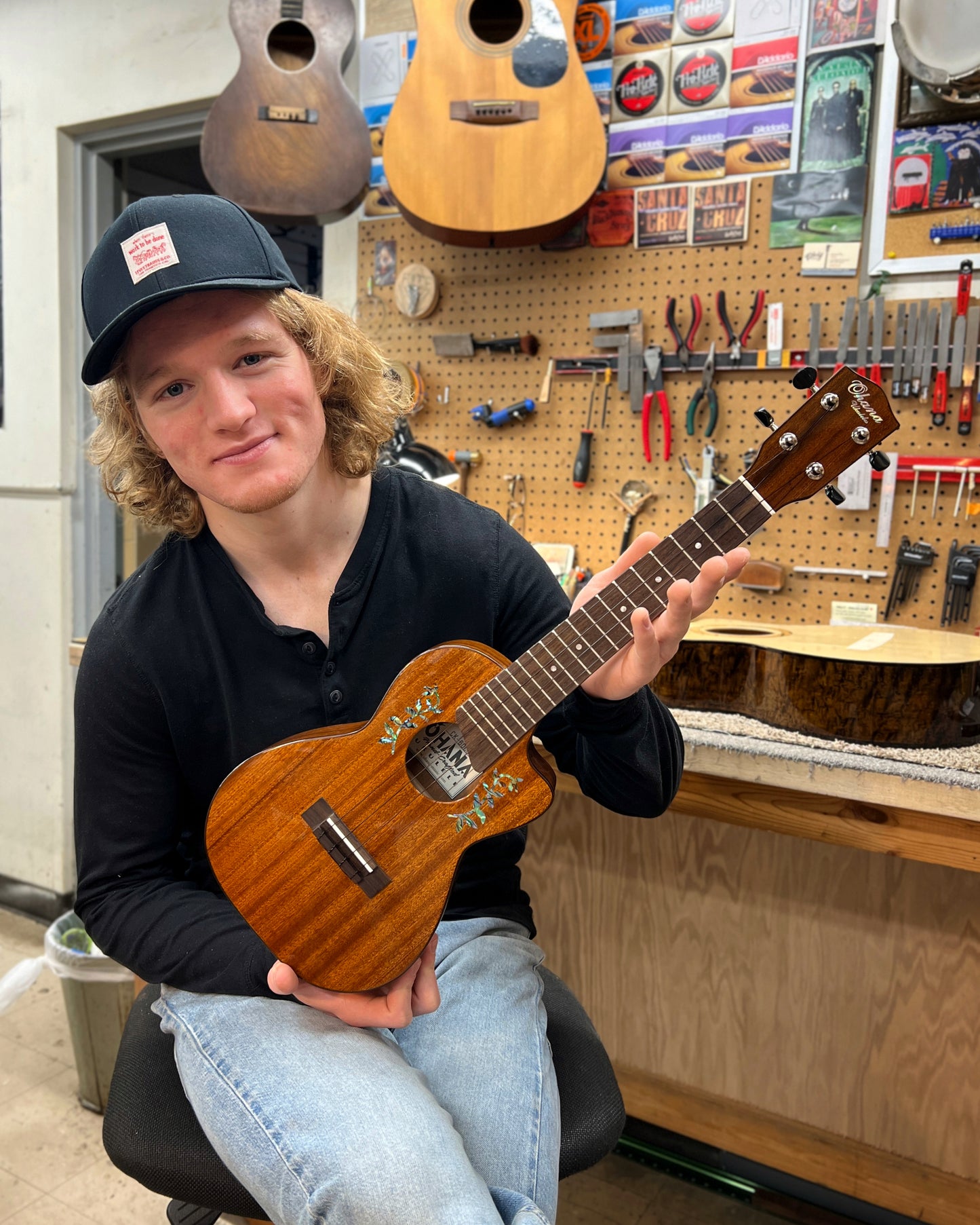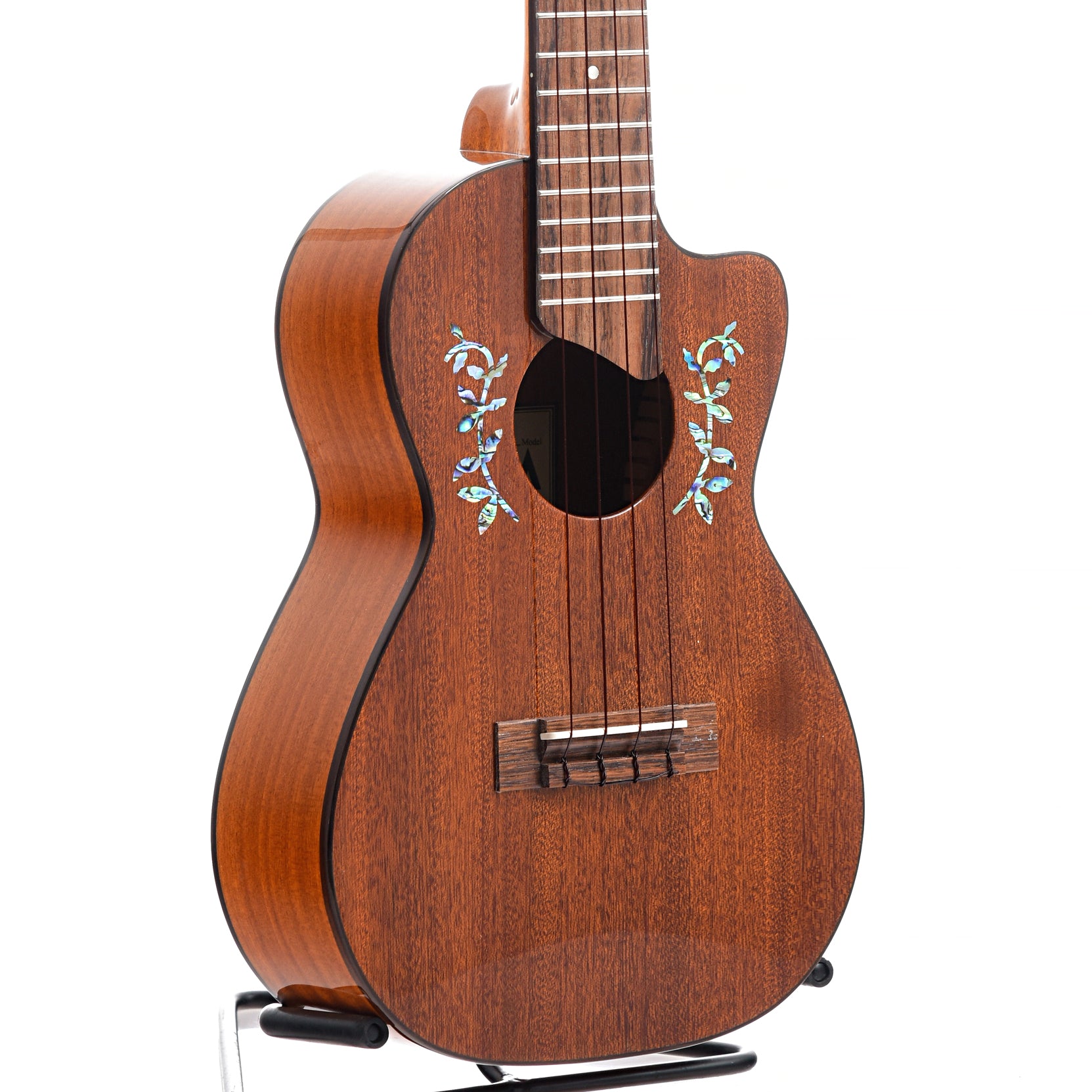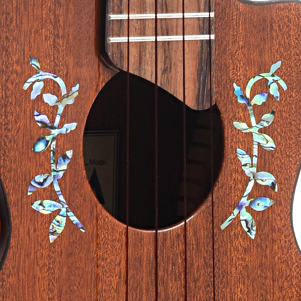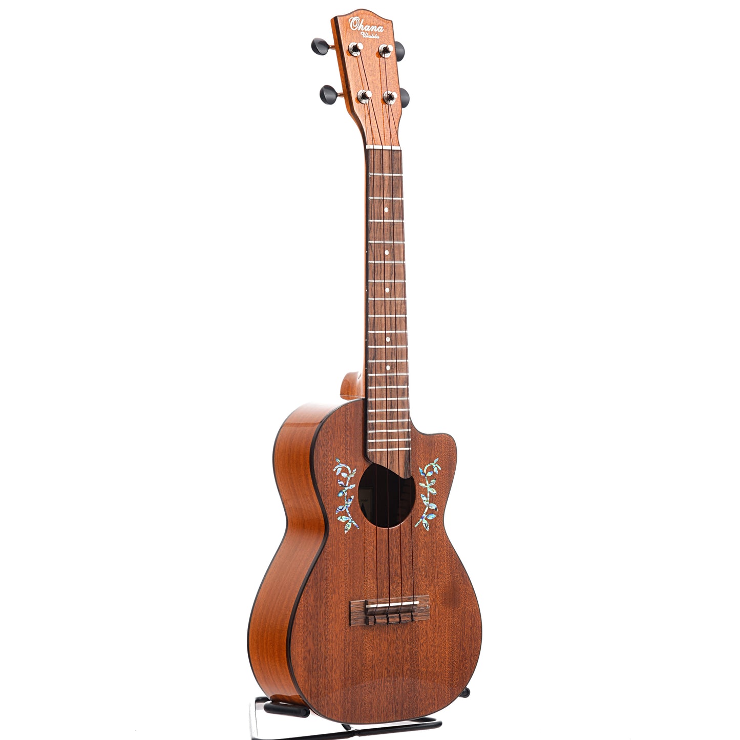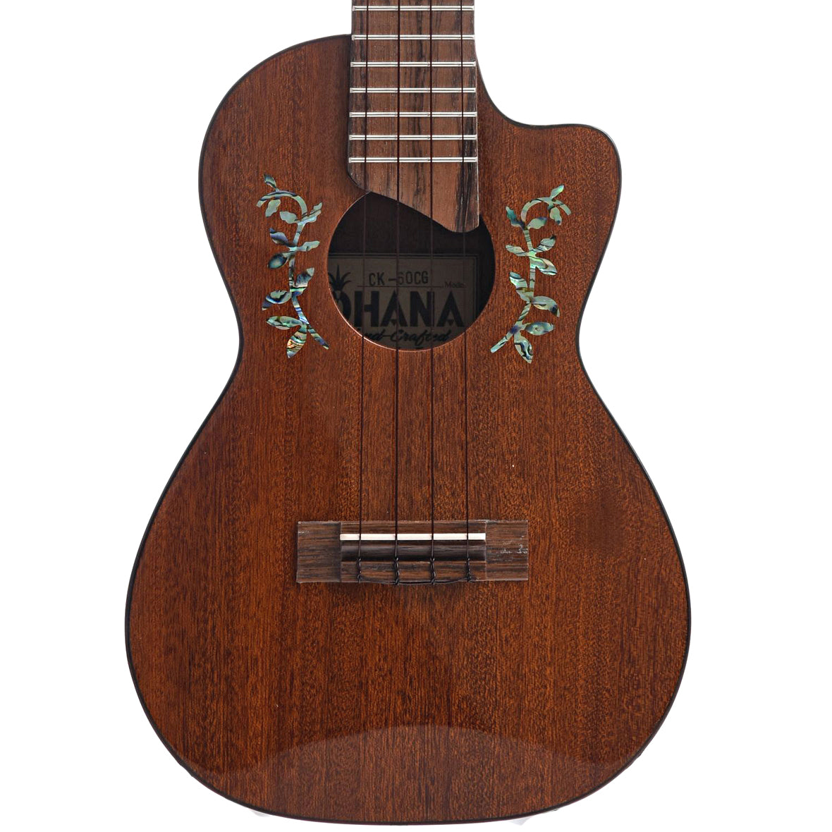 A very attractive instrument, the Ohana CK-60CG Concert Ukulele features an all solid mahogany cutaway body with a fancy floral inlay rosette and a glossy finish A well made ukulele that sounds as great as it looks.