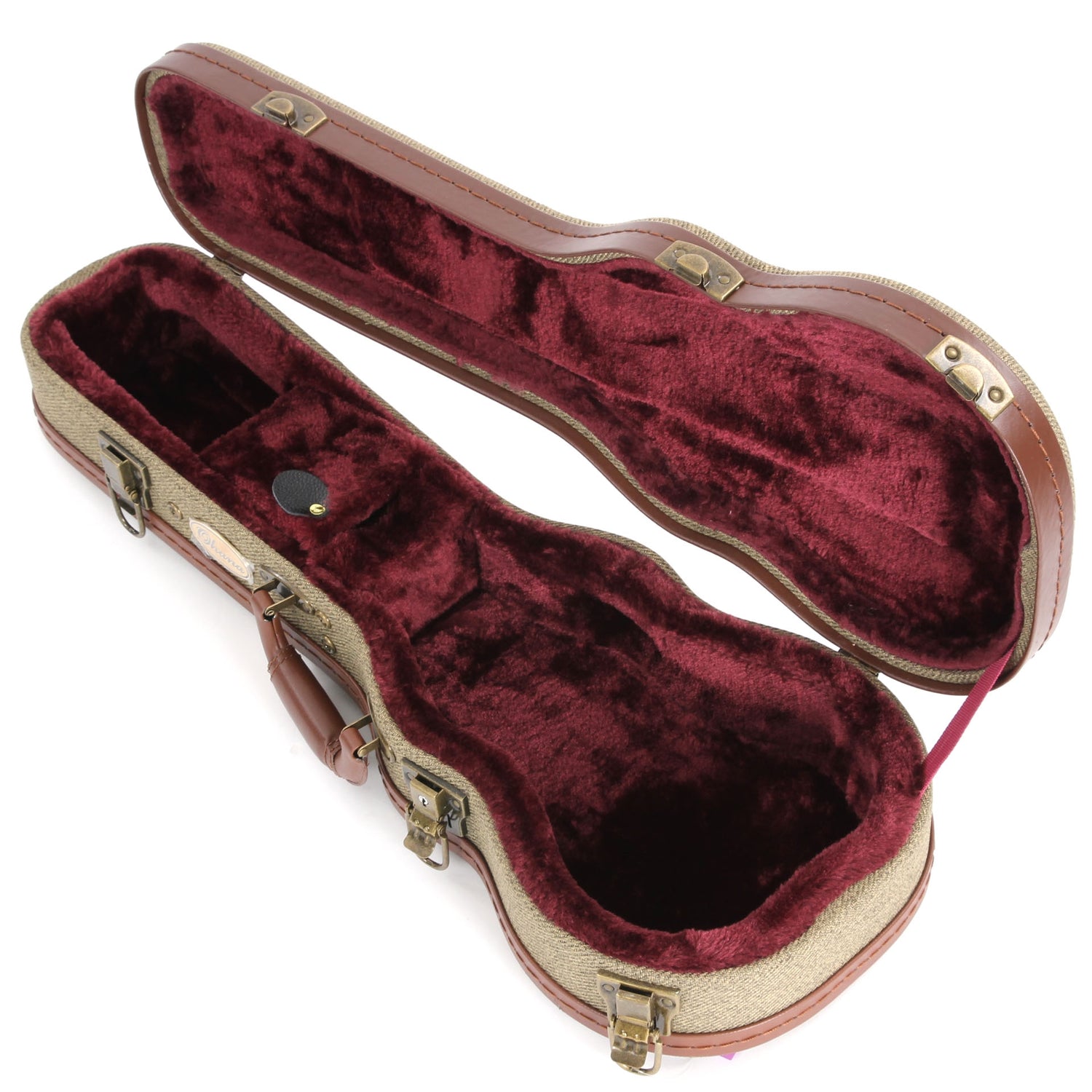 Seriously sophisticated protection for your prized ukulele. Tough olive twill fabric covering with faux leather trim and aged brass hardware. Burgundy plush lining adds to the look. Includes an interior storage compartment.