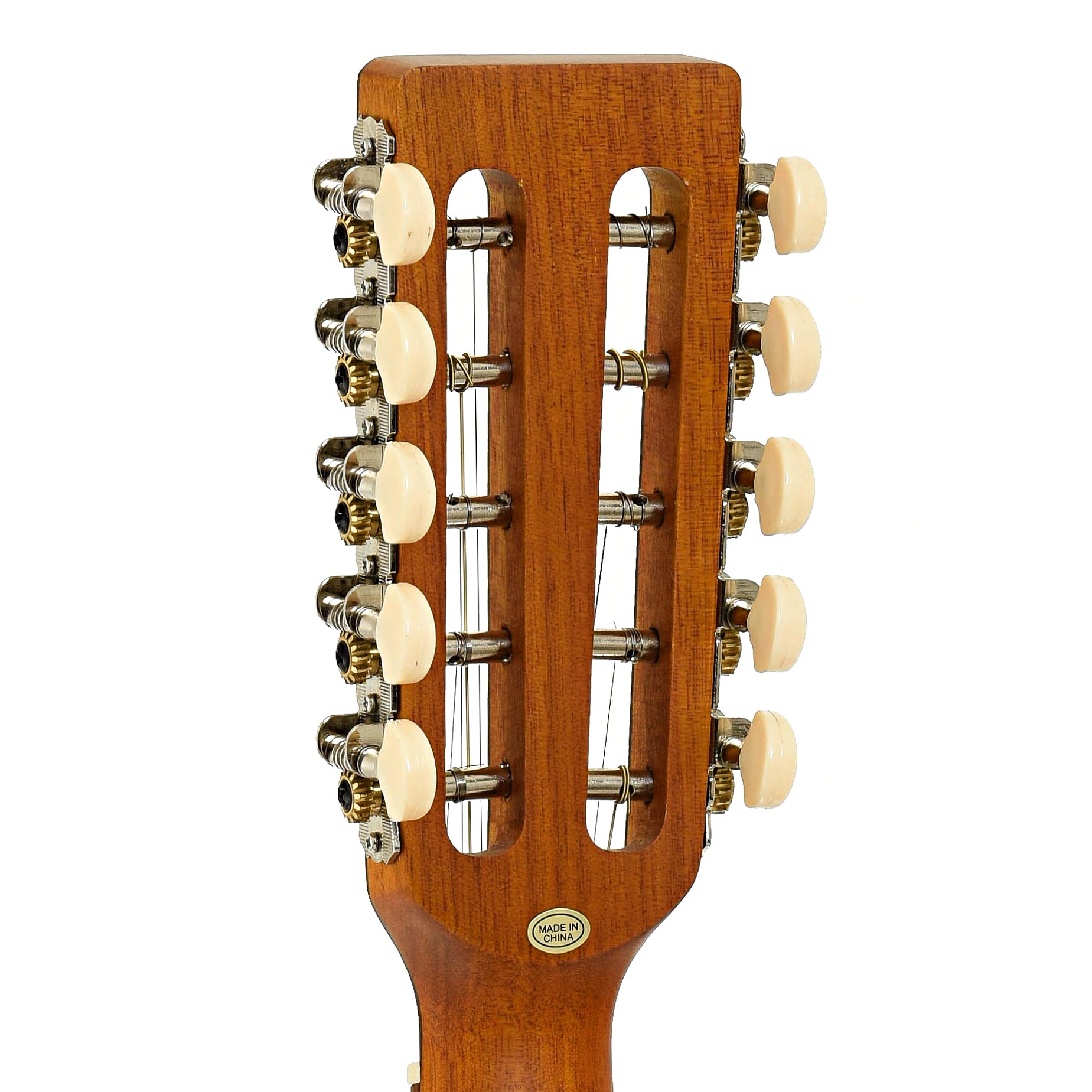 All solid mahogany top, back and sides. Body binding, Grover geared tuners. Satin finish. 10 steel strings in 4 courses (2-3-3-2), often tuned like a ukulele. Body is a bit deeper than a typical tenor uke, so most cases do not fit. The best bet are some gigbags.