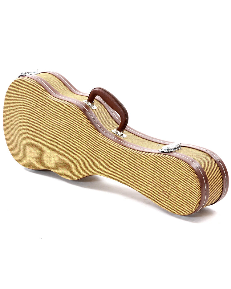 Super durable, strong wood case covered with tweed cloth and trimmed with leather-like vinyl. Ukulele shaped. Plush lined, brass hardware. Provides stylish ukulele protection.