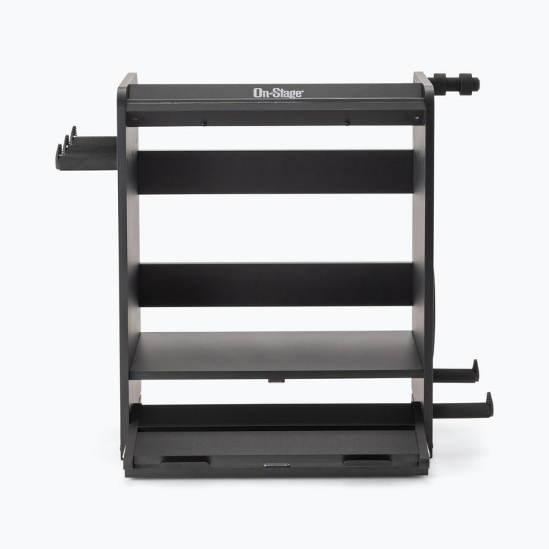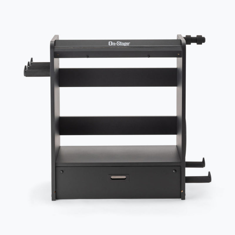 Keep all your guitar gear safely organized, on display, and ready to play with the GWS5000B Guitar Workstation. This multipurpose workstation is a combination amp stand, guitar stand, cable and strap hanger, pedalboard, and accessory tray rolled into one convenient and visually appealing package.