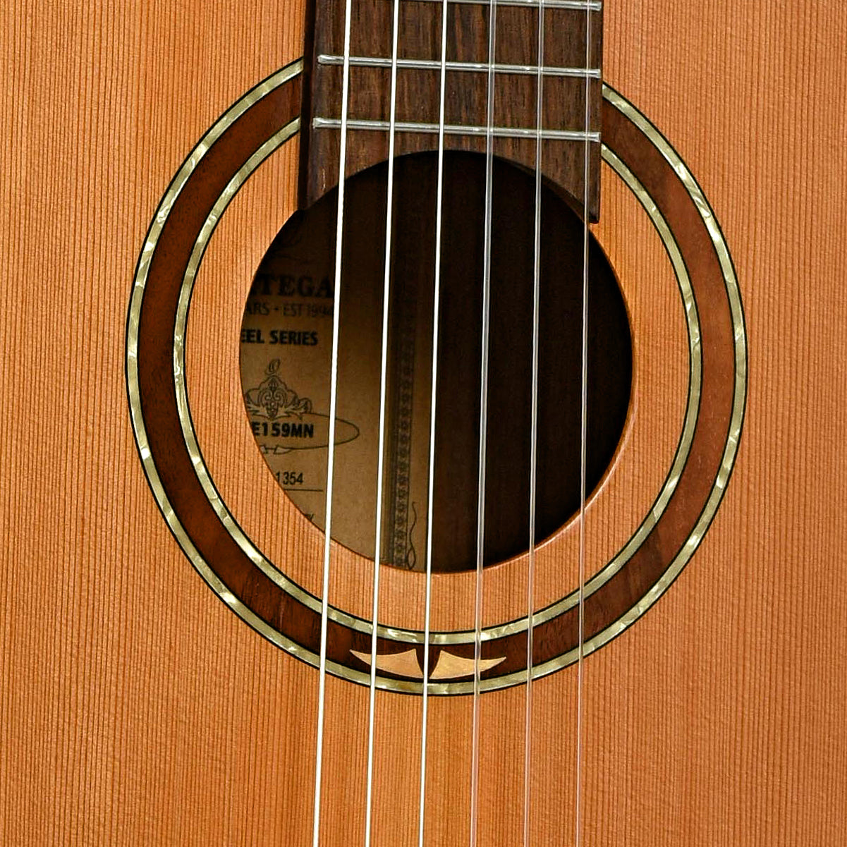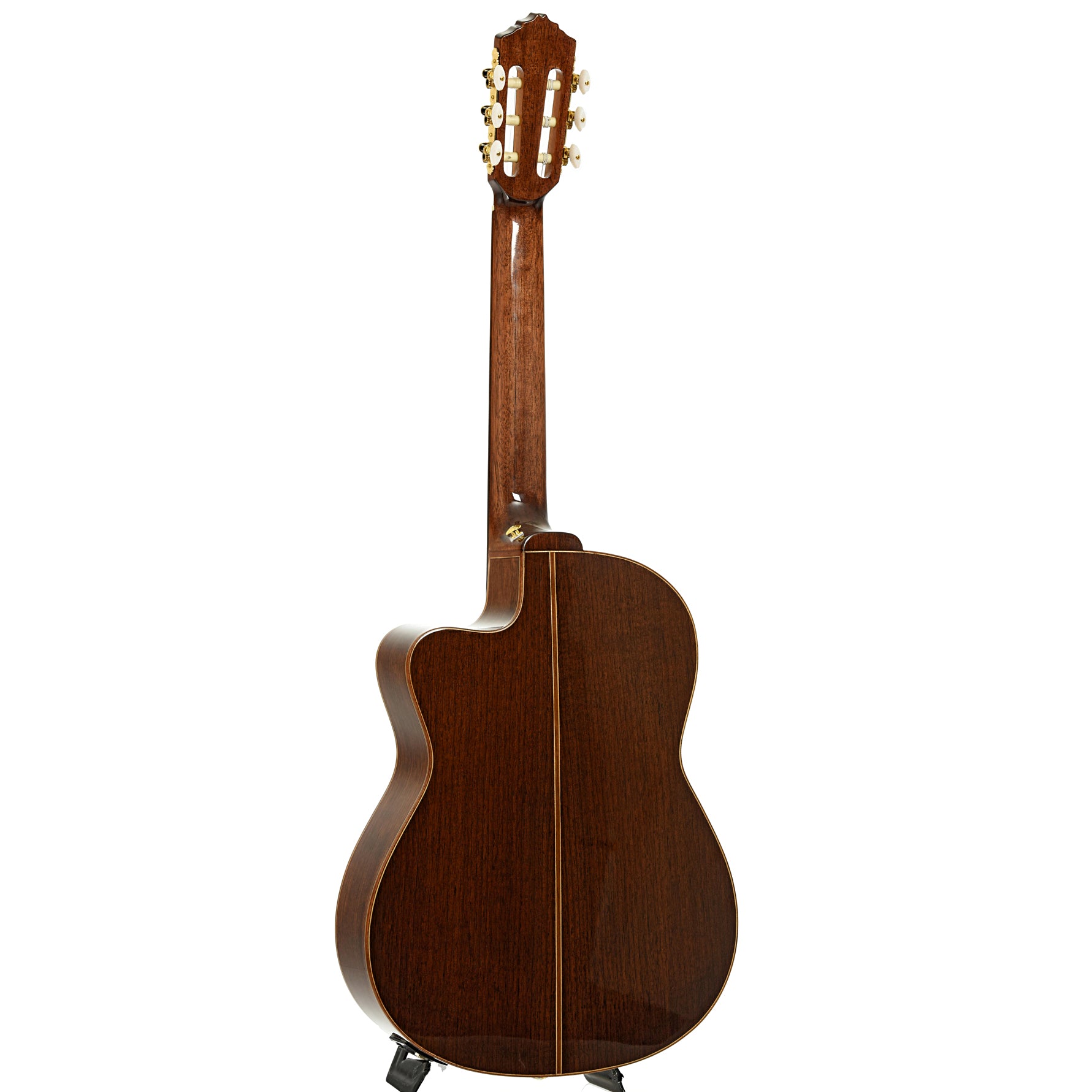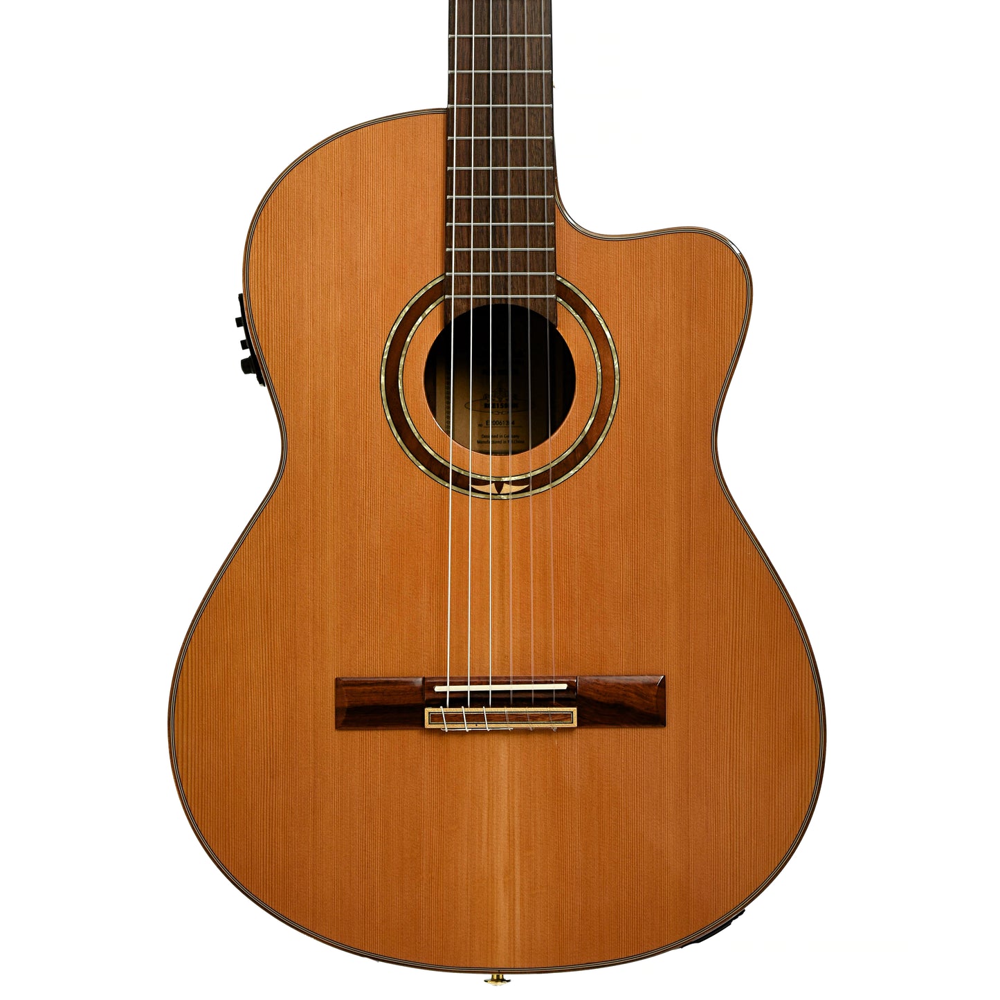 - W-m-w-m top purfling, walnut/maple/pearl rosette