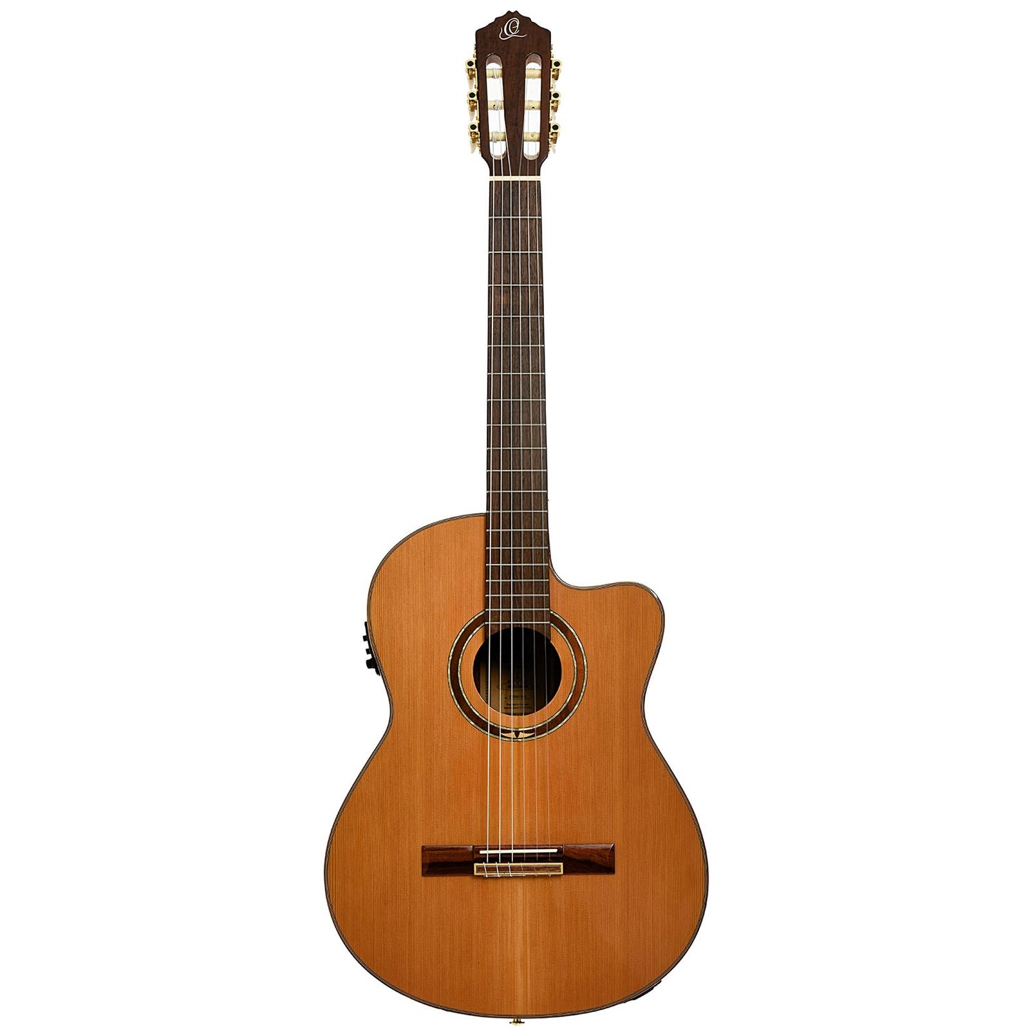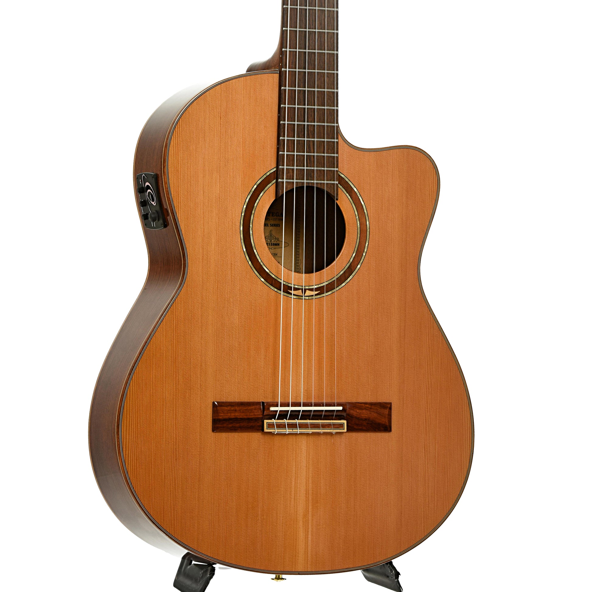 A modern classical with stage-ready features, this Ortega RCE159MN pairs a cedar top with walnut back and sides, a mahogany neck, and a laurel fingerboard and bridge. The cutaway design offers easy access to upper frets, and the MagusPro pickup system handles amplification. Includes original gigbag. Import.
