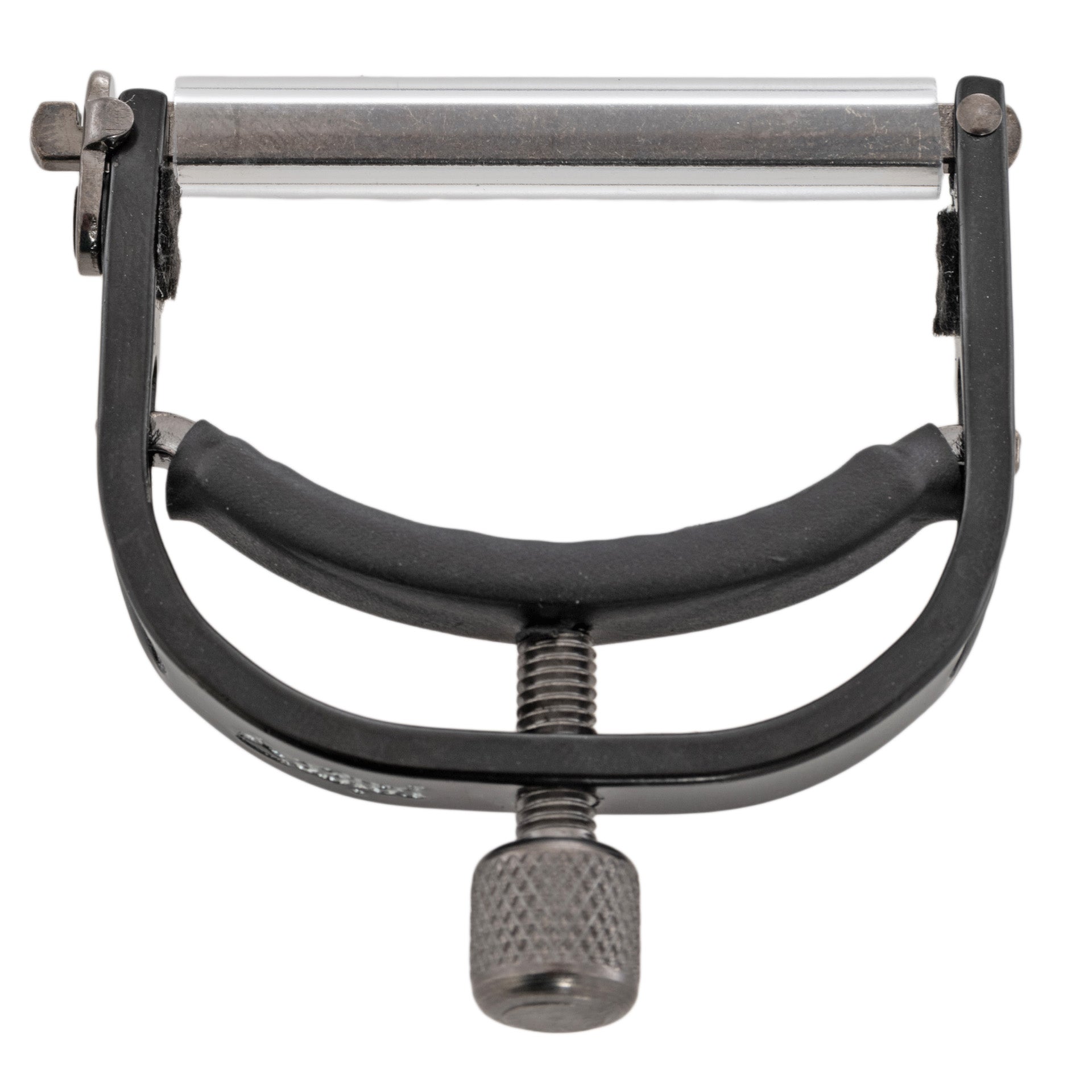 - Smokey Black anodized steel capo with locking crossbar and adjustable thumb screw