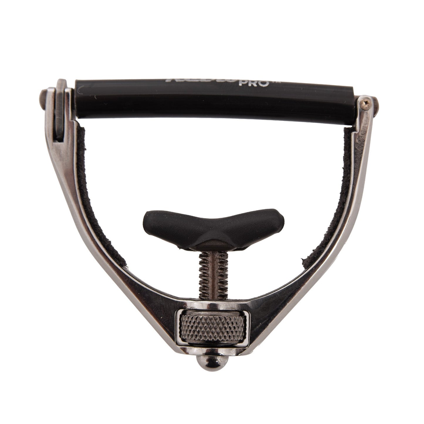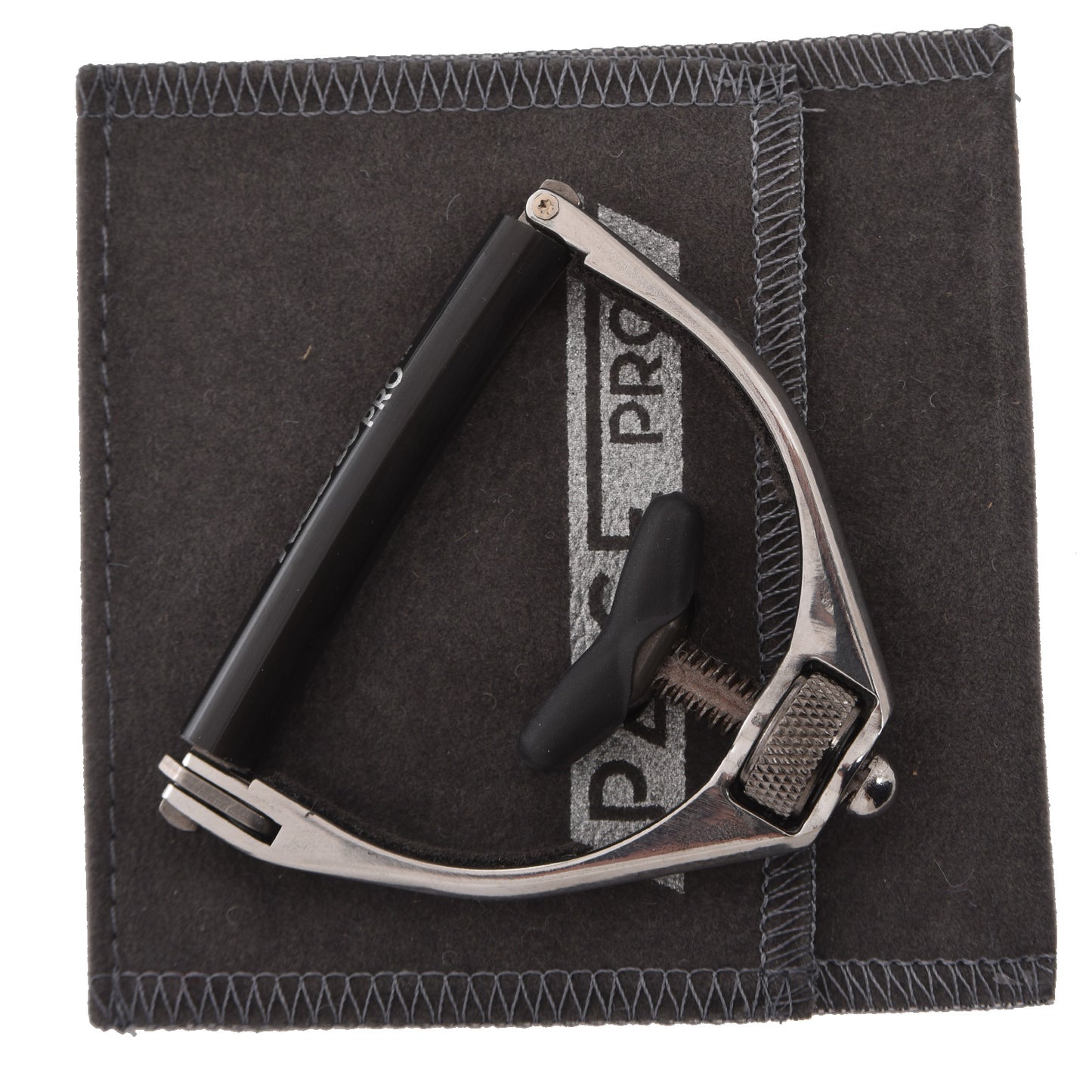 The Paige RetroPro capo is a sleek stainless steel acoustic guitar capo. Like all Paige capos, the crossbar is angled for good tone with light pressure. Less re-tuning! Stainless provides greater mass for best capoed tone. Stores behind nut when not in use. Made in USA.