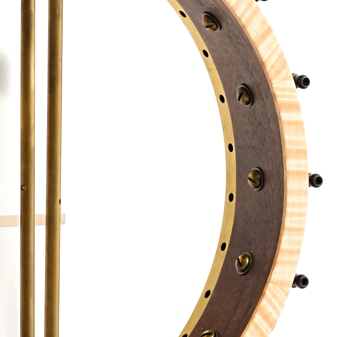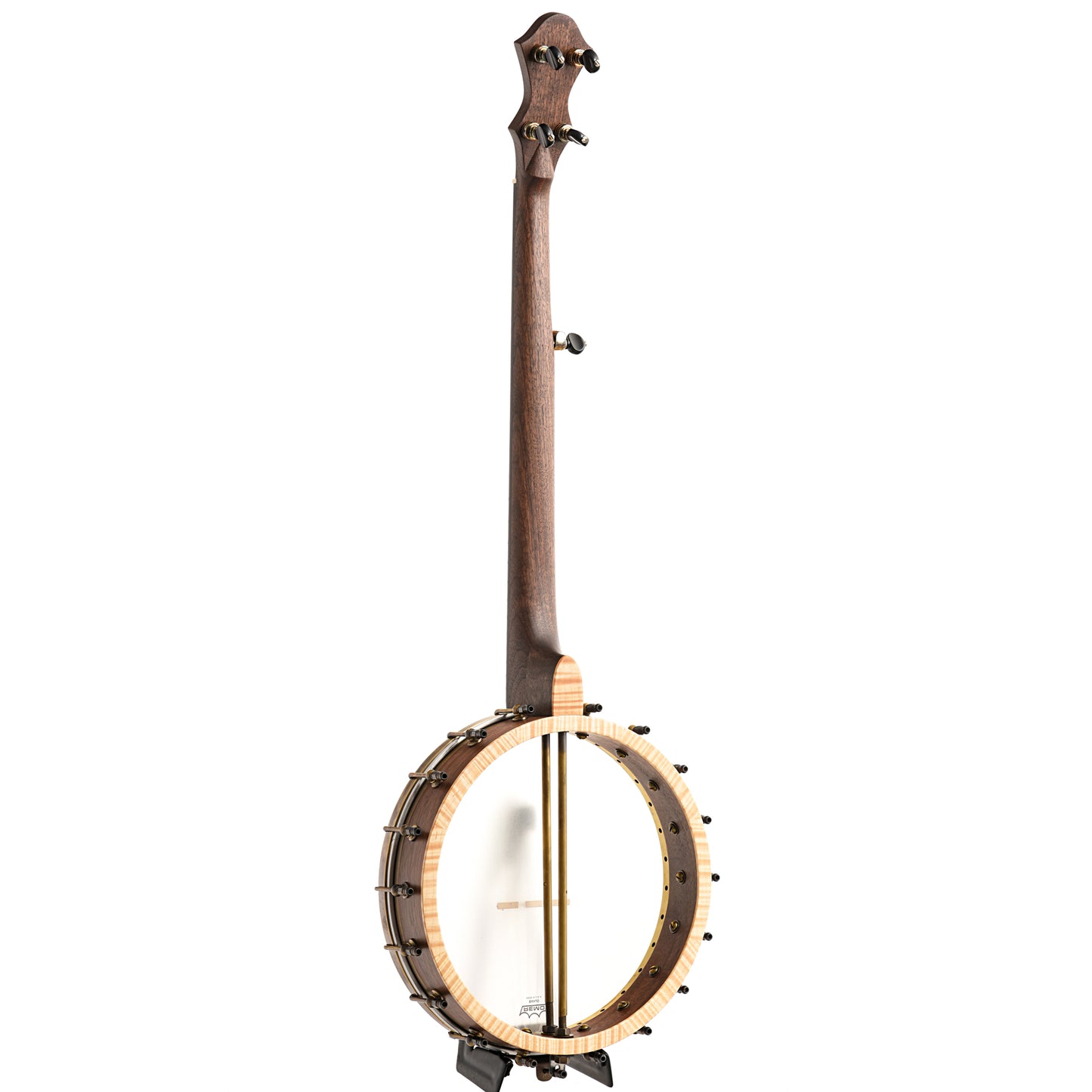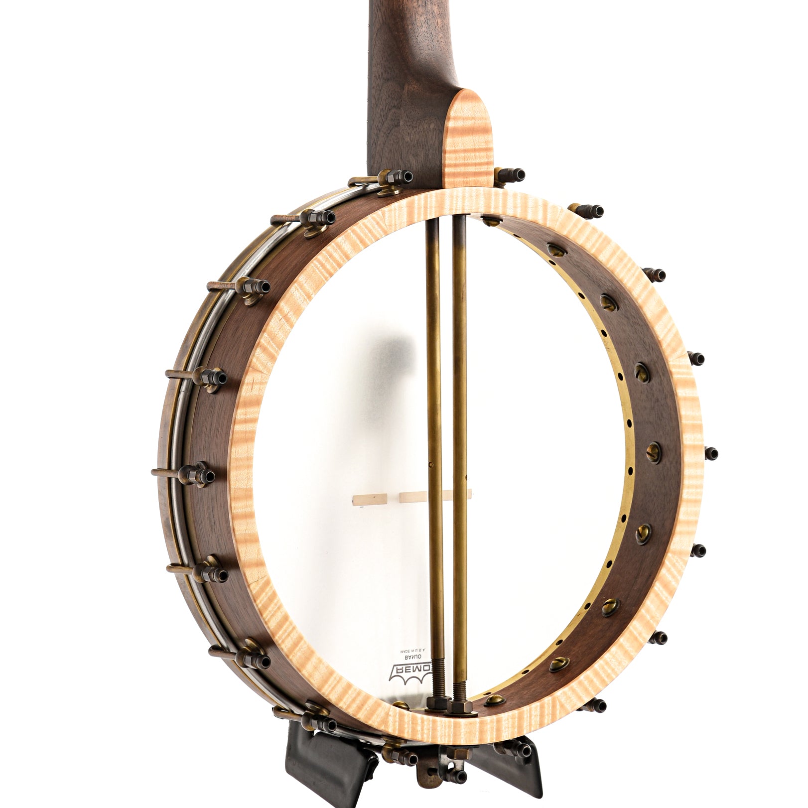 Beautiful dark walnut banjo with curly maple accents, antiqued hardware and a Tubaphone tone ring for huge sound! From Canadian luthier Ian Pattison