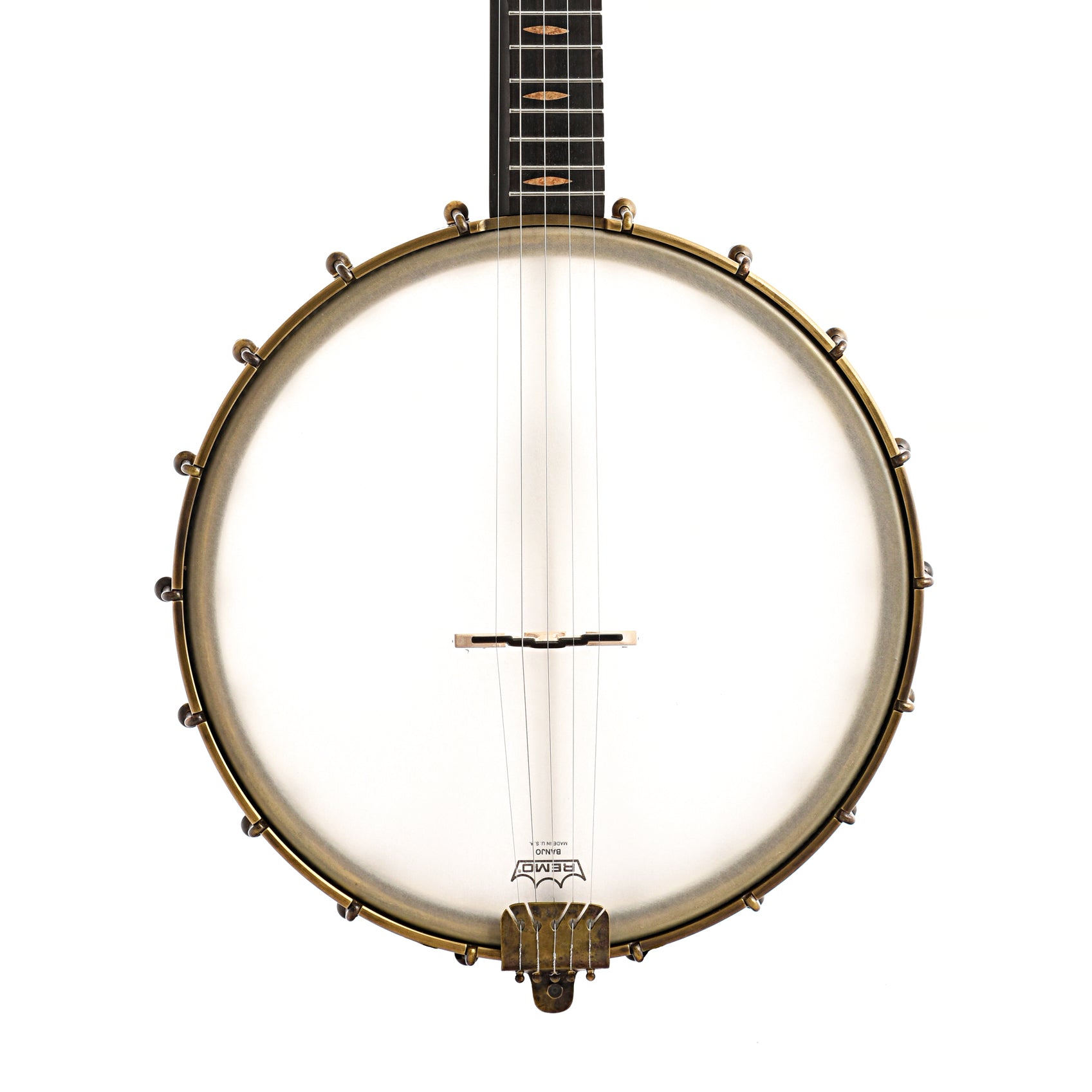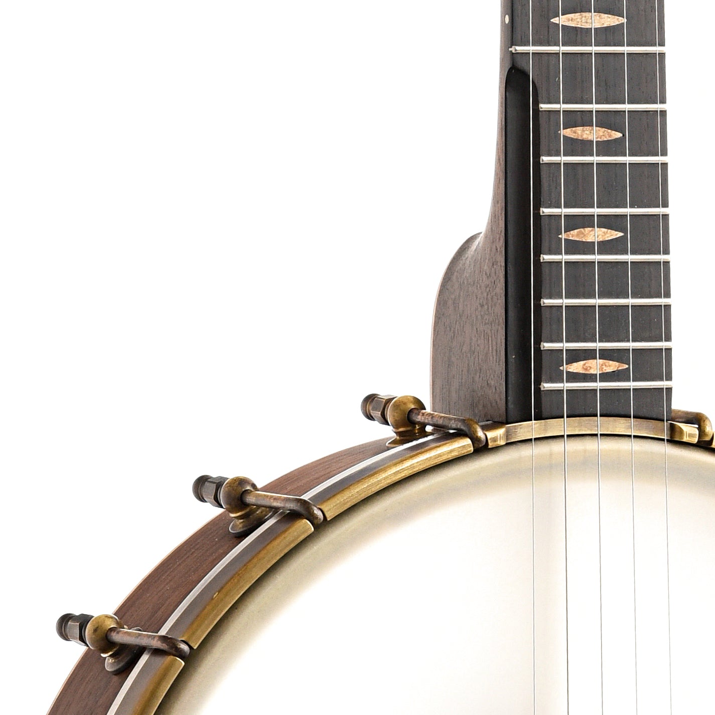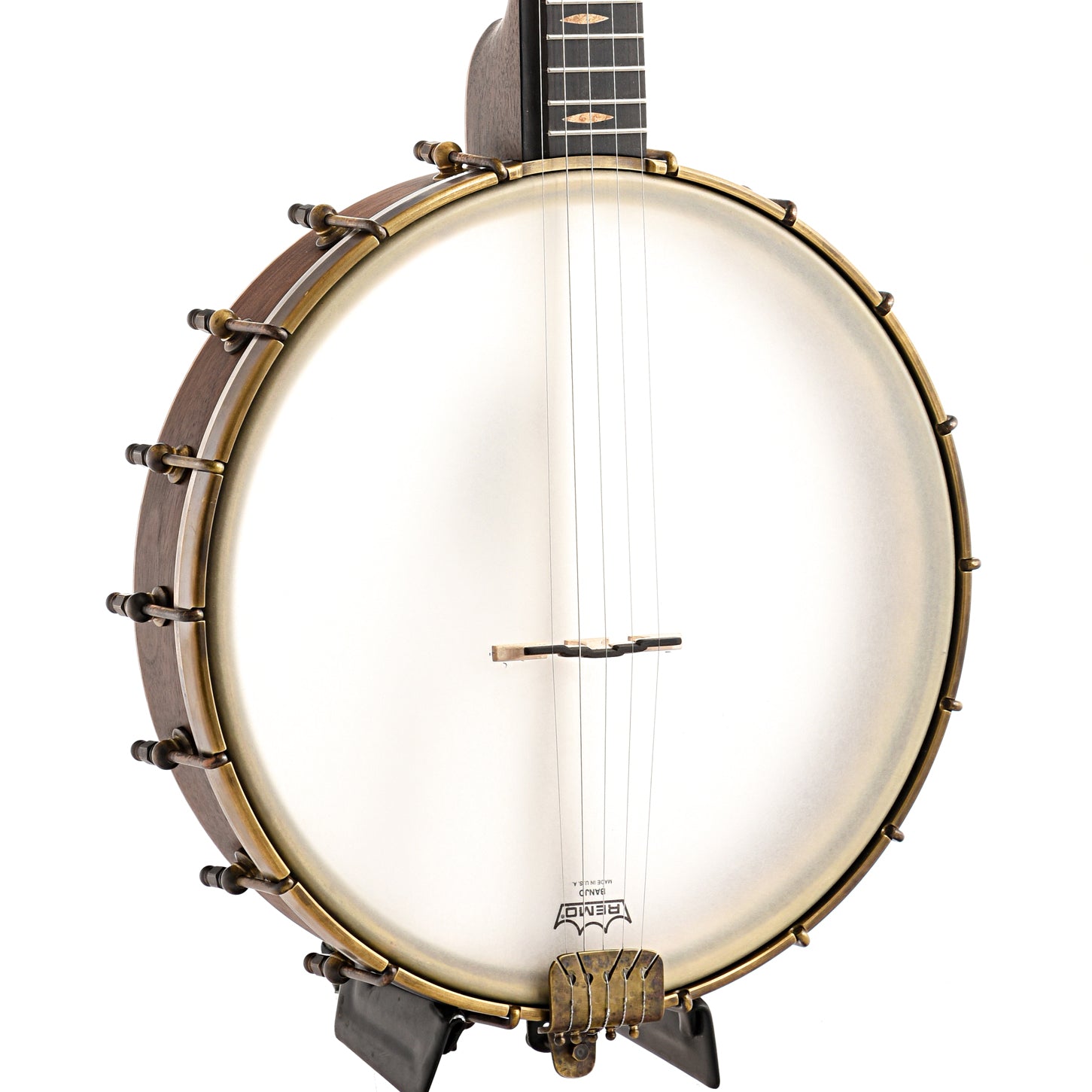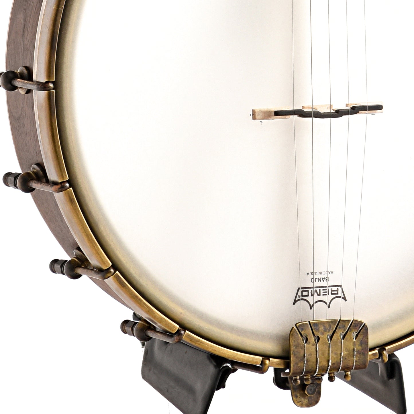 Beautiful dark walnut banjo with curly maple accents, antiqued hardware and a Tubaphone tone ring for huge sound! From Canadian luthier Ian Pattison