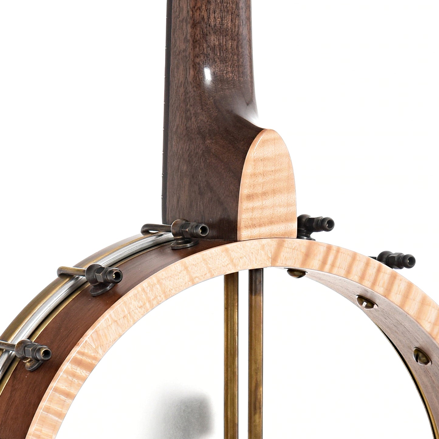 This Pattison 12" Whyte Laydie features a beautiful curly walnut neck and a walnut rim with curly maple rim cap. Sweet and deep tone is provided by the Whyte Laydie tone ring. Ebony fretboard with curly maple catseye inlays has a narrow scoop under the 5th string. Aged brass hardware completes the look. Handmade by Ian Pattison in Canada.