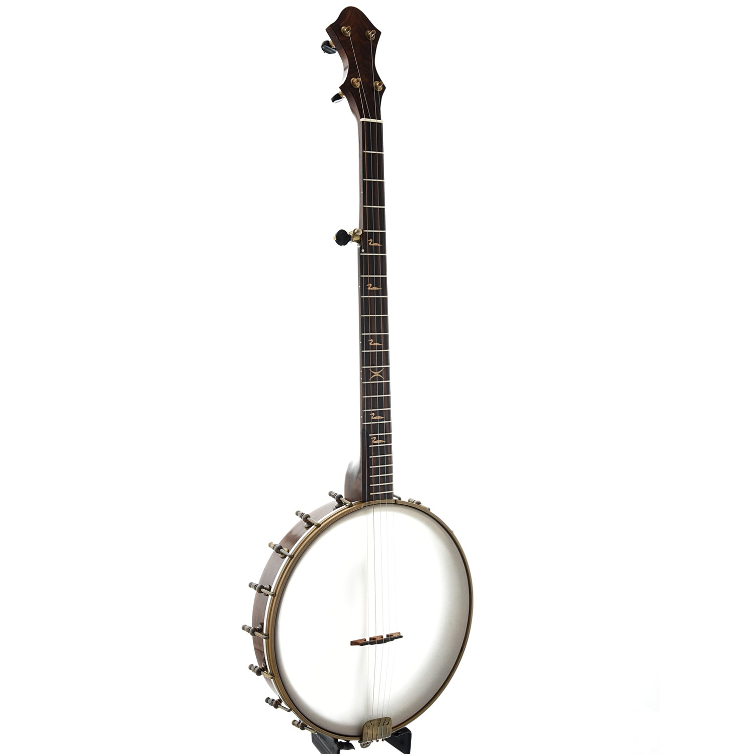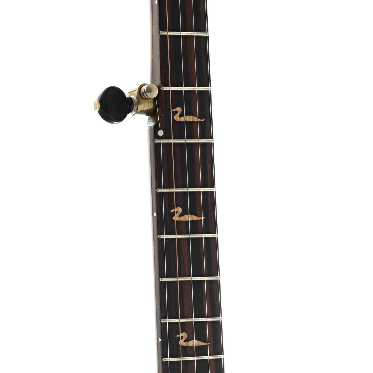 Another nice banjo from Canadian luthier Ian Pattison, this Mountain Loon openback banjo features a maple neck and rim with walnut headplate, heel and rim caps. It has a tone ring of “coyote wood”, aka Macauba, a dense South American hardwood. The striped ebony fingerboard features loon pattern maple inlays. Great for old time playing and much more.