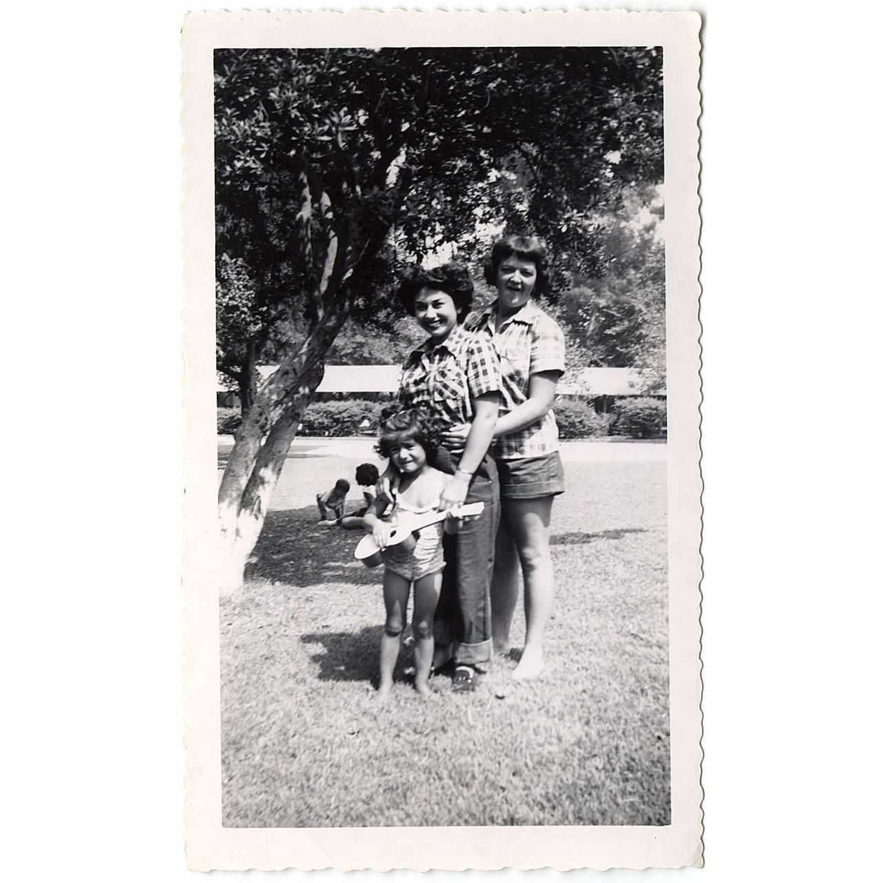 VGC+, vintage b/w snapshot of two women and a little girl posing under a tree, with the little girl holding a soprano ukulele. (It might be a plasic Maccaferri, but the top is washed out by the bright sunlight and it's kind of hard to tell.) Photo measures 3-1/2" x 5-3/4".