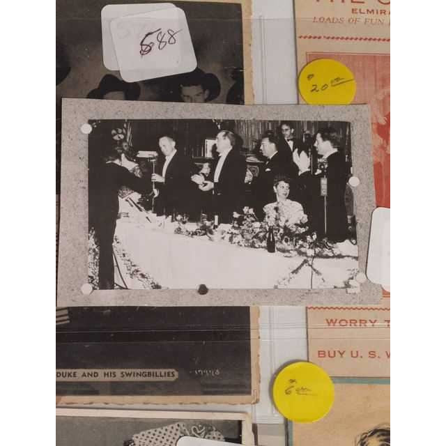 VGC, 4" x 2-5/8", tuxedoed men and dressed up woman at the dais with a white violin-looking object on the table, and 3 NBC microphones in evidence. Who are these people?