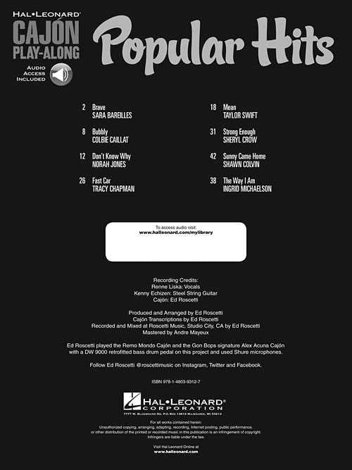 Book with online audio. If you want to hone your skills accompanying guitar and vocals on the cajon, this book will help. Listen to the professionally-recorded demonstration tracks to hear how the cajon should sound, then play along with the separate backing tracks. Includes online access to the audio tracks, for download or streaming. "Brave," "Bubbly," "Don't Know Why," "Fast Car," "Mean," "Strong Enough," "Sunny Came Home" and "The Way I Am." Easy drum notation (Tip, Tone, Bass), plus melody in notation with lyrics and chord symbols. 48 pp.