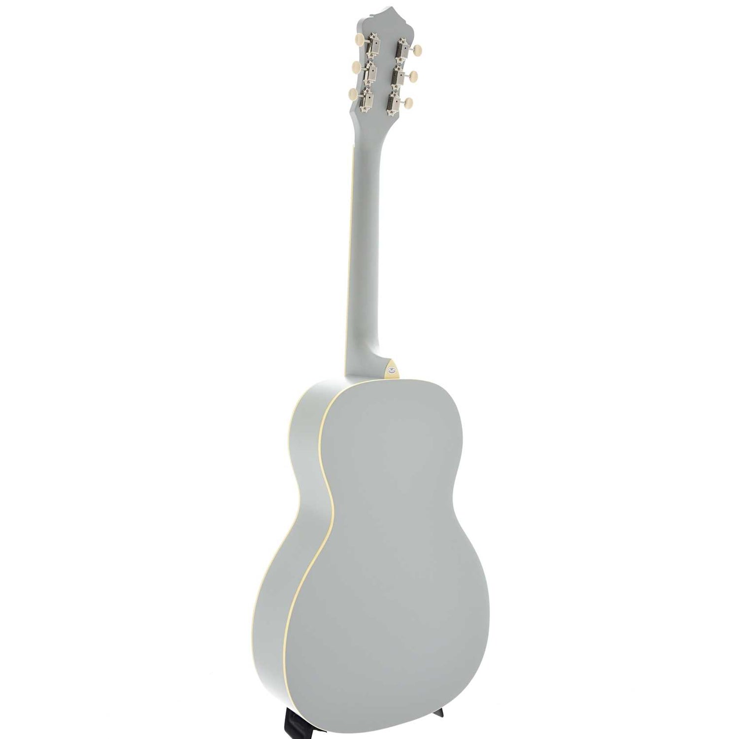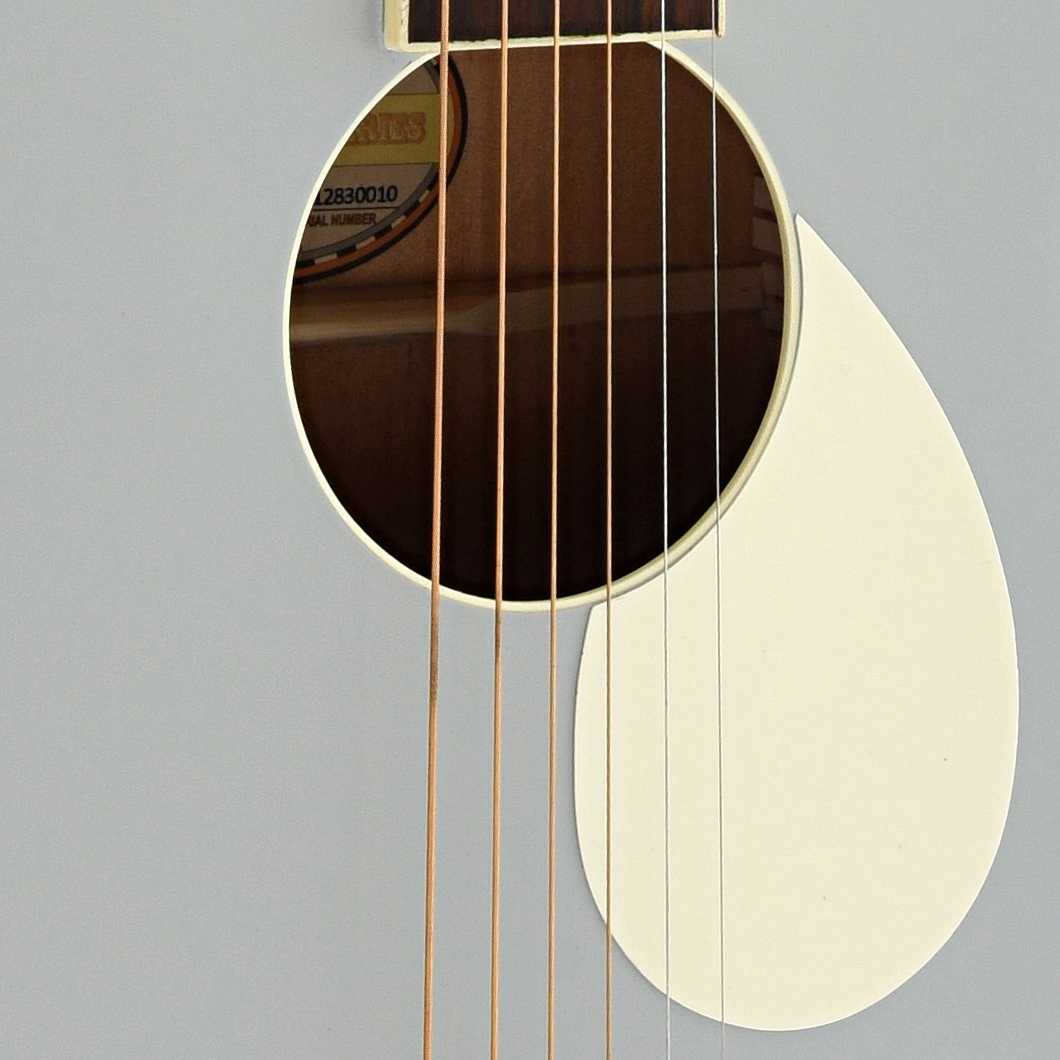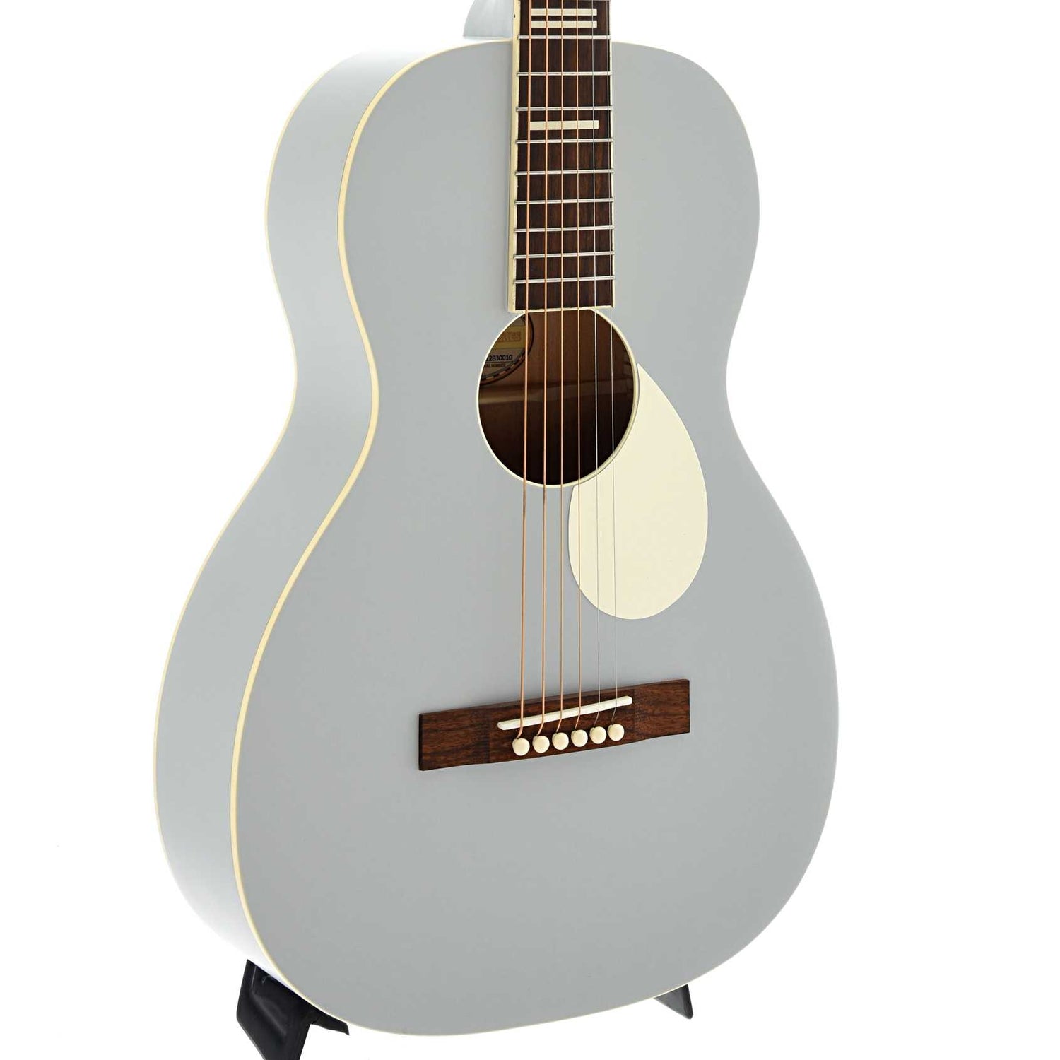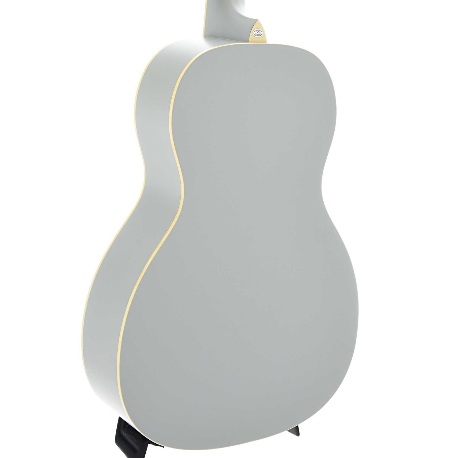 Another flavor of finish for the Dirty 30's Series 7 0-size guitar. The checkerboard purfling is removed, and an ivory teardrop pickguard is added. Also features a satin gray finish and ivory body binding and pickguard.