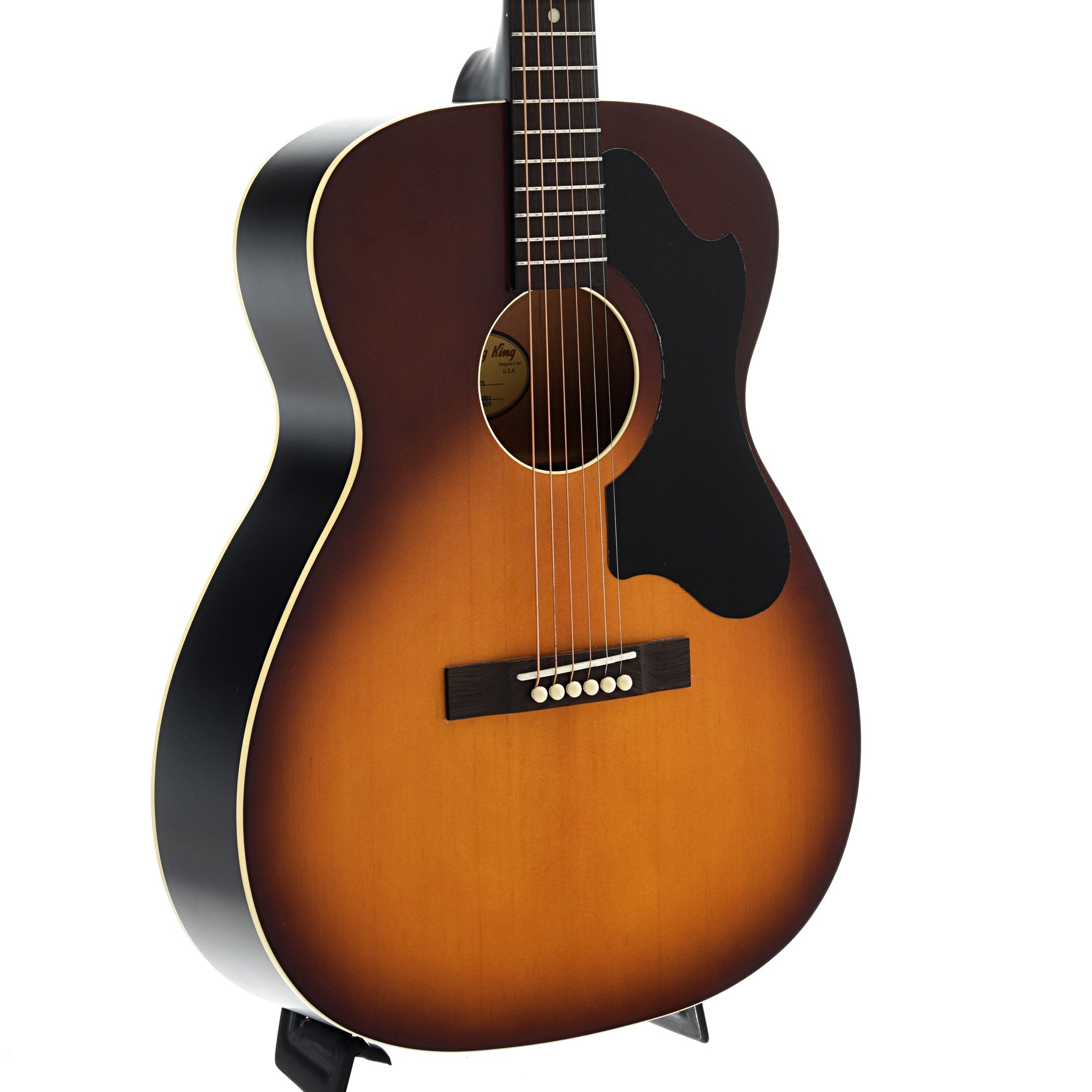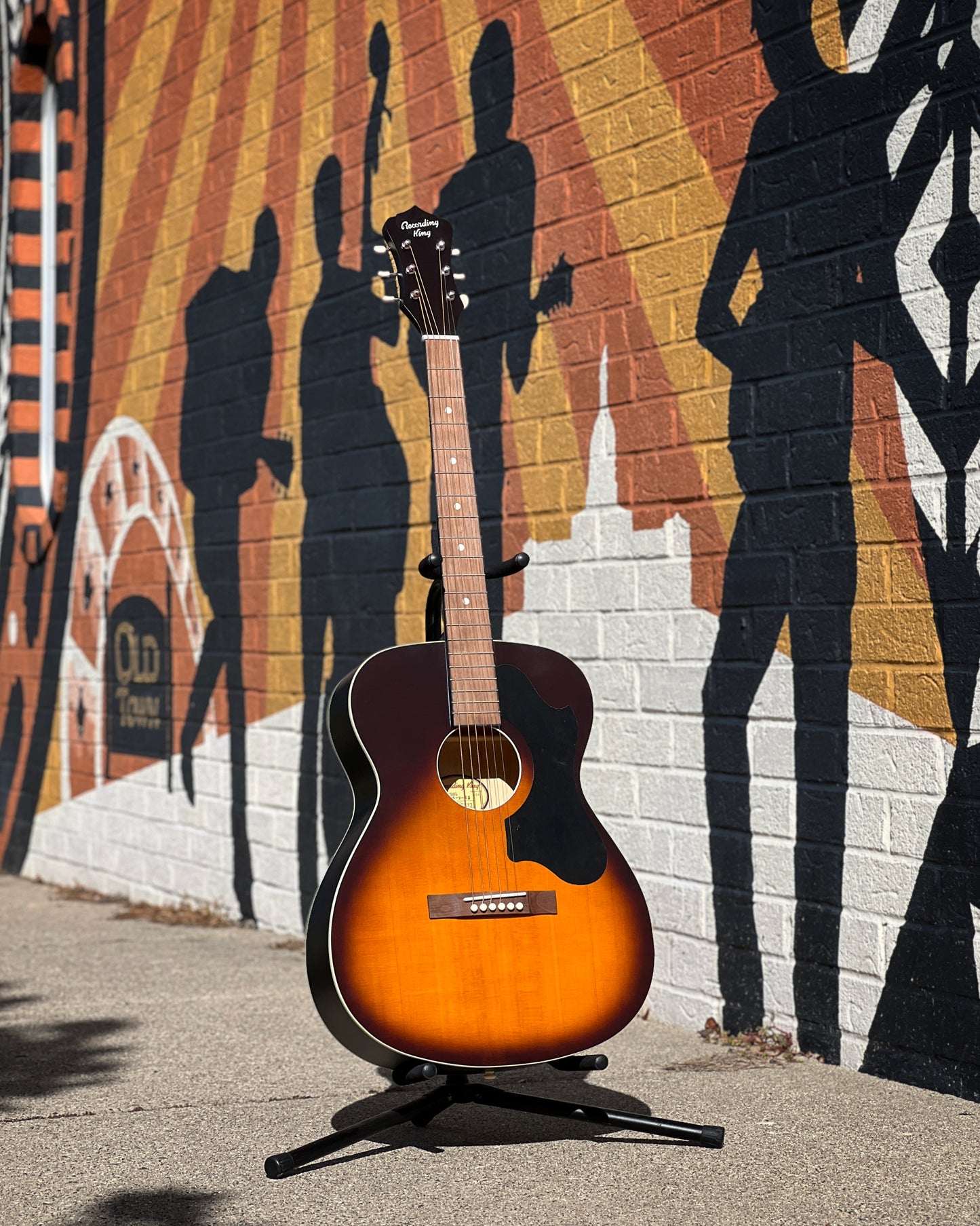 The Recording King Dirty 30s Series 9 000 is nice, straight-ahead solid top guitar. Combine this with a sweet tobacco sunburst finish, bone nut & saddle, and large dot fret markers for that '30's vibe. With a solid spruce top for good tone, it's a great guitar for beginners, or for that quality "second" guitar.