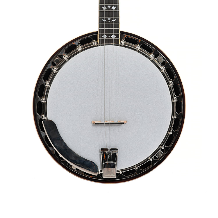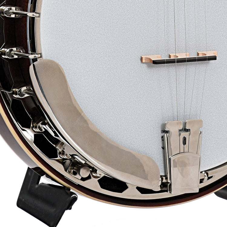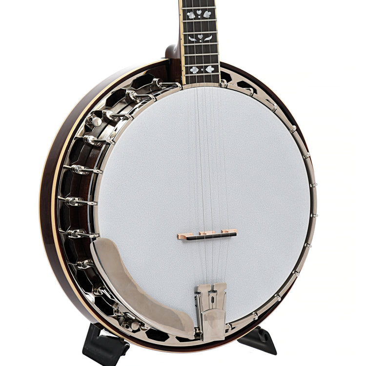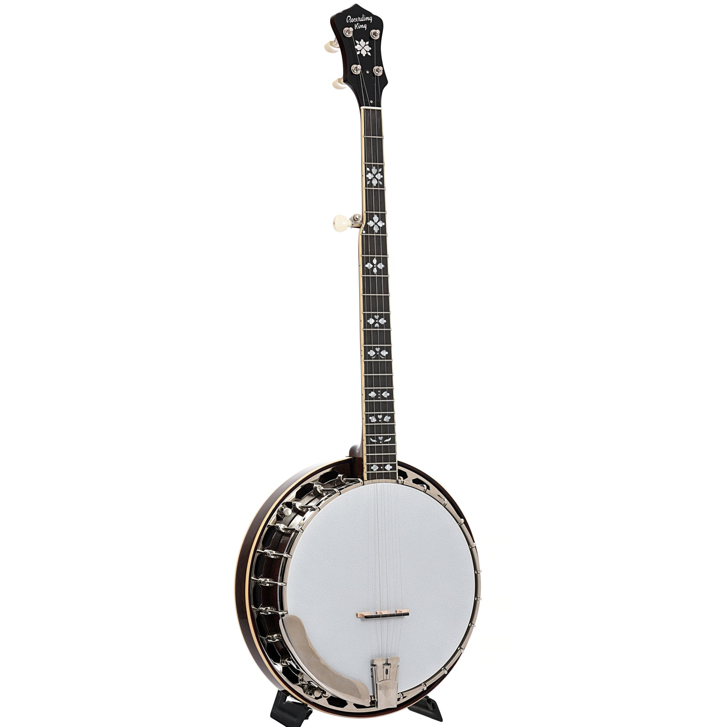 Interesting entry level banjo, the Recording King Songster offers classic resonator banjo design with a simple brass hoop tone ring and handsome appointments.
