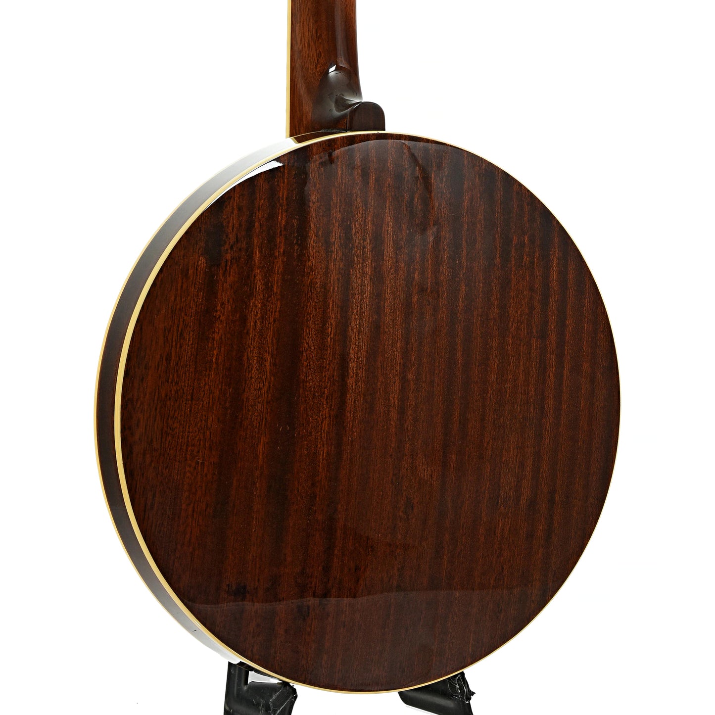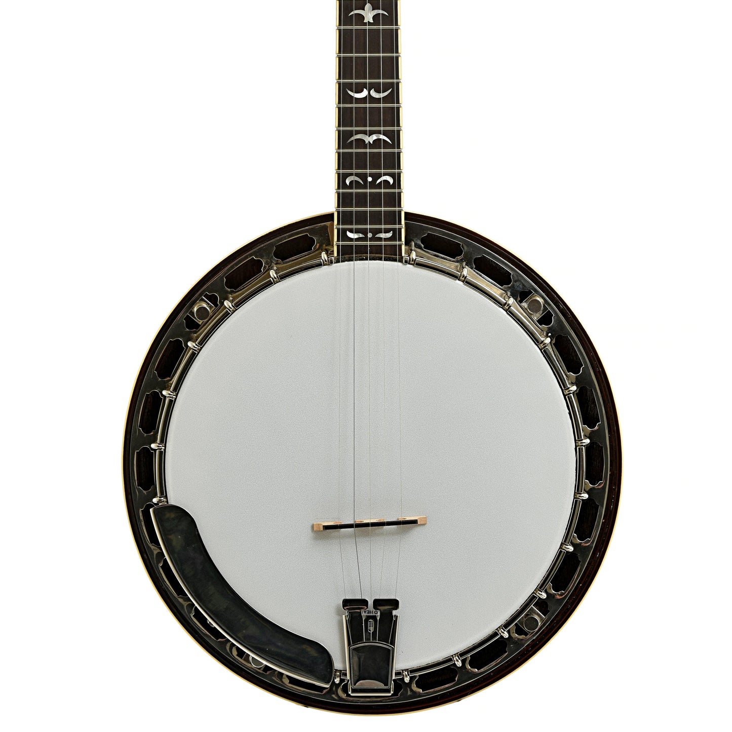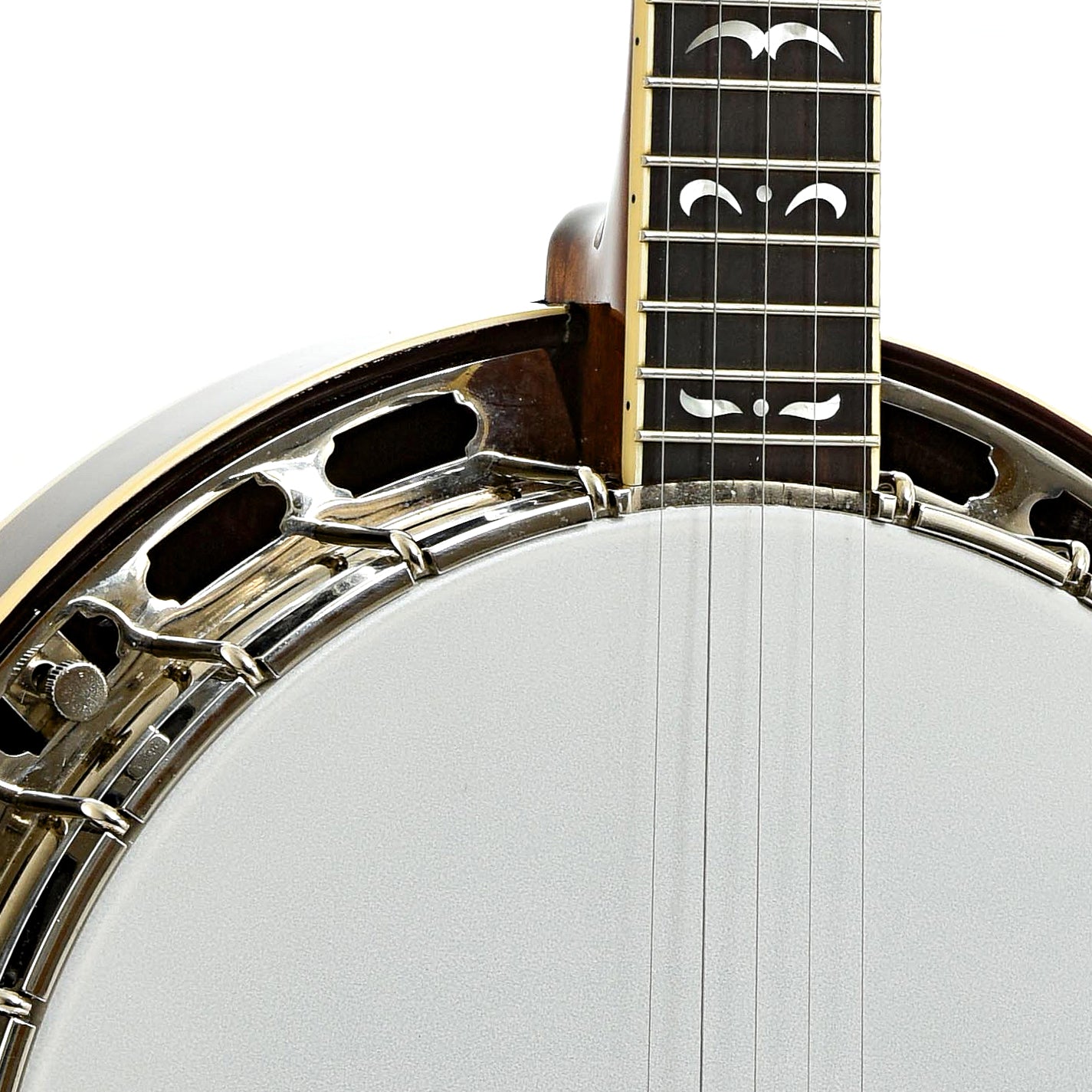 This affordable and high-quality RK Madison Deluxe resonator banjo features a flathead tone ring, one-piece flange, mahogany neck, double-bound resonator, and maple rim. Equipped with Planetary tuners and a geared 5th string, it delivers impressive tone and value. The headstock has been repaired by our shop. Includes hard shell case.