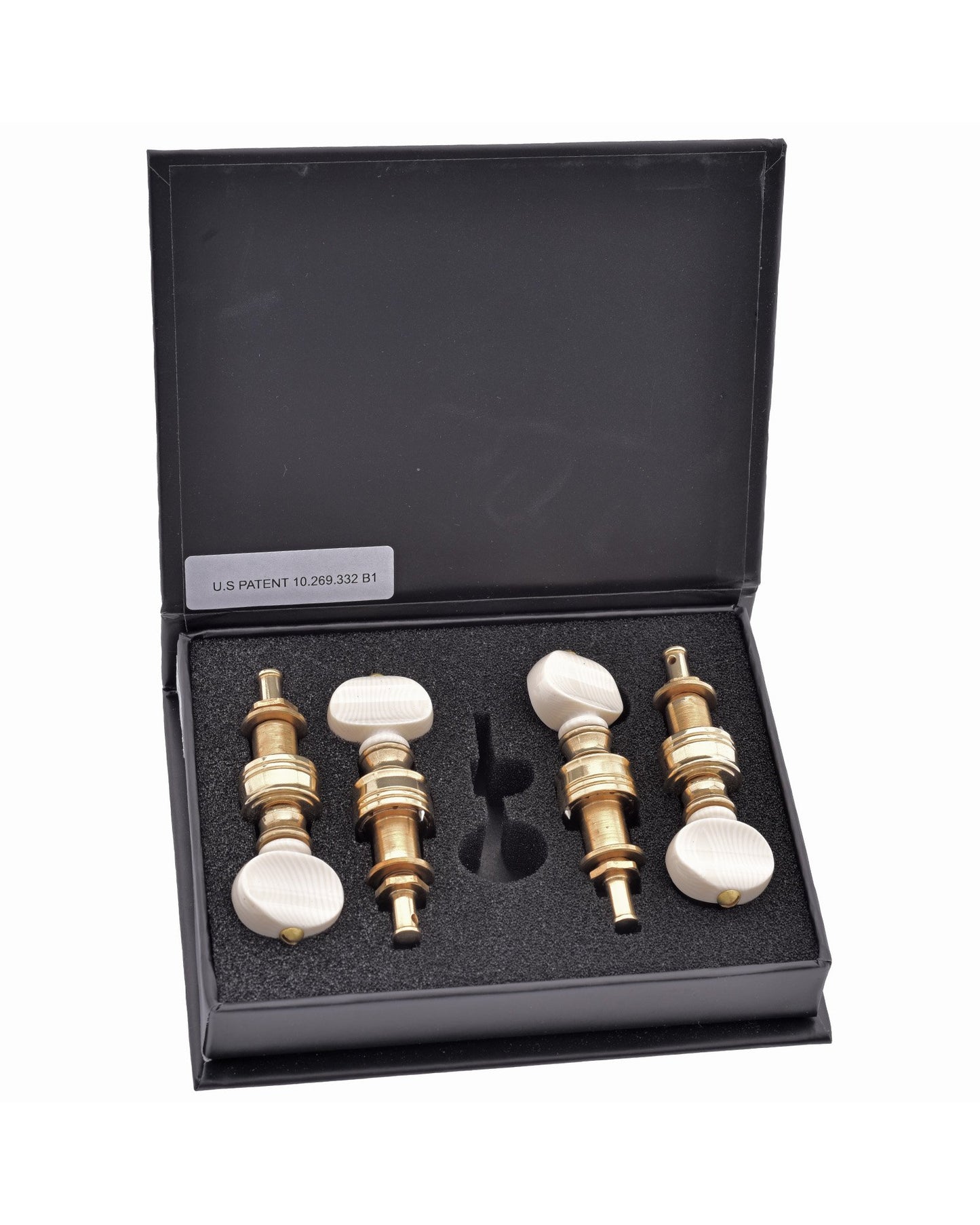 New cycloidal gear design for precision tuning. 10:1 gear ratio (vs 4:1 on standard planetary gears). Fits standard 3/8" diameter peghead hole. Raw brass with ivoroid button. (Ivoroid is also known as Galalith)