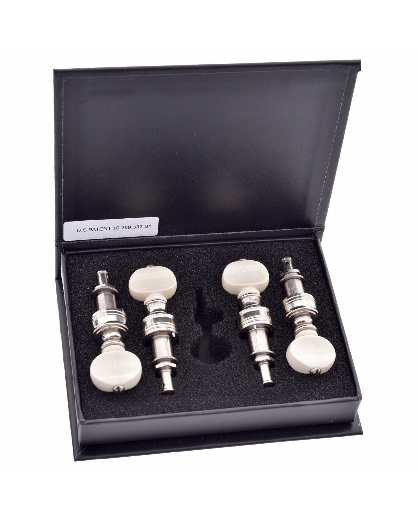 New cycloidal gear design for precision tuning. 10:1 gear ratio (vs 4:1 on standard planetary gears). Fits standard 3/8" diameter peghead hole. Nickel plated brass with ivoroid button. (Ivoroid is also known as Galalith)
