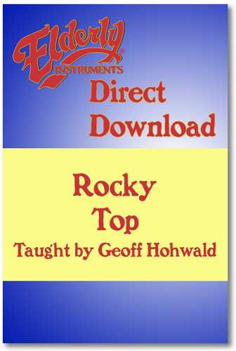 DOWNLOAD ONLY. This title is available as a DOWNLOAD ONLY. Just click one of the links below or open your Elderly Express Downloads catalog and have it delivered straight to your computer! This video teaches "Rocky Top" for bluegrass banjo. Breaks the song down into small easy-to-learn segments which are demonstrated at several speeds. Includes a PDF file with tab for the song and four audio jam tracks that play at 50, 72, 86 and 104 beats per minute. Intermediate.