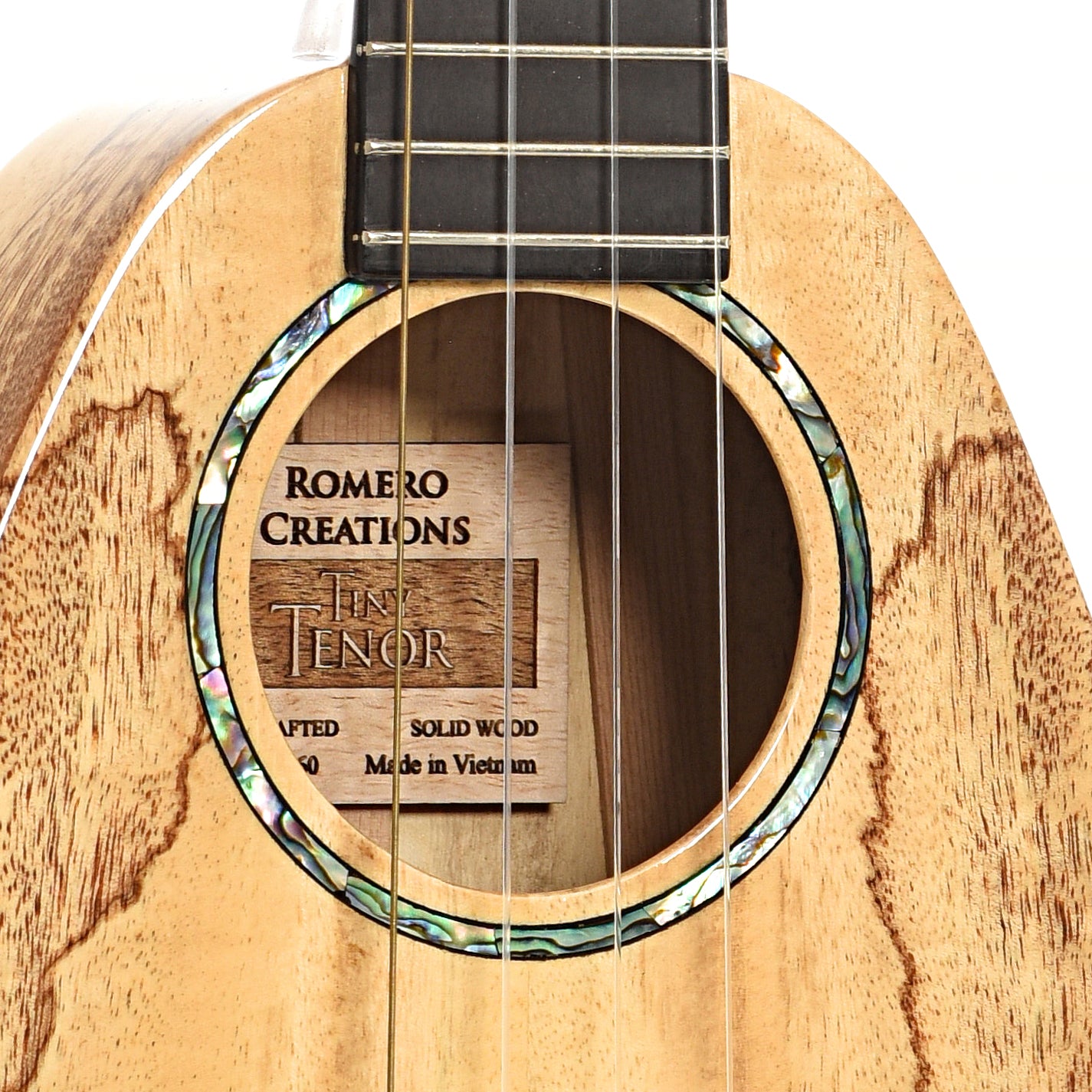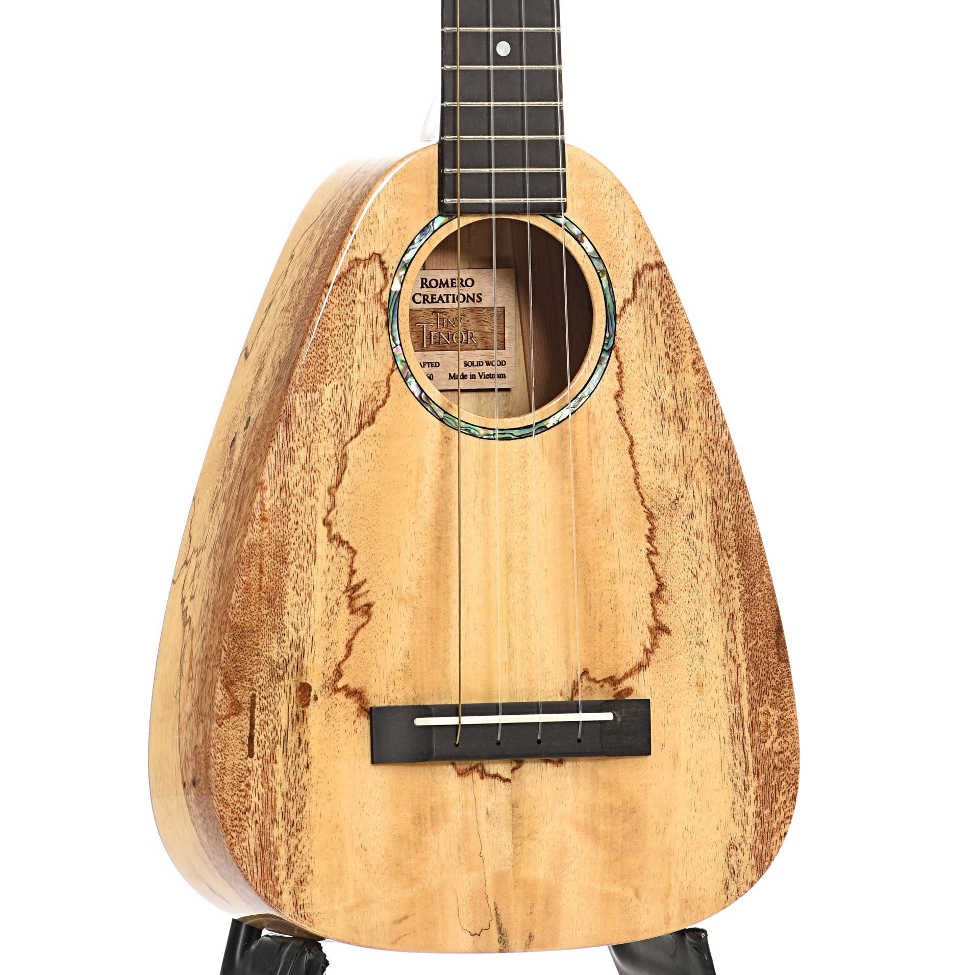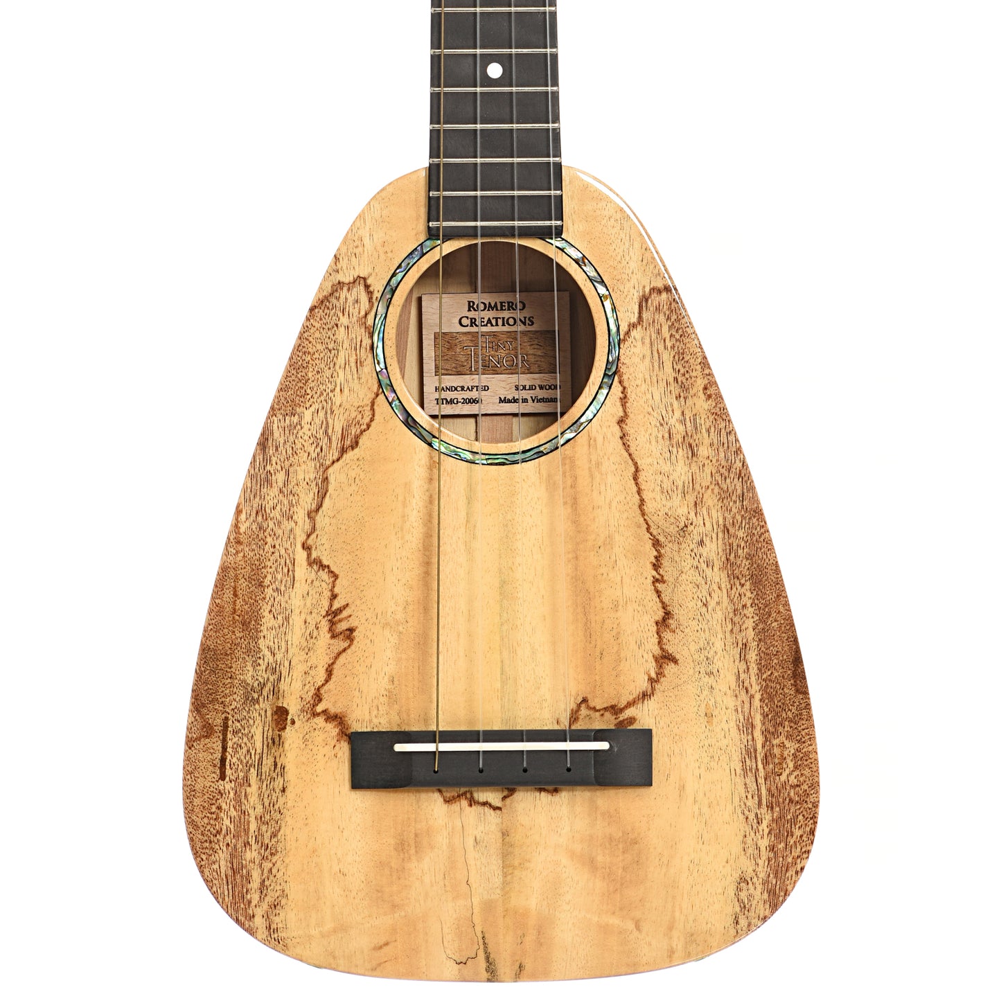 The Romero Creations Tiny Tenor is a tenor scale uke with the body length of a concert. Endorsed by Daniel Ho. Handcrafted of all solid spalted mango with abalone/pearl appointments. Original gigbag. Import.