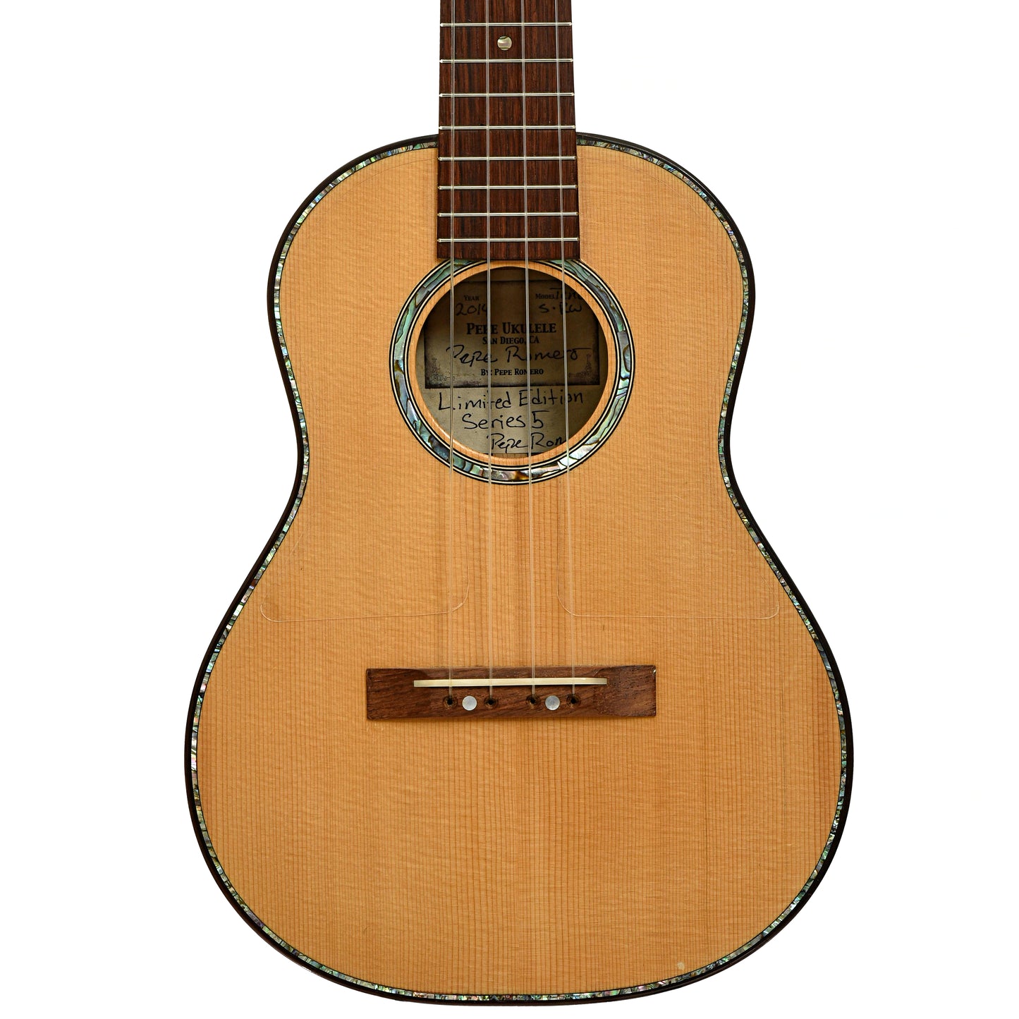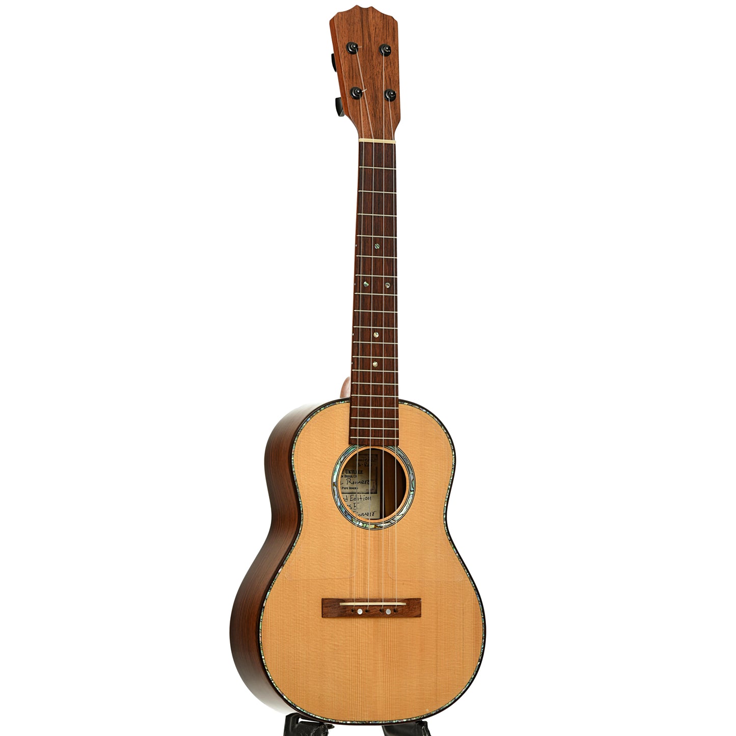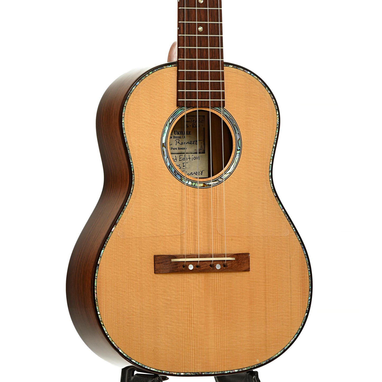 An excellent tenor uke build by Pepe Romero Jr., this limited edition features tonewoods of spruce top and highly figured rosewood back and sides, with a rosewood fingerboard on a mahogany neck. Appointments of abalone rosette and purflings, Gotoh planetary tuners and a clear double pickguard. Warm tones all day! Blue twill thermoplastic hard shell case. Handcrafted in San Diego, USA. On consignment.
