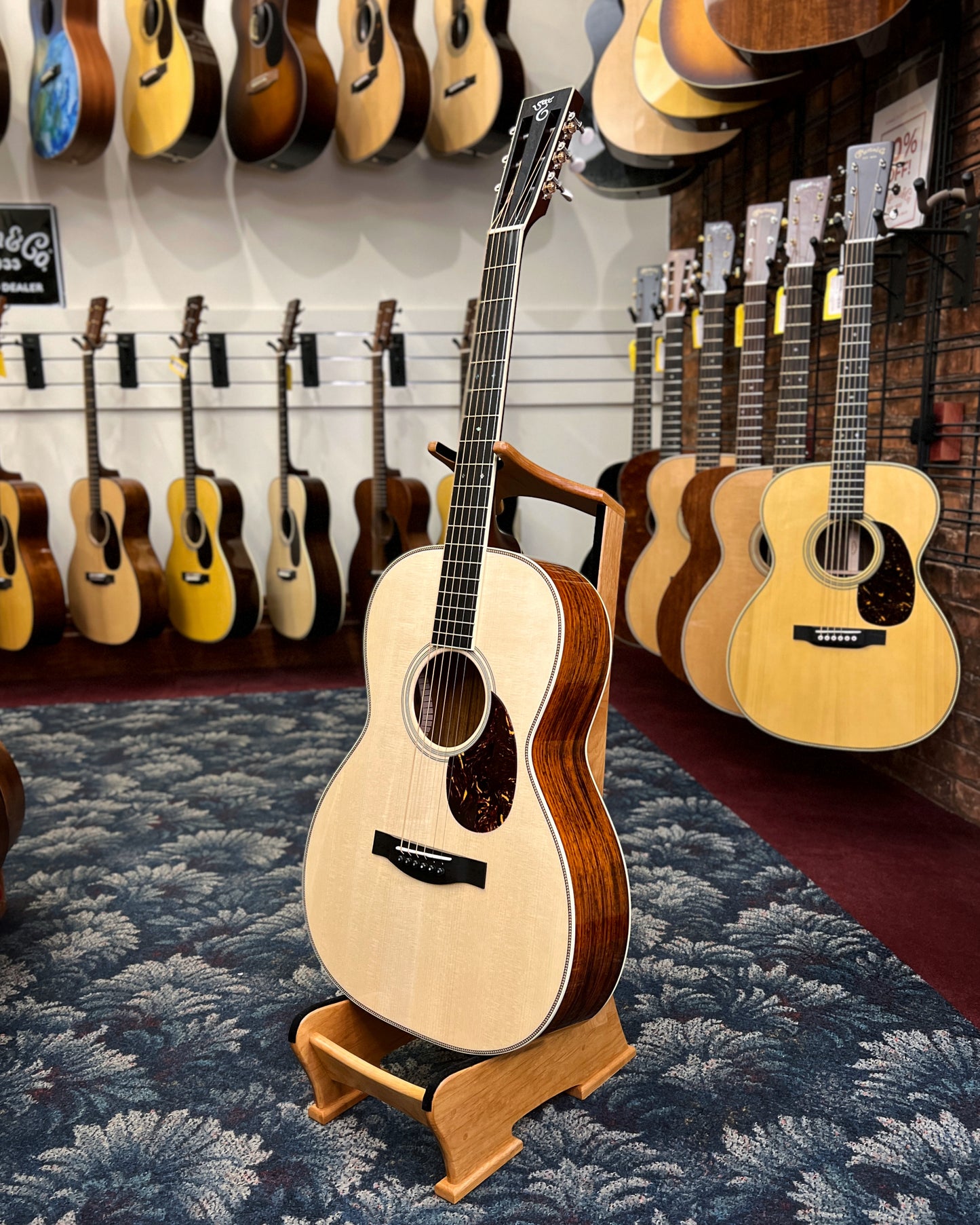 A fingerstyle player's dream! This Santa Cruz Custom 000 features a solid Adirondack spruce top, cocobolo back and sides, and Adirondack spruce bracing attached with hot hide glue.